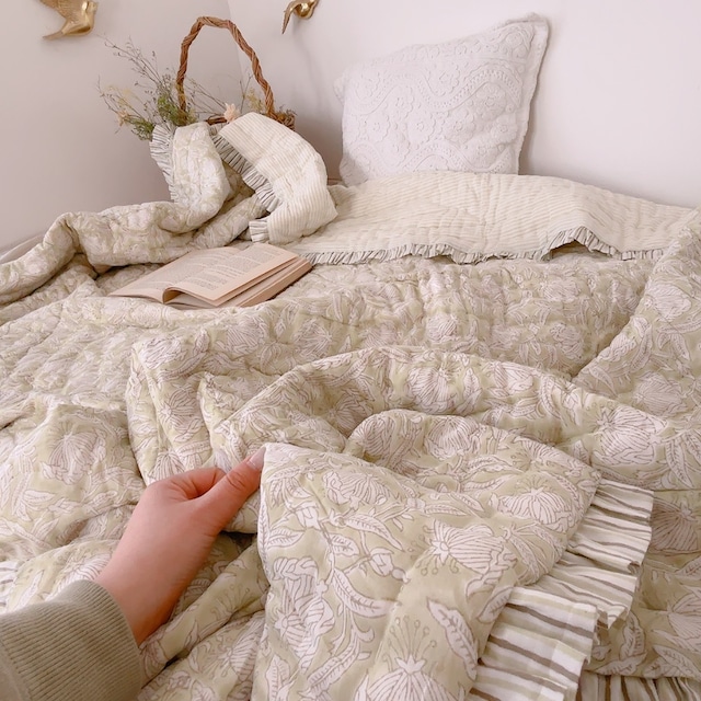 【受注】綿入りフリル【M】オリーブグリーンフラワー ブロックプリントキルト