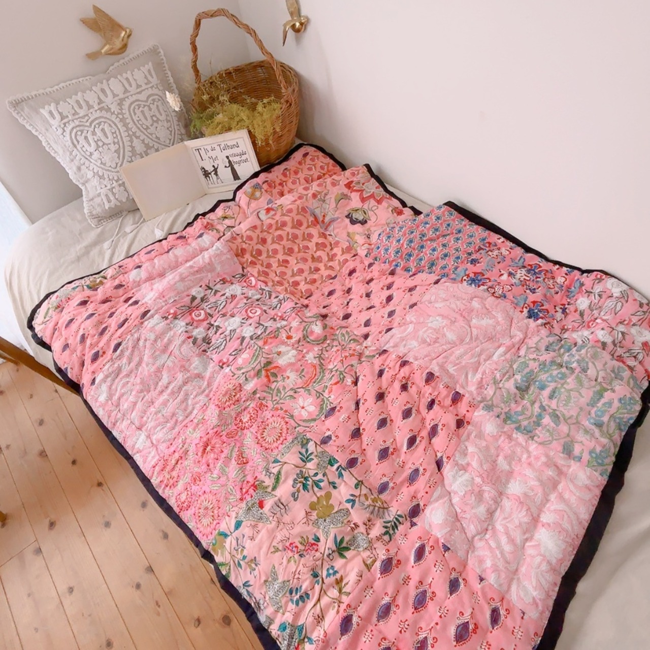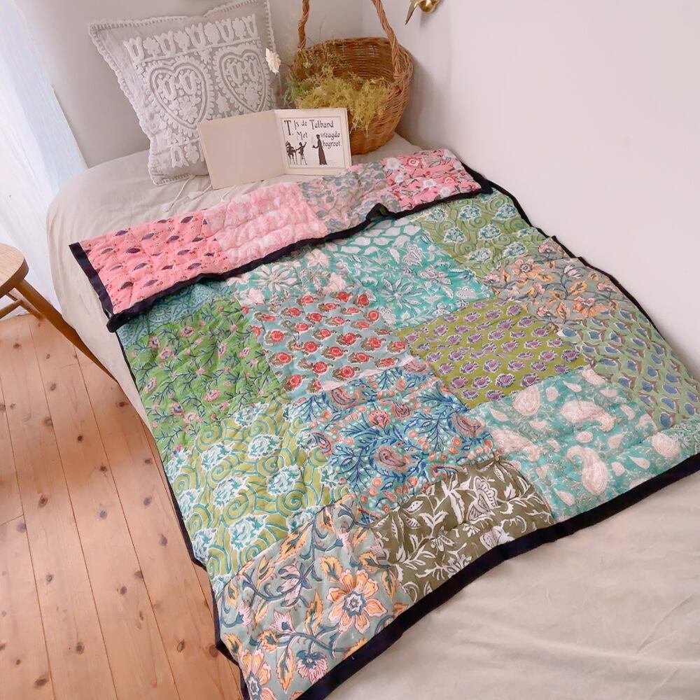 綿入り【baby size】グリーン×ピンク (E) ブロックプリントキルト