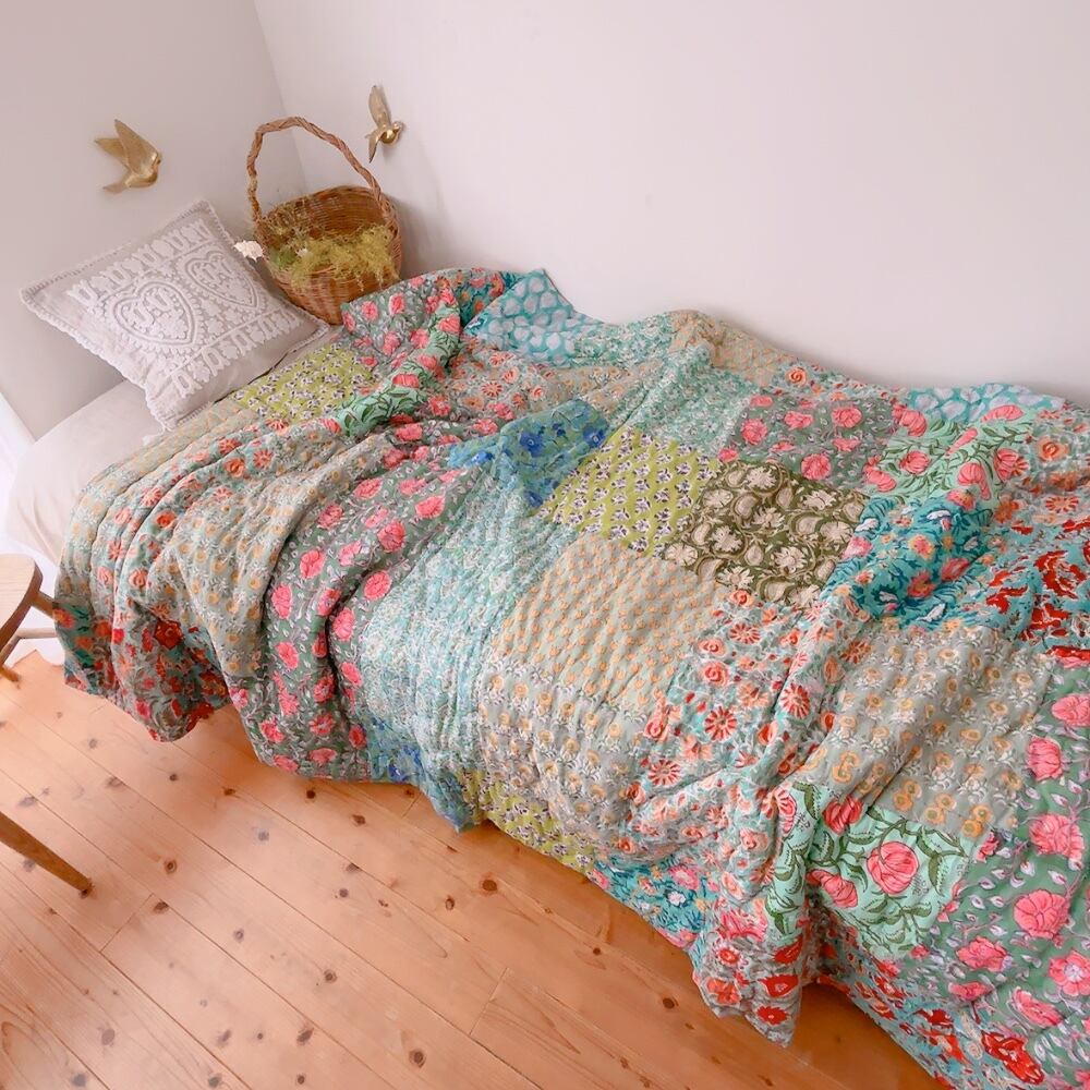 片面はカラフルなパッチワーク、もう片面はグリーン系のブロックプリント生地を集めた