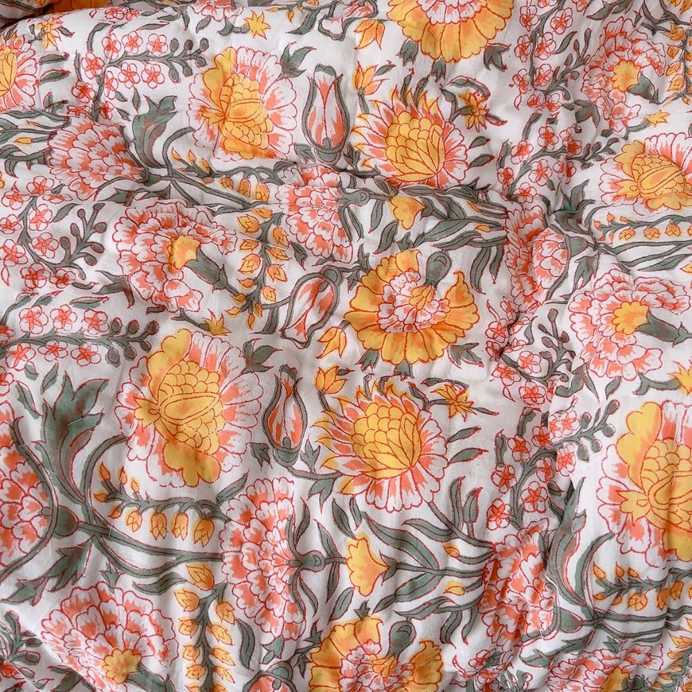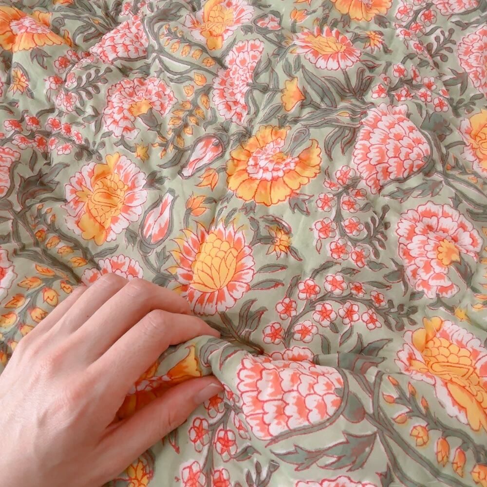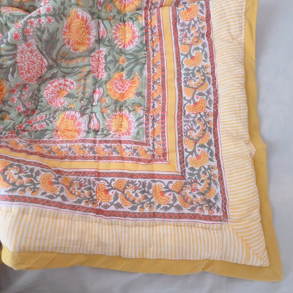 綿入り【M】イエローフラワー ブロックプリントキルト