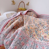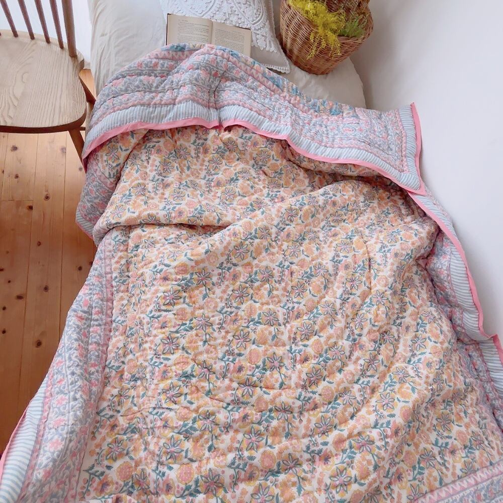 とても可愛らしいお花柄のブロックプリントの綿入りキルトです。