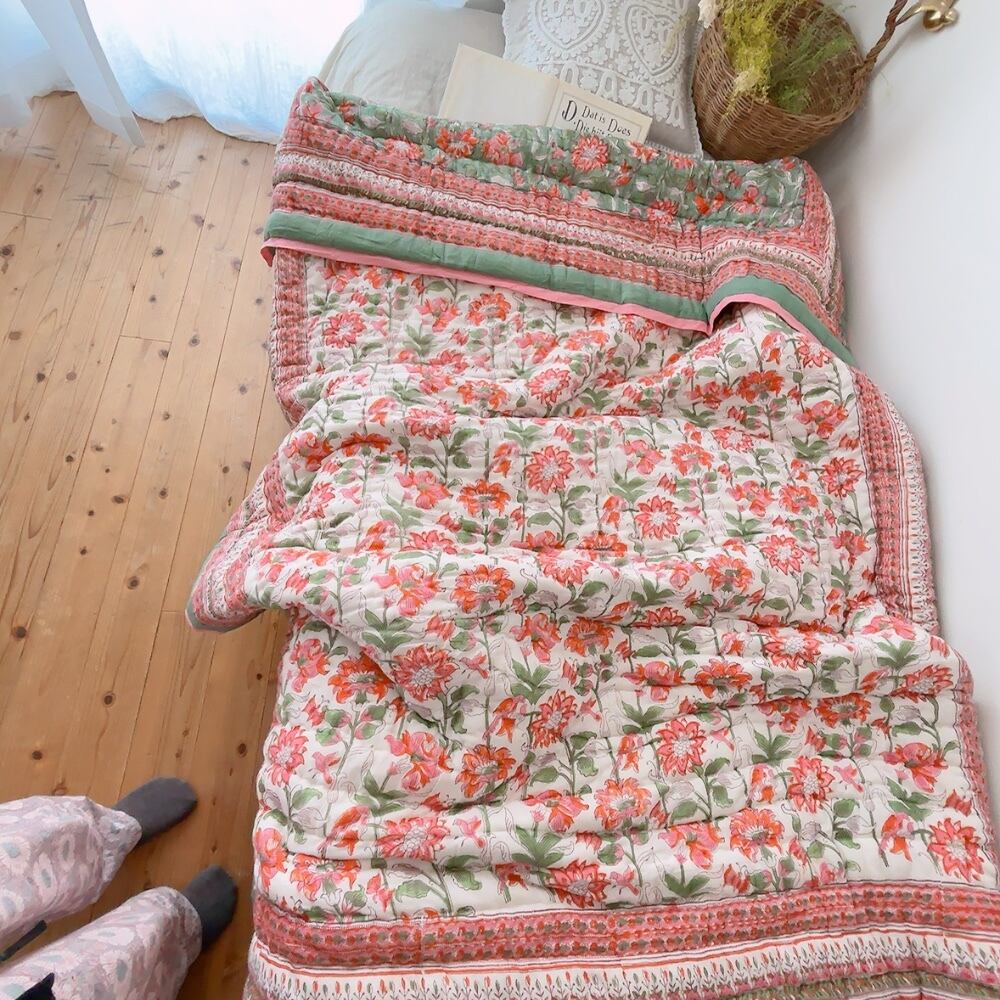 とても可愛らしいお花柄のブロックプリントの綿入りキルトです。