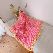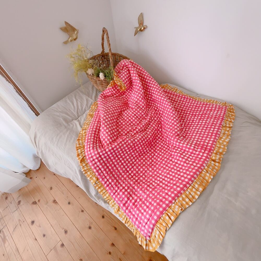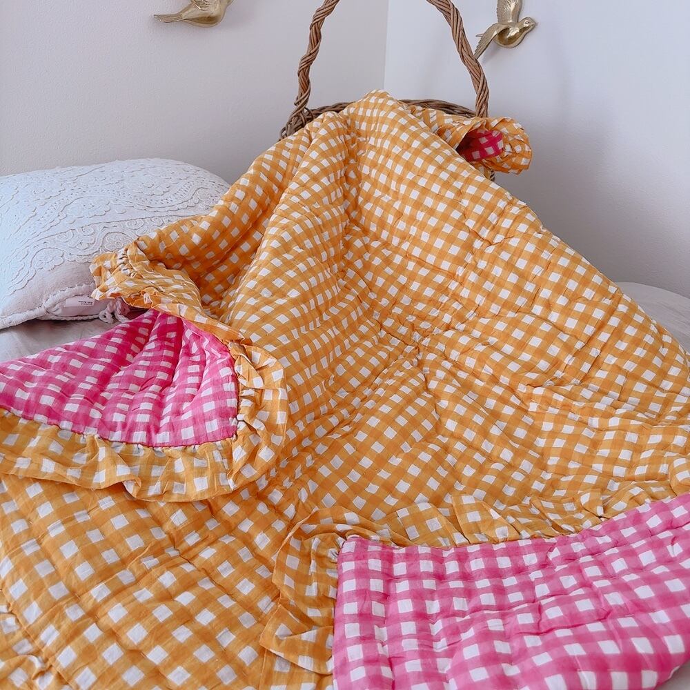 フリルの付いたチェック柄のブロックプリントの綿入りキルトです。