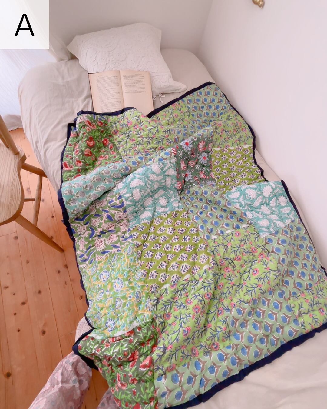片面はホワイト系のブロックプリントを集めたパッチワーク、もう片面はグリーン系のブロックプリント生地を集めたパッチワークの綿入りキルトです。