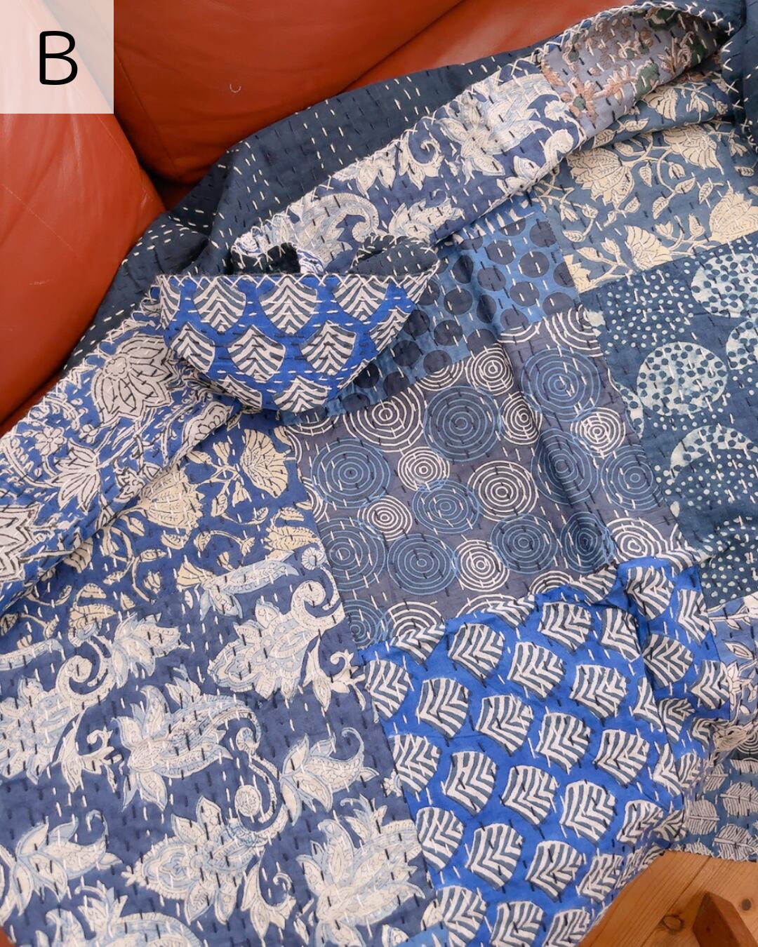 インディゴ系のブロックプリント生地を集めたべビーサイズのキルトです。