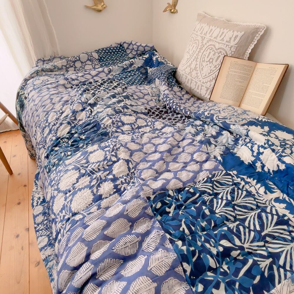 片面はホワイト系のブロックプリントを集めたパッチワーク、もう片面はブルー系のブロックプリント生地を集めたパッチワークの綿入りキルトです。