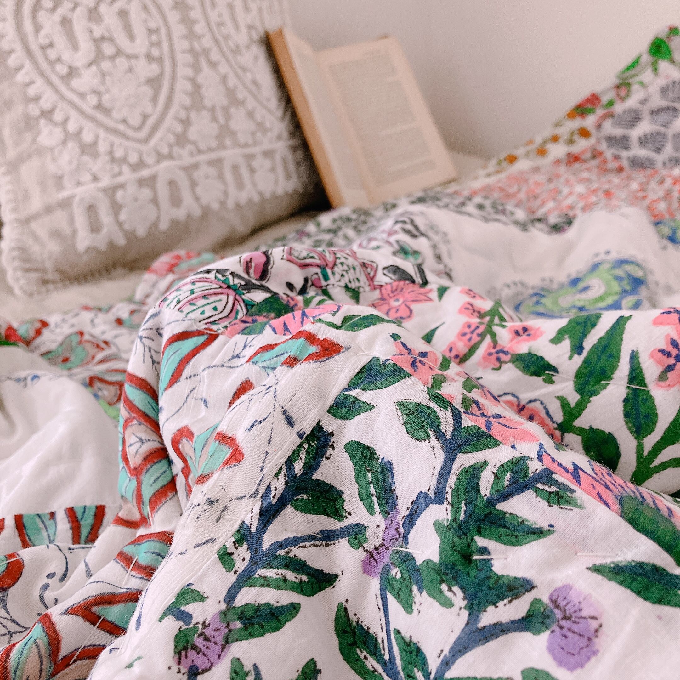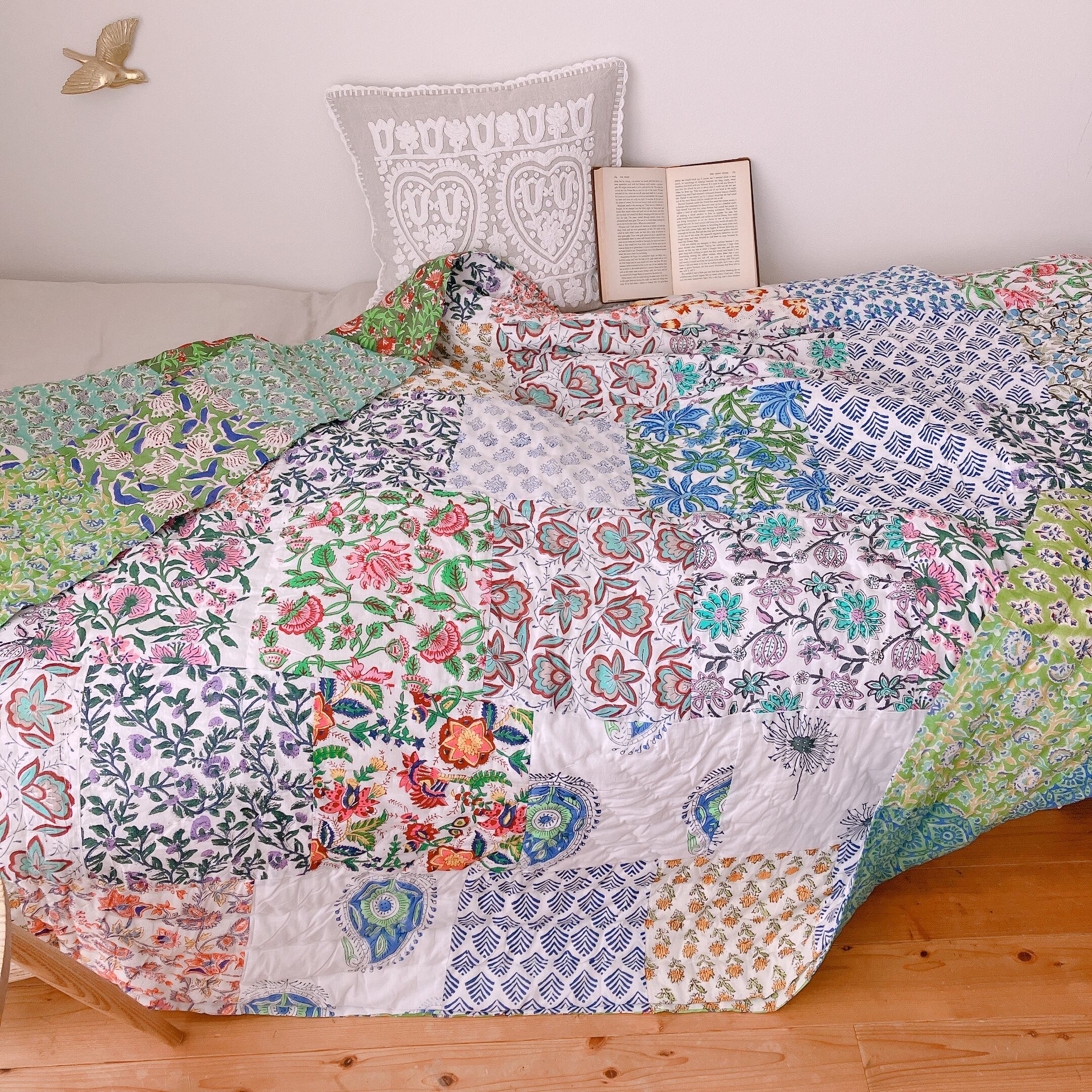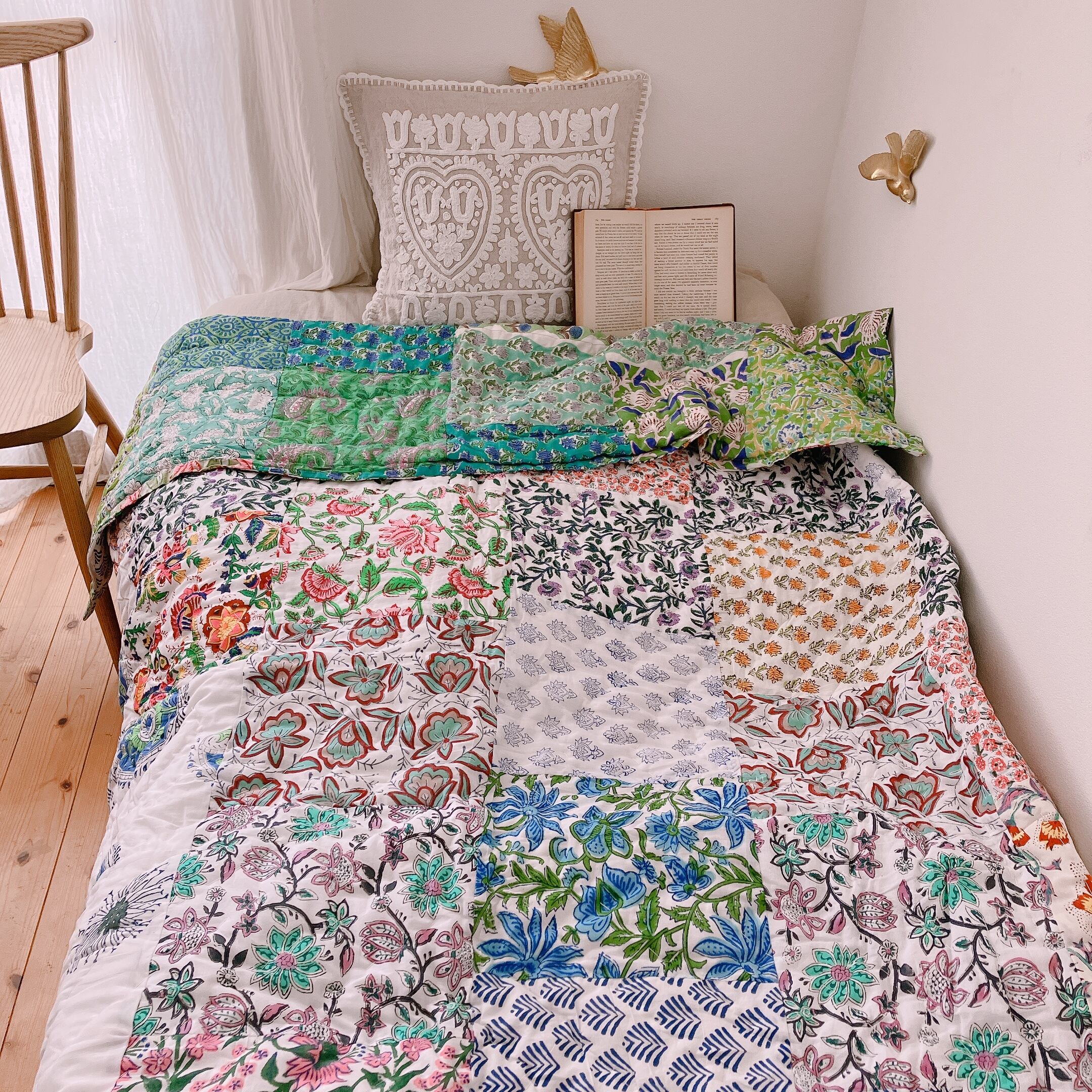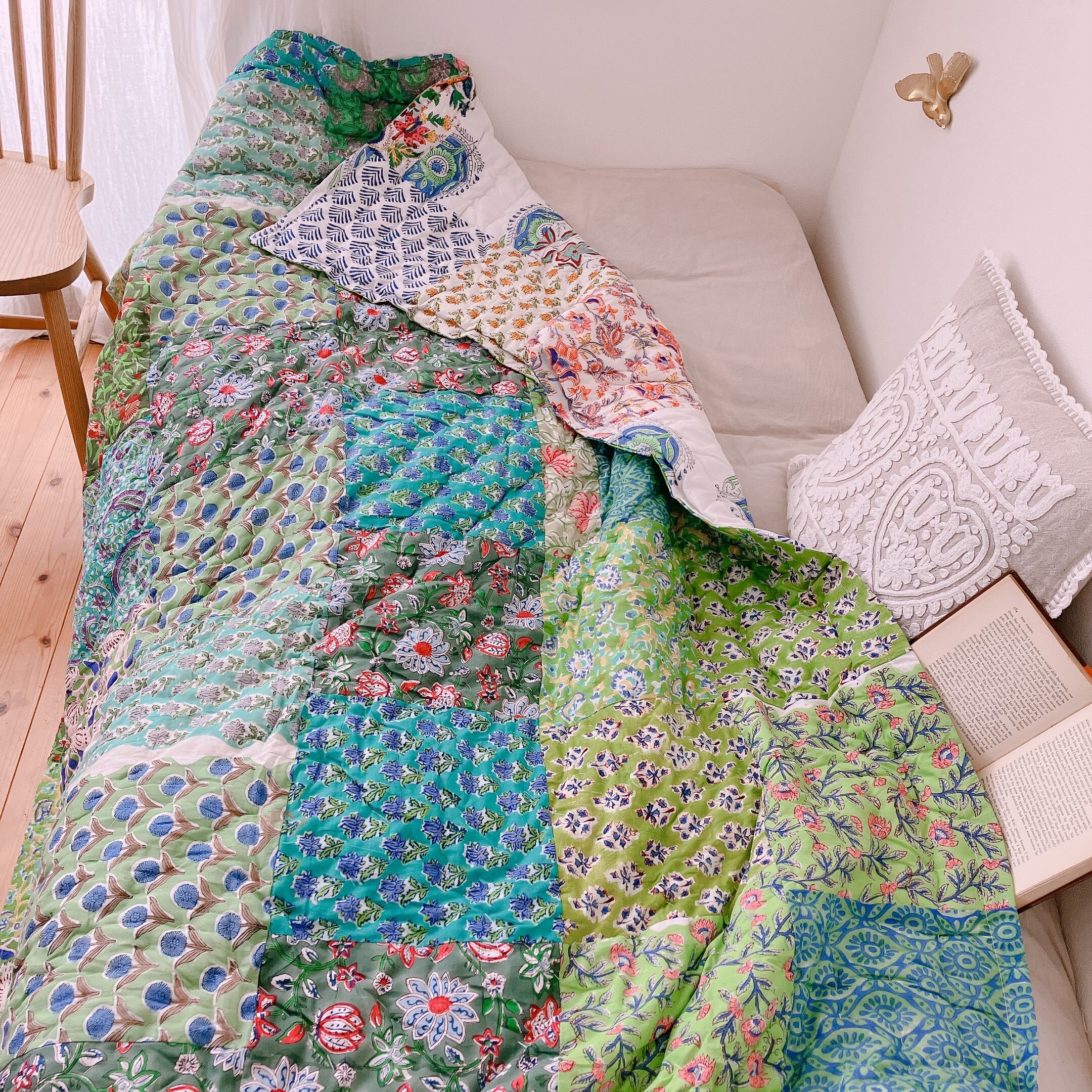 片面はホワイト系のブロックプリントを集めたパッチワーク、もう片面はグリーン系のブロックプリント生地を集めたパッチワークの綿入りキルトです。
