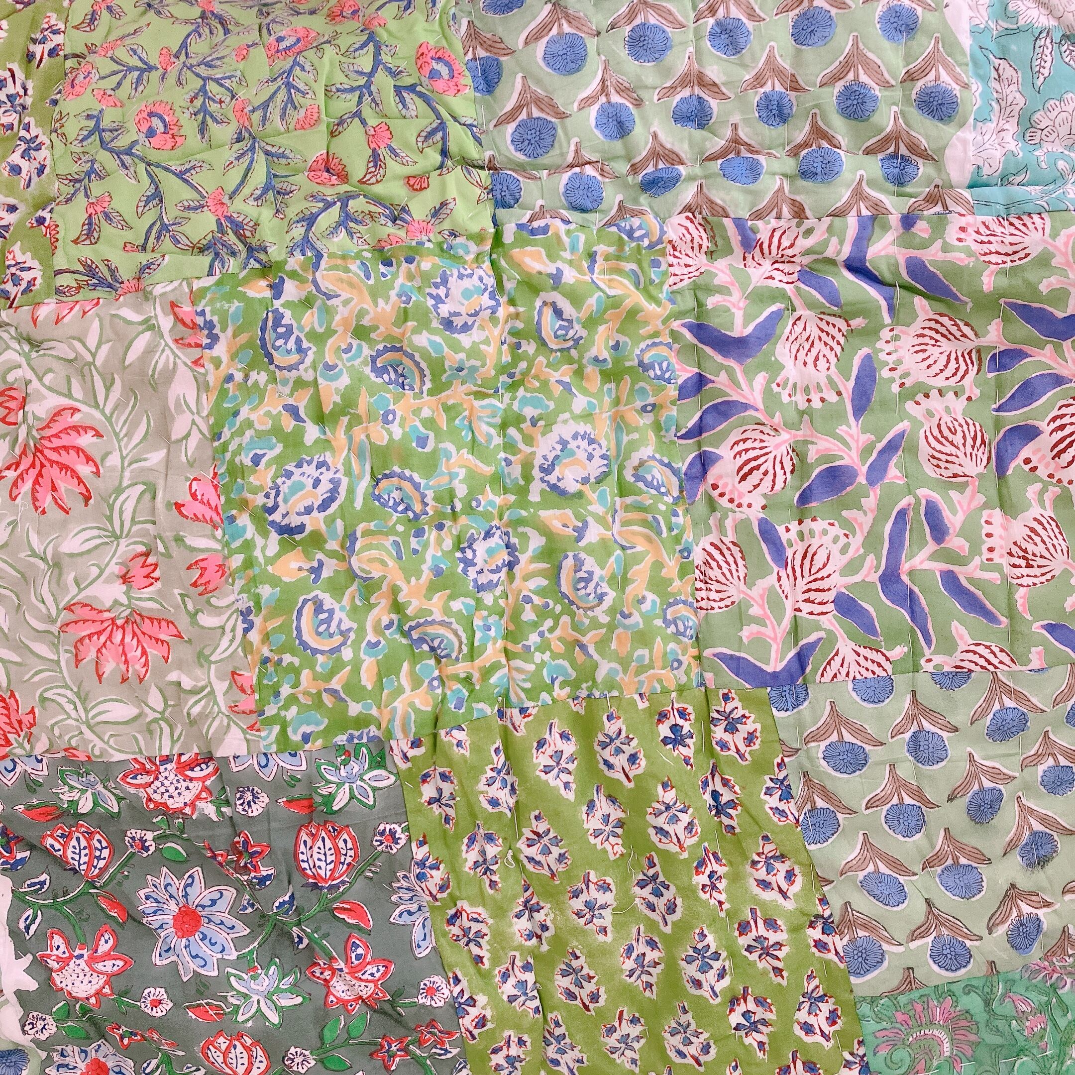 片面はホワイト系のブロックプリントを集めたパッチワーク、もう片面はグリーン系のブロックプリント生地を集めたパッチワークの綿入りキルトです。