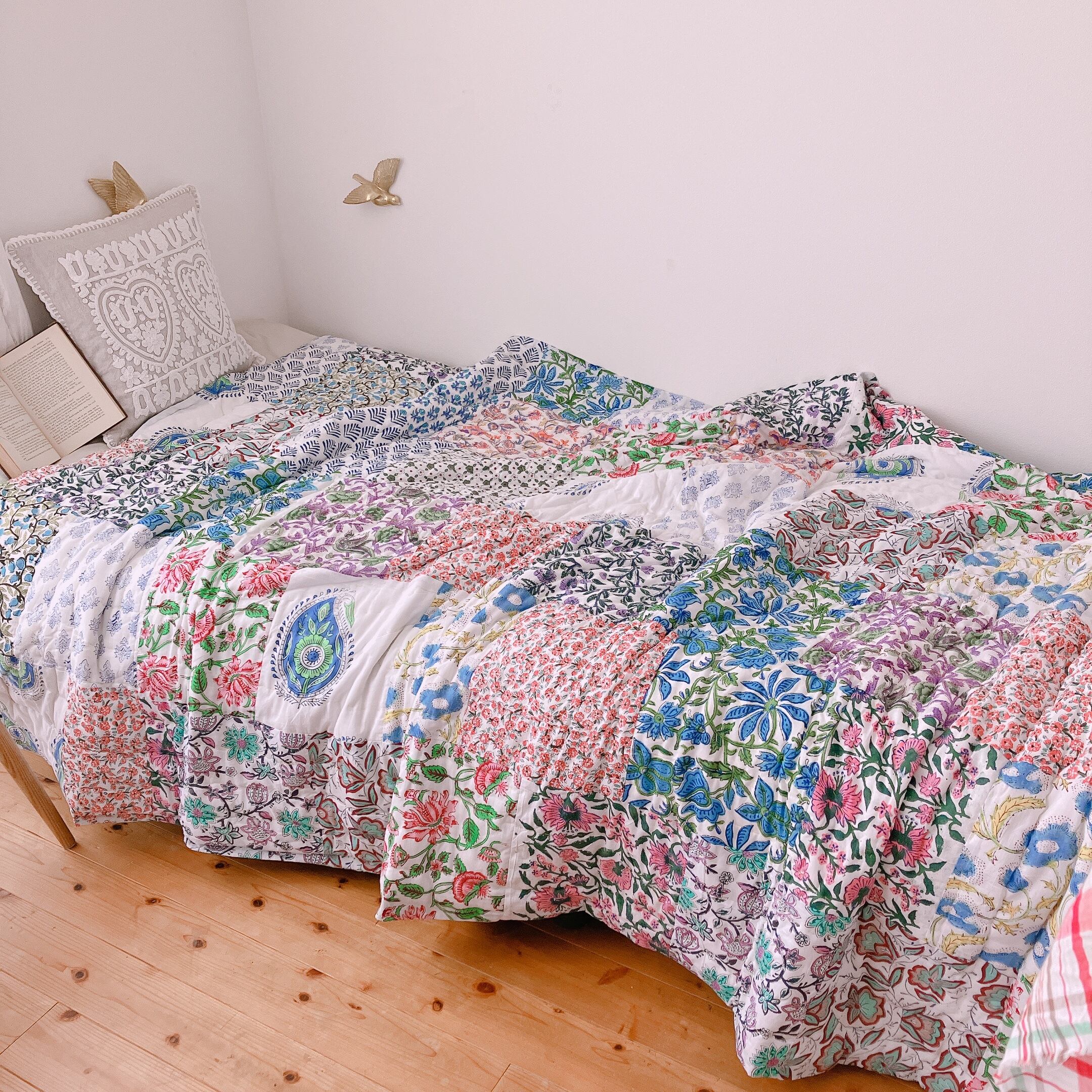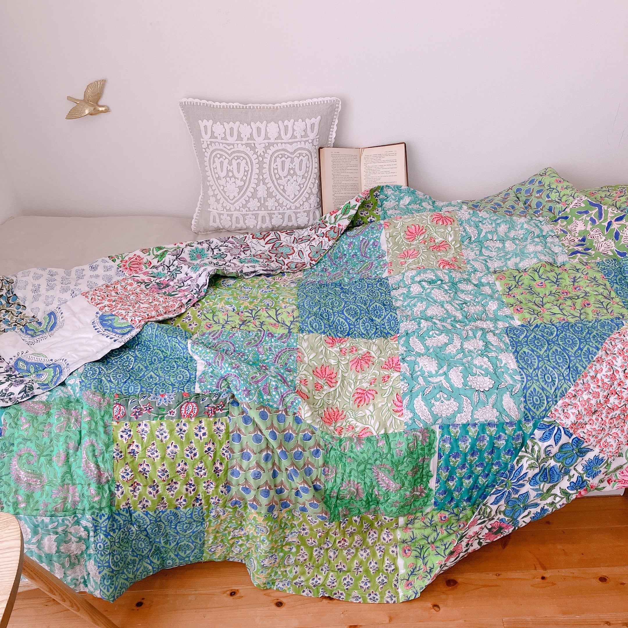 片面はホワイト系のブロックプリントを集めたパッチワーク、もう片面はグリーン系のブロックプリント生地を集めたパッチワークの綿入りキルトです。