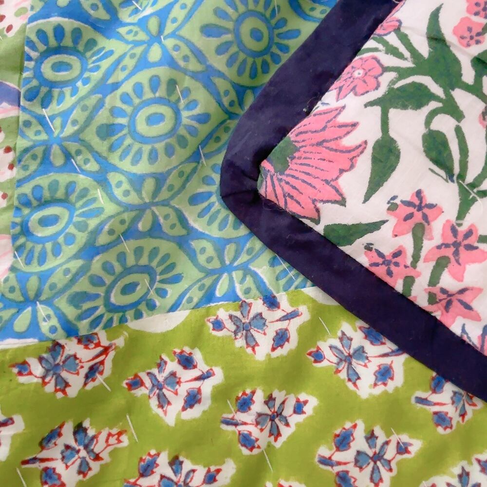 片面はホワイト系のブロックプリントを集めたパッチワーク、もう片面はグリーン系のブロックプリント生地を集めたパッチワークの綿入りキルトです。