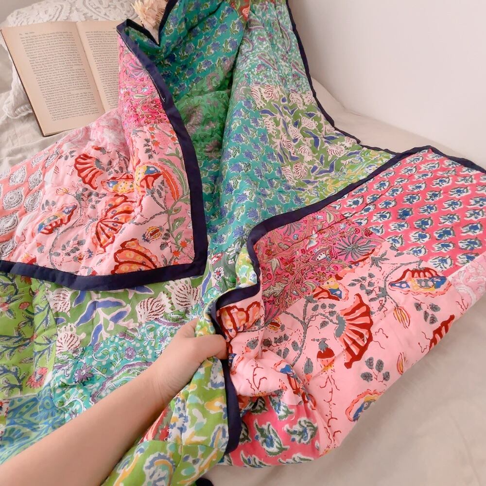片面はピンク系のブロックプリントを集めたパッチワーク、もう片面はグリーン系のブロックプリント生地を集めたパッチワークの綿入りキルトです。