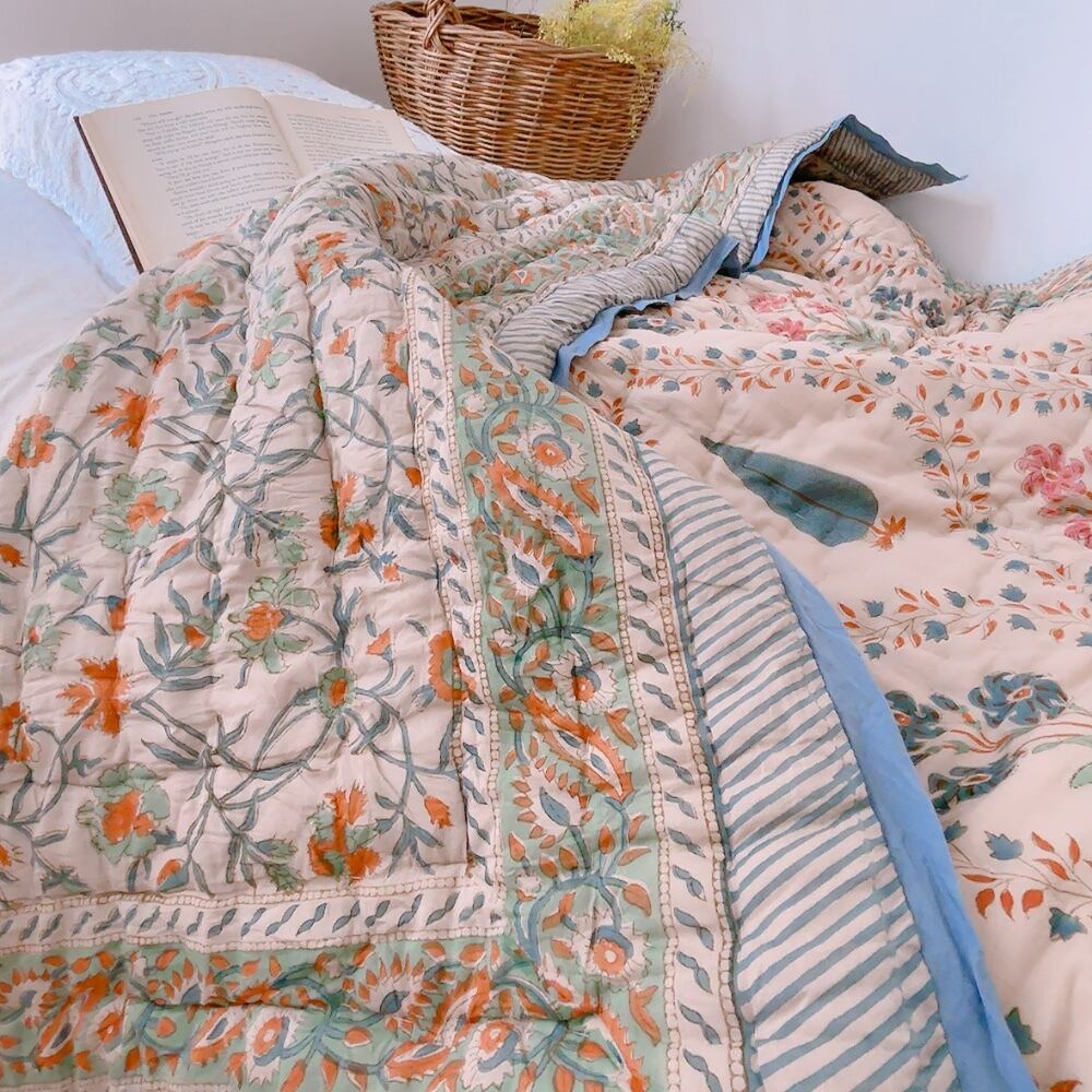 とても可愛らしいお花柄のブロックプリントの綿入りキルトです。