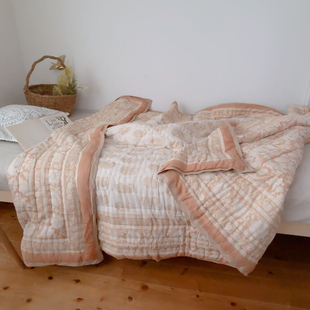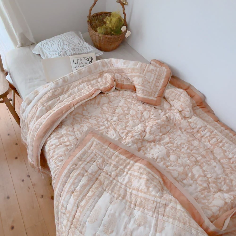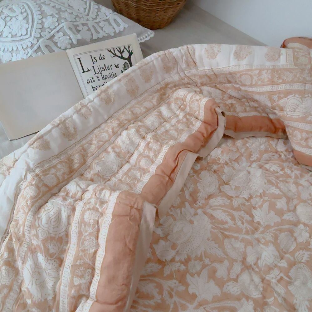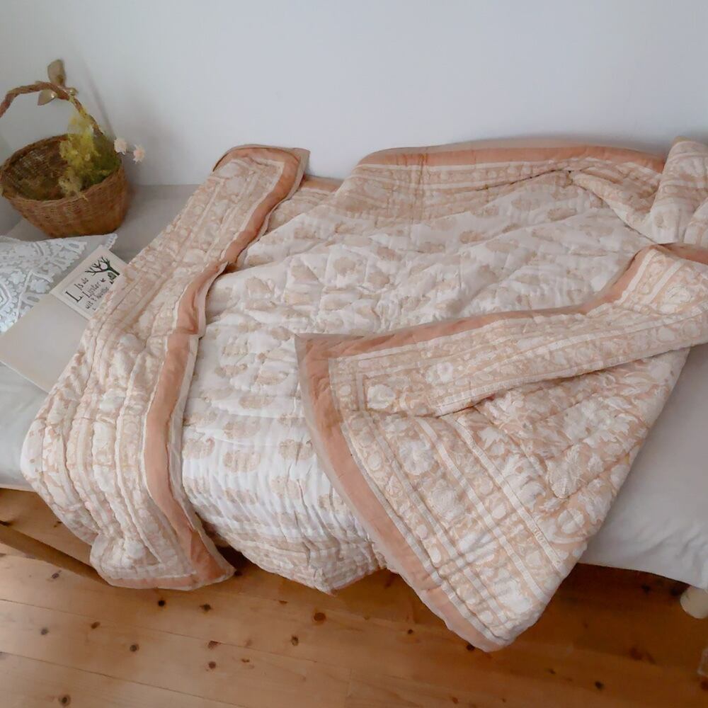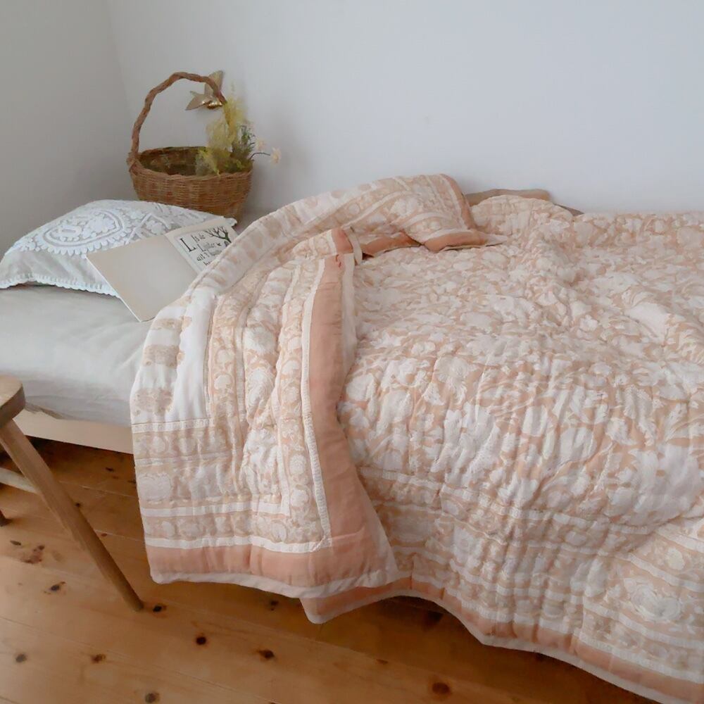 とても可愛らしいお花柄のブロックプリントの綿入りキルトです。