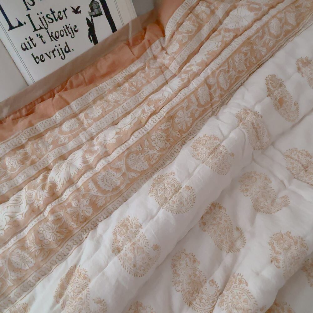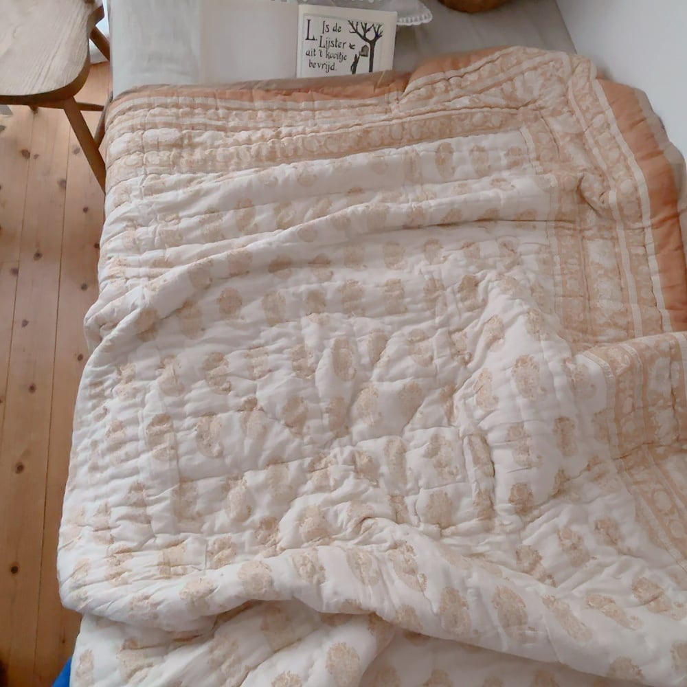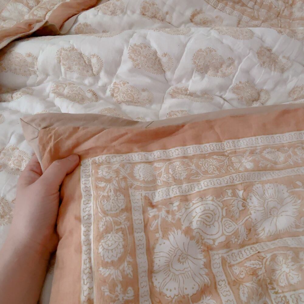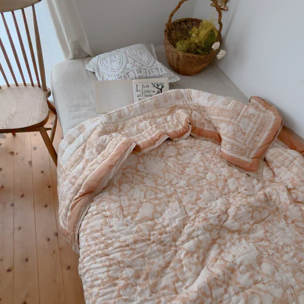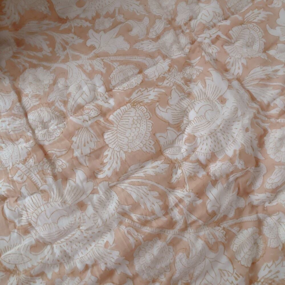 とても可愛らしいお花柄のブロックプリントの綿入りキルトです。