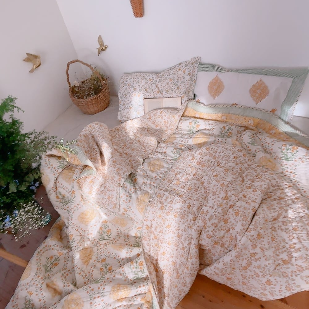 綿入り【L】枕カバー付き ミモザの朝 ブロックプリントキルト