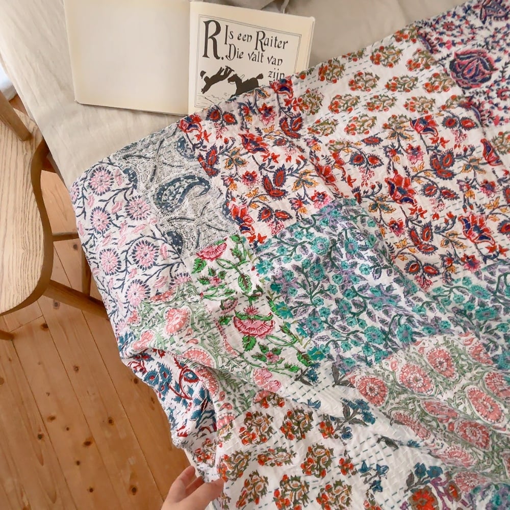 ホワイト系のブロックプリント生地を集めたべビーサイズのキルトです。