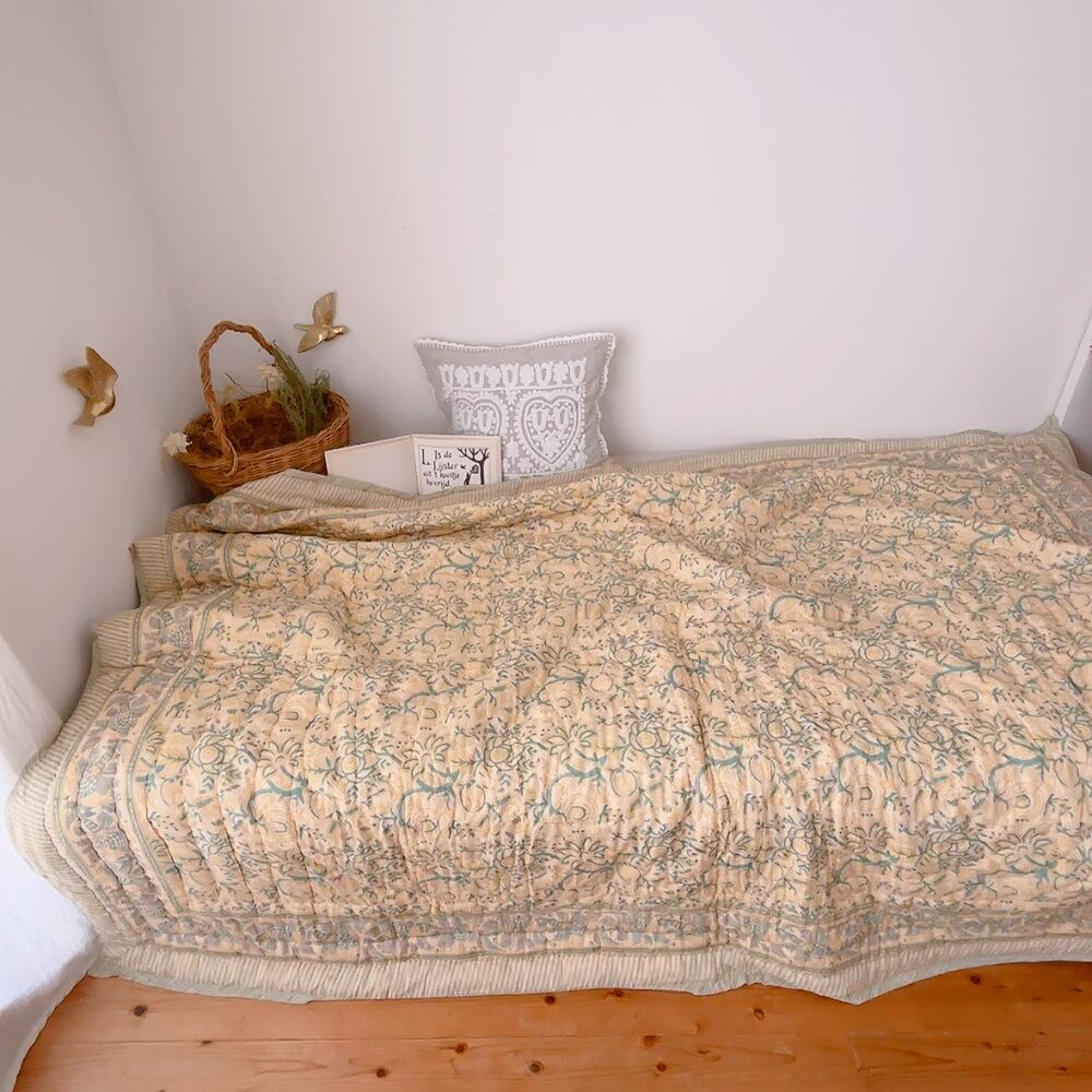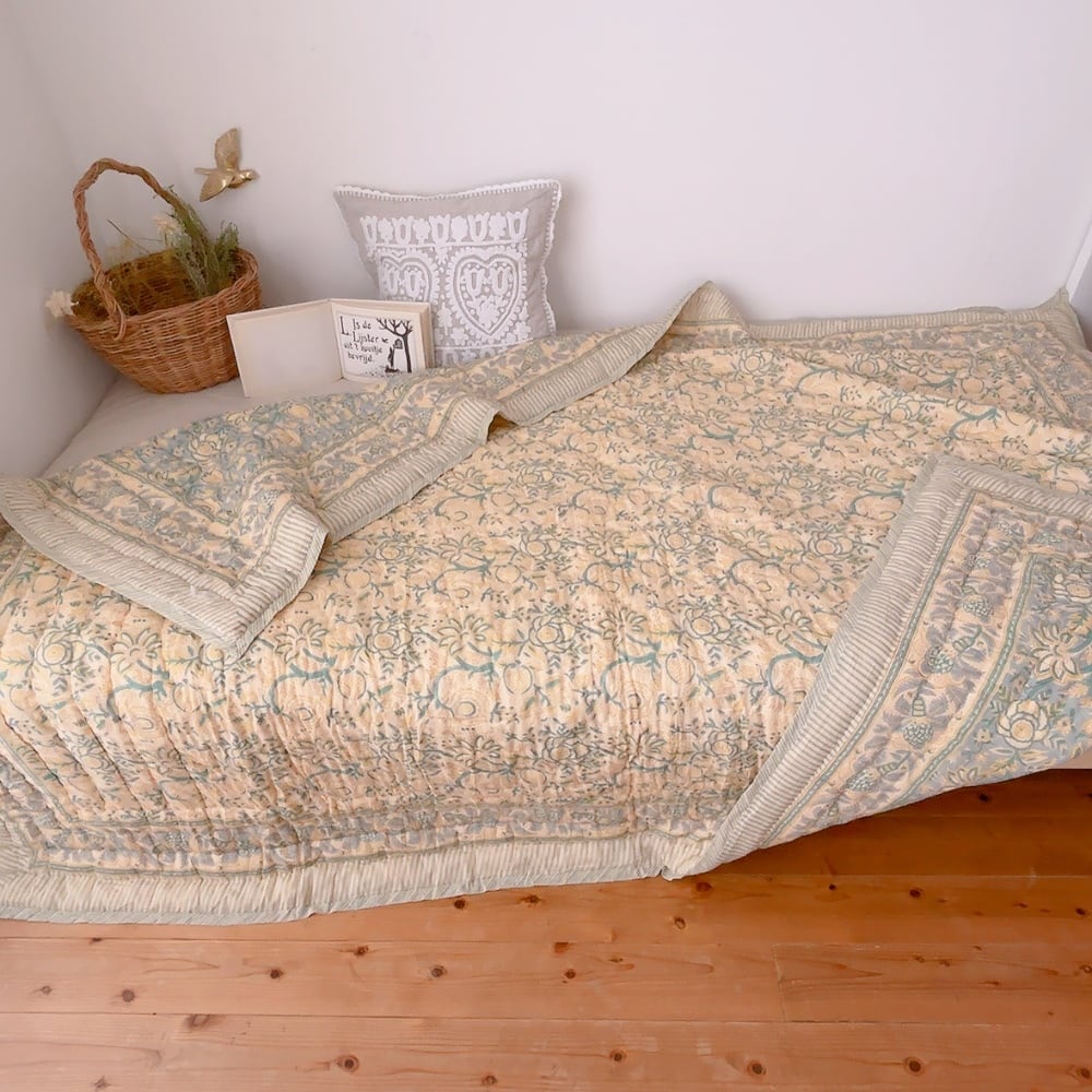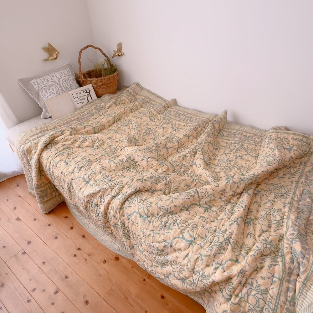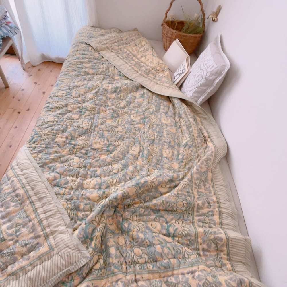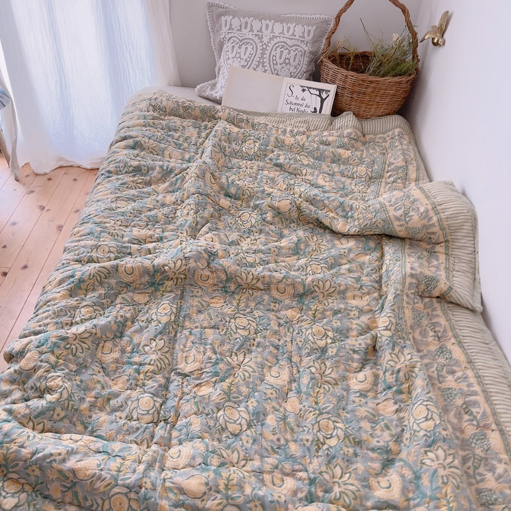 とても可愛らしいお花柄のブロックプリントの綿入りキルトです。