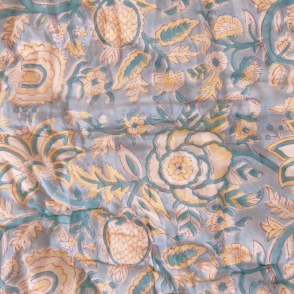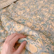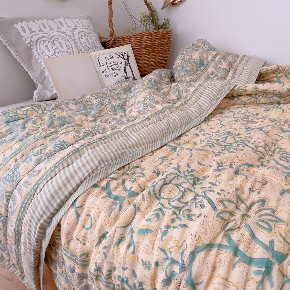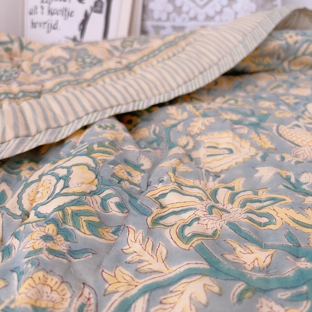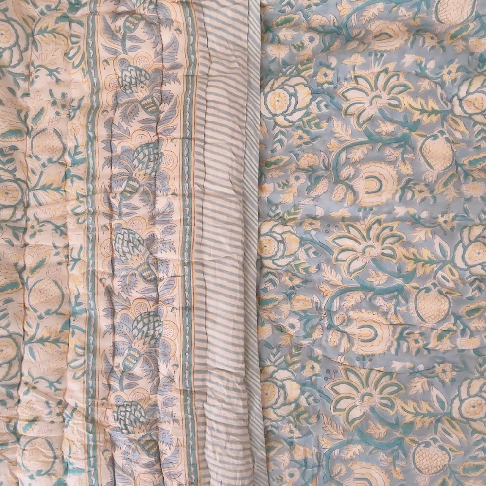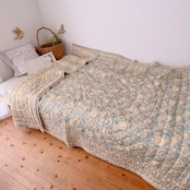 とても可愛らしいお花柄のブロックプリントの綿入りキルトです。