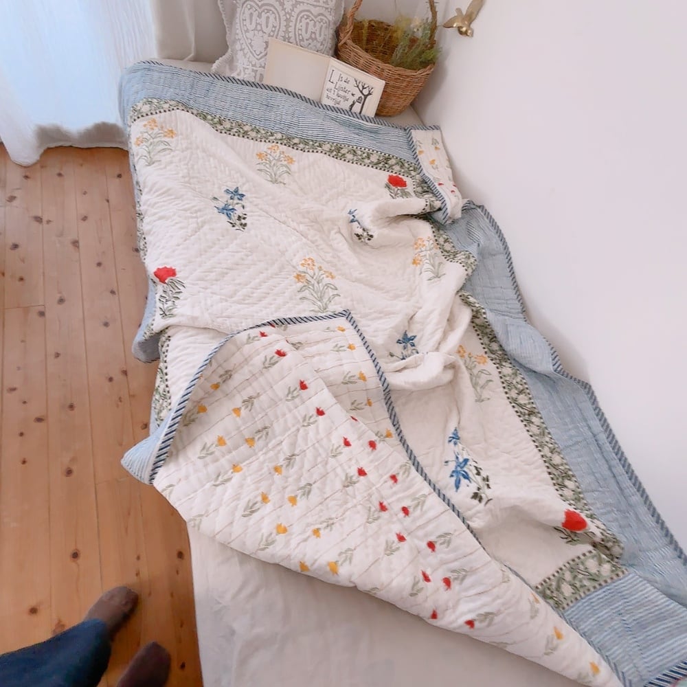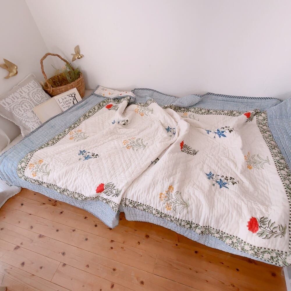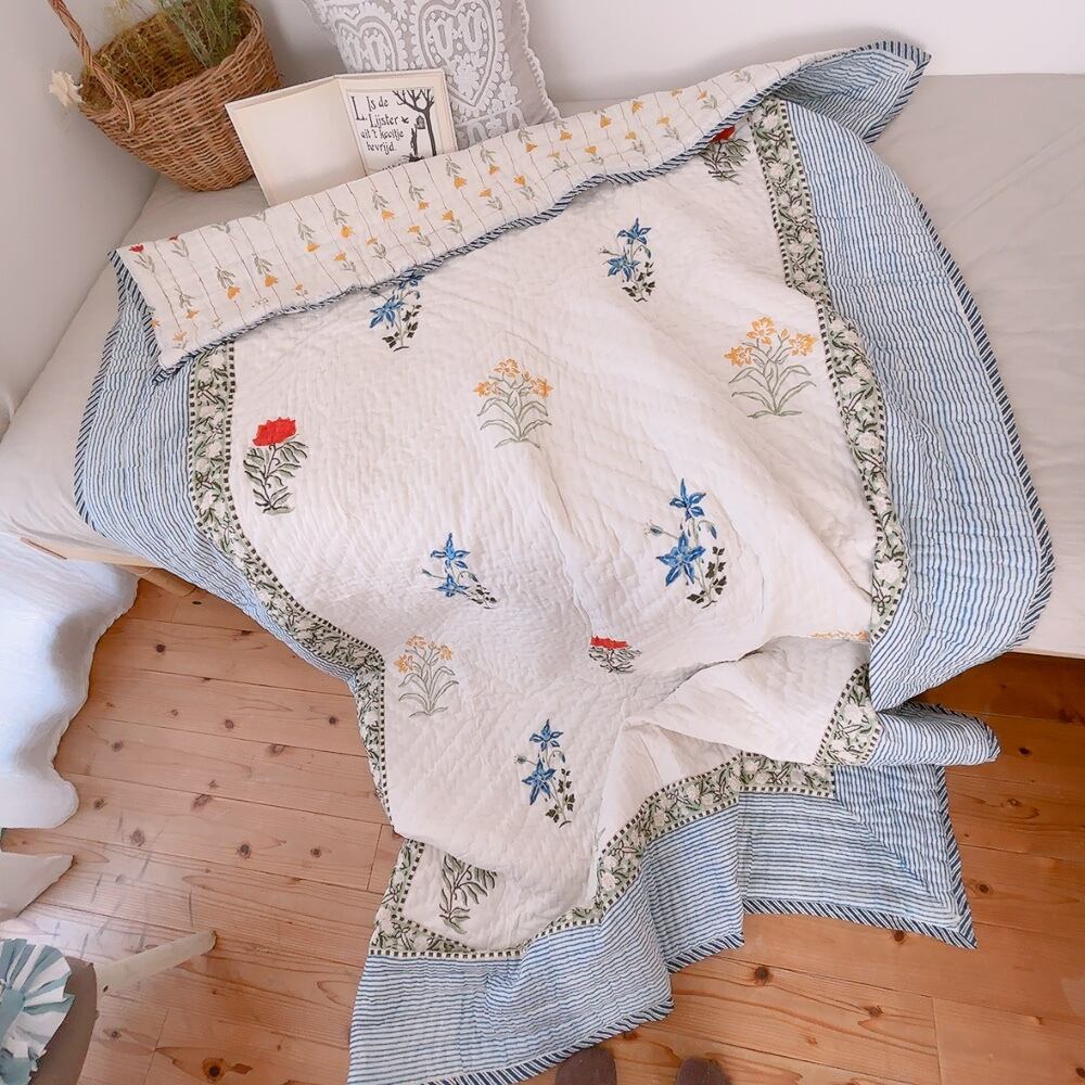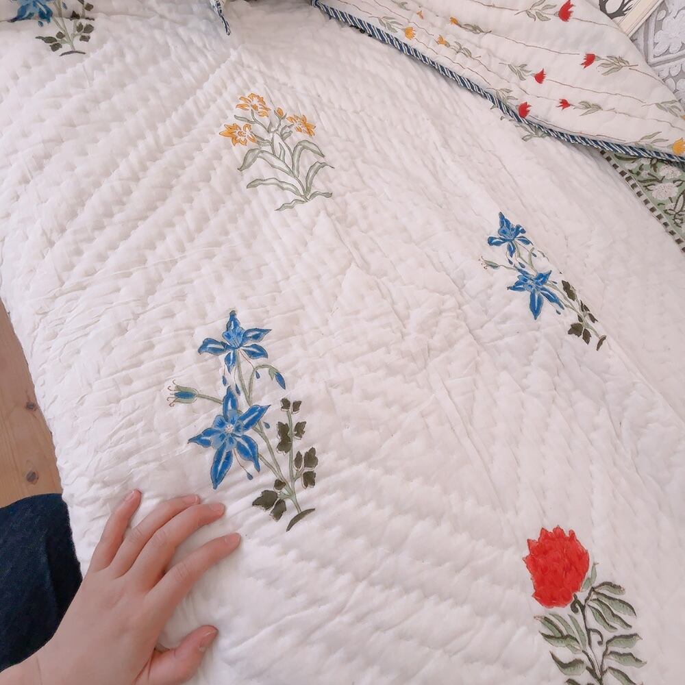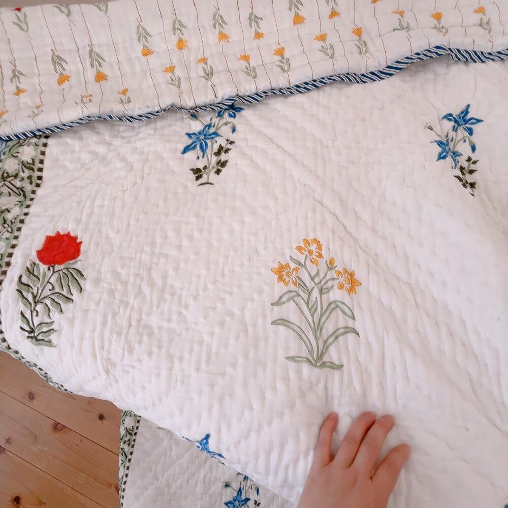 とても可愛らしいお花柄のブロックプリントの綿入りキルトです。