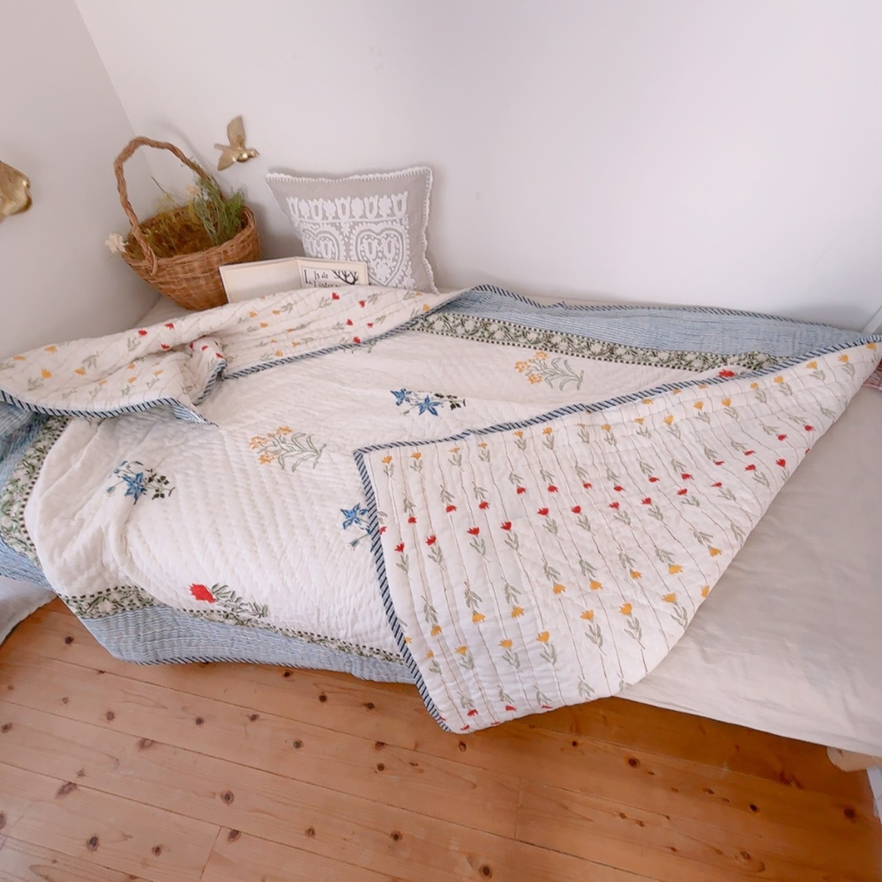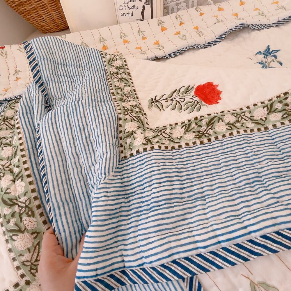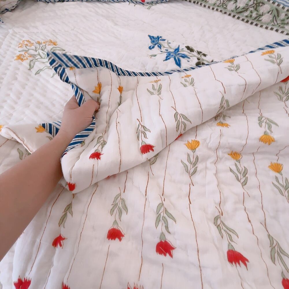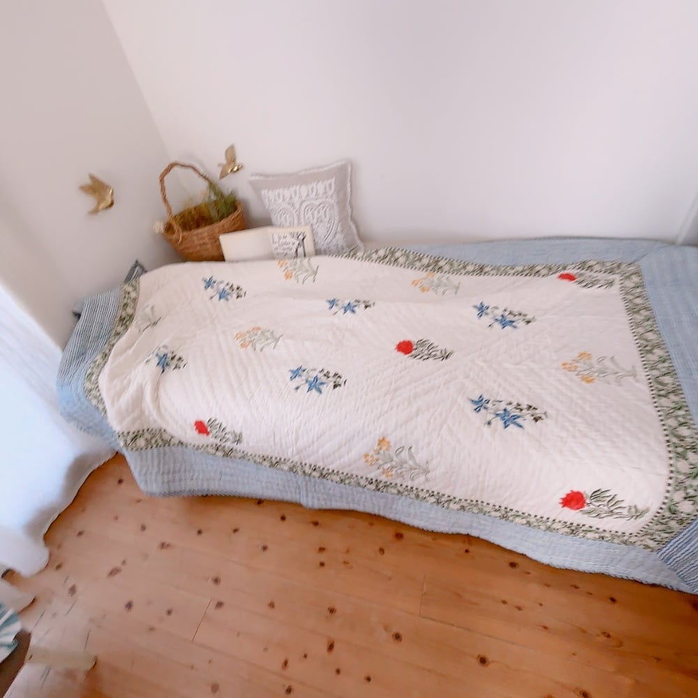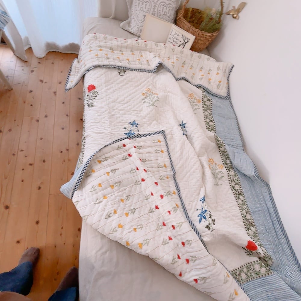 とても可愛らしいお花柄のブロックプリントの綿入りキルトです。