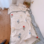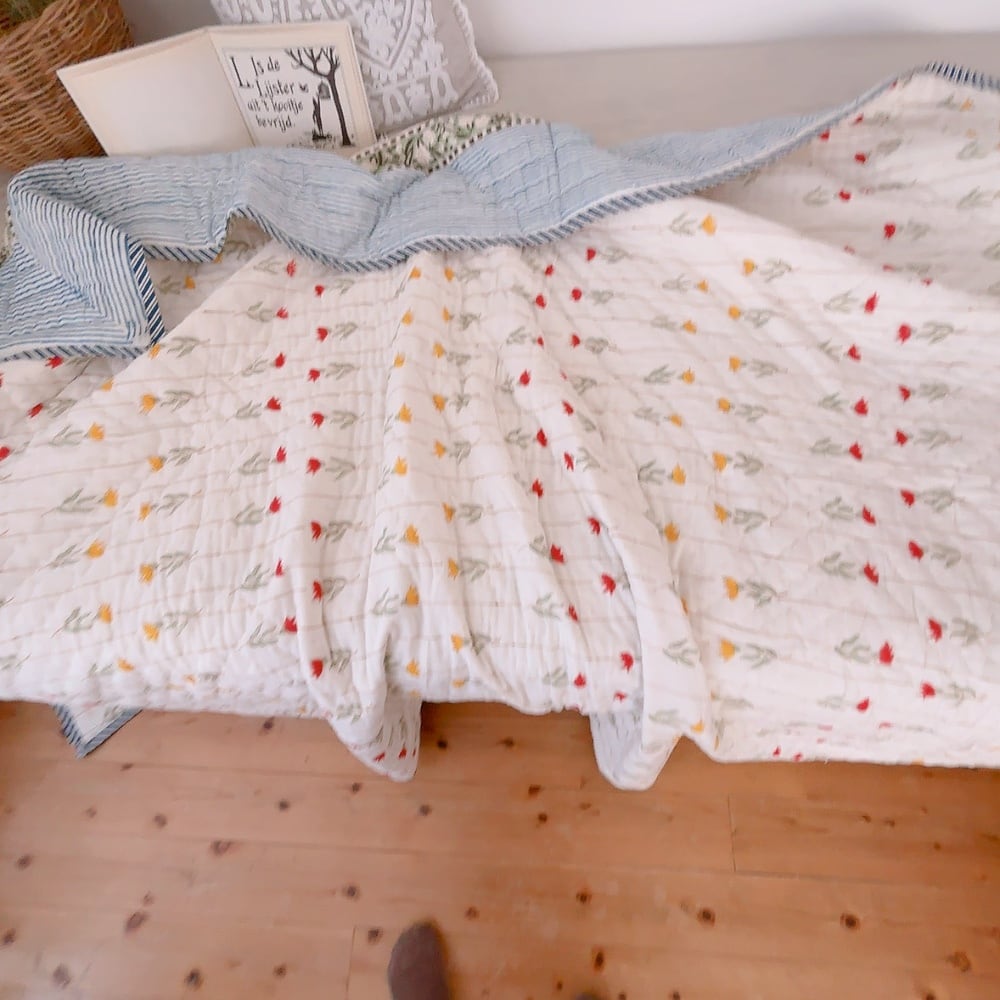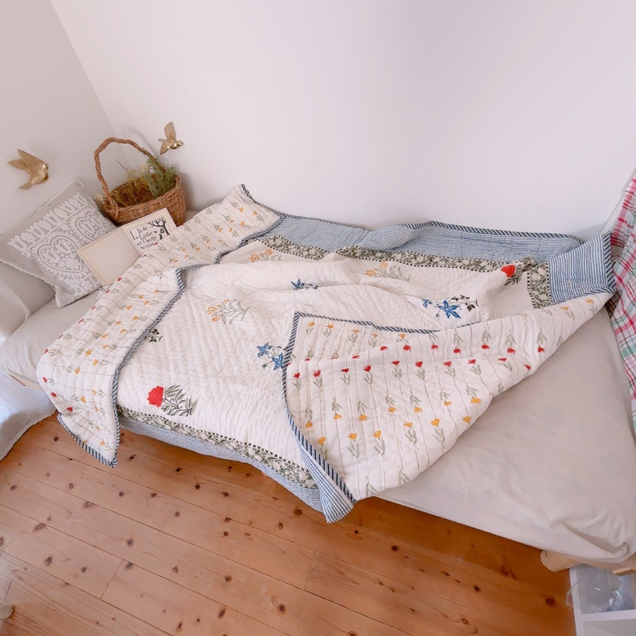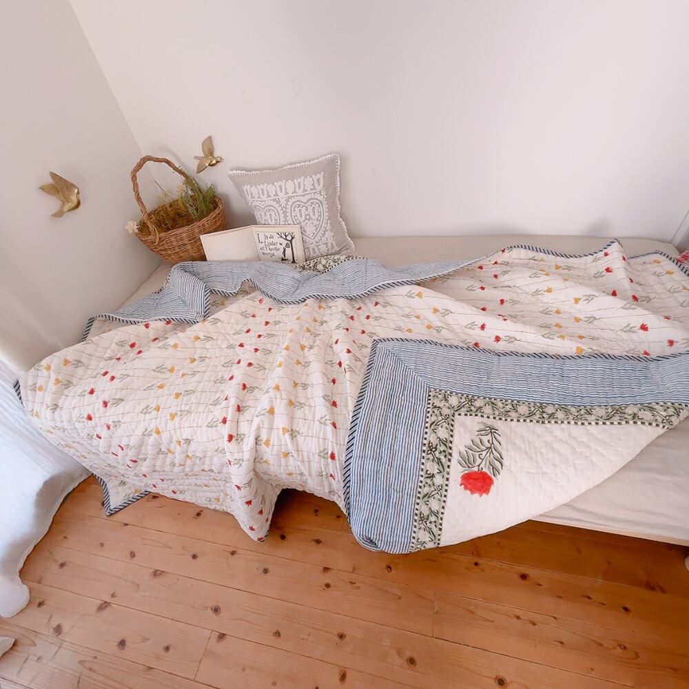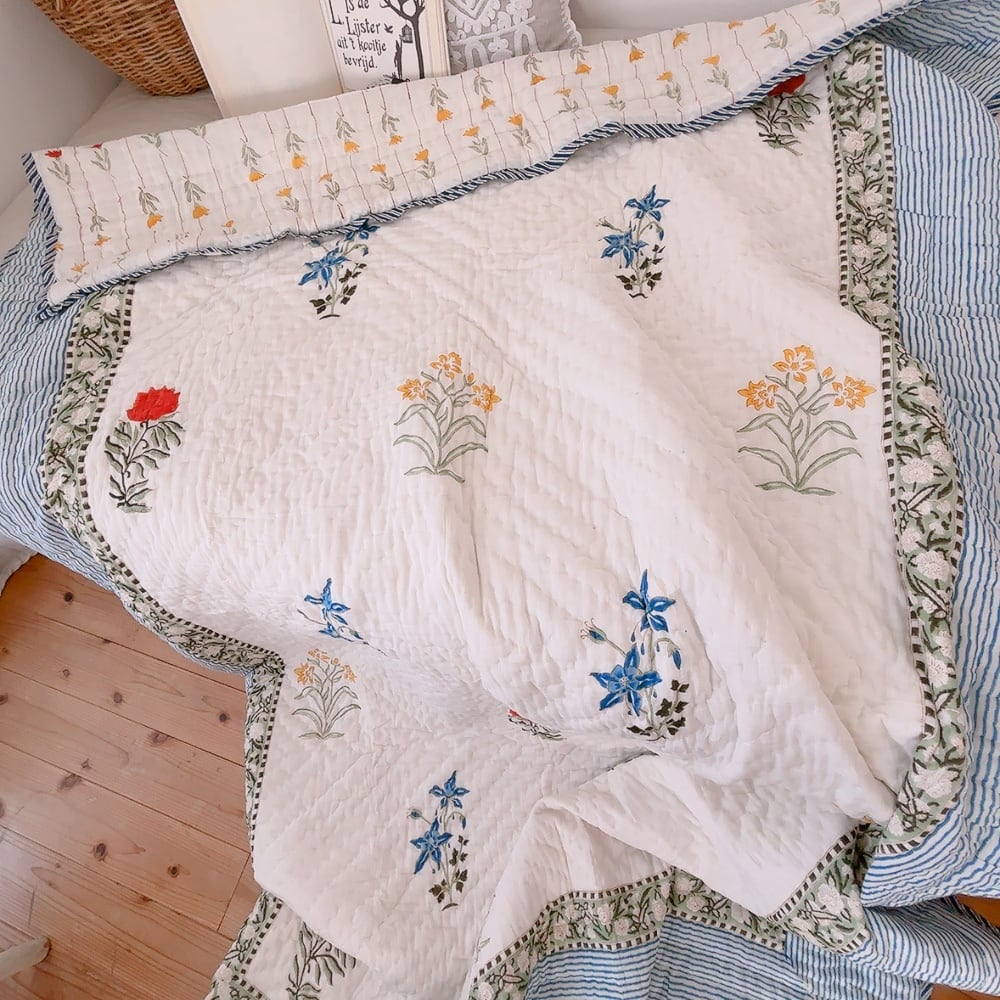 とても可愛らしいお花柄のブロックプリントの綿入りキルトです。