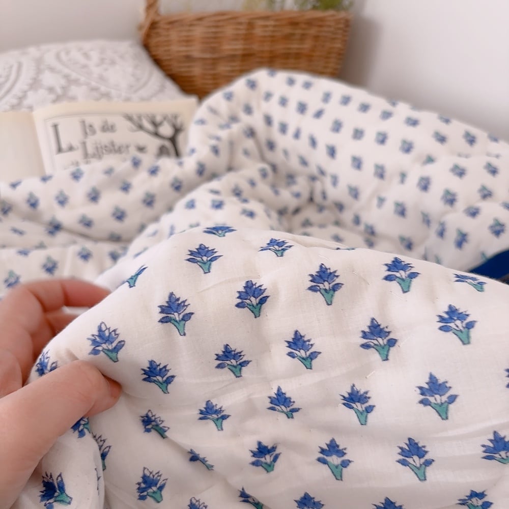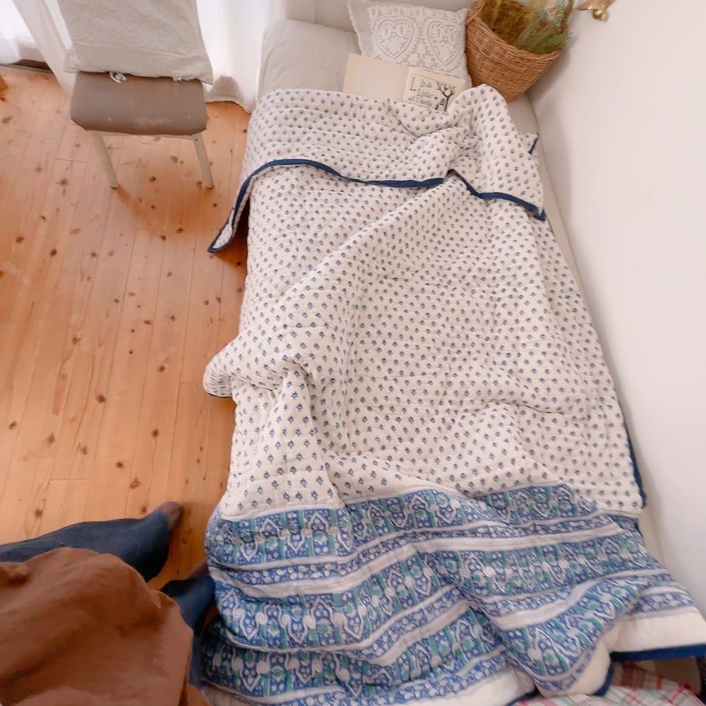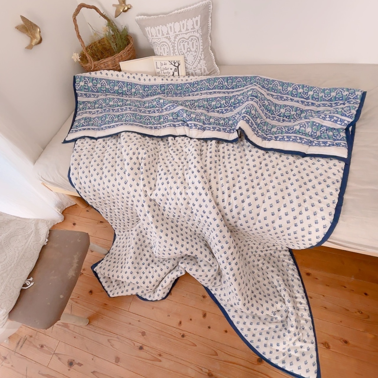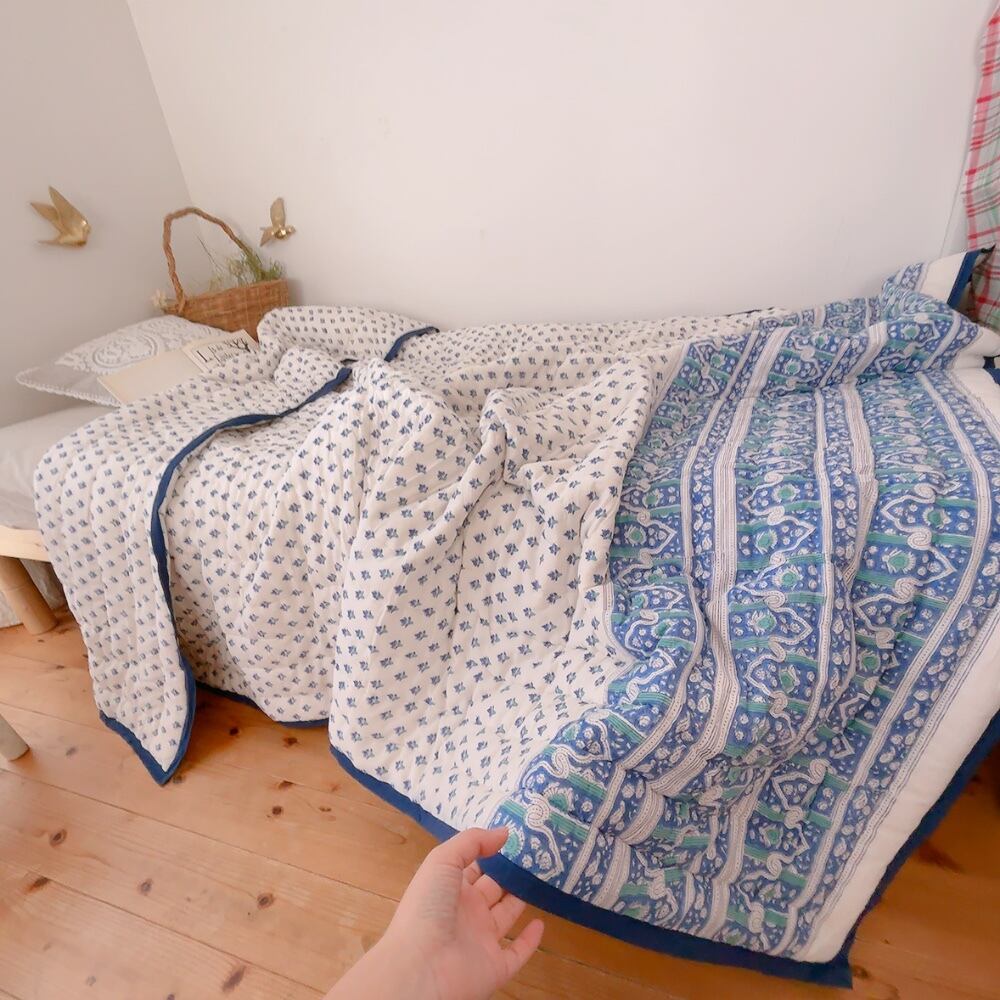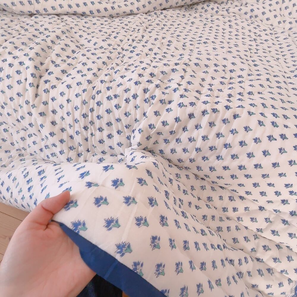 とても可愛らしいお花柄のブロックプリントの綿入りキルトです。