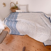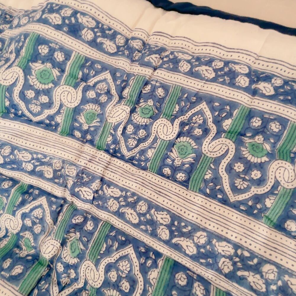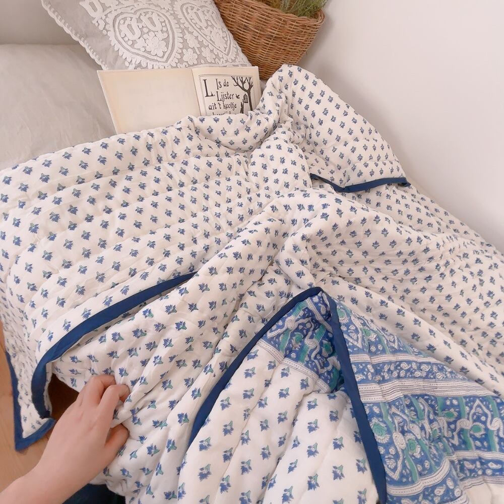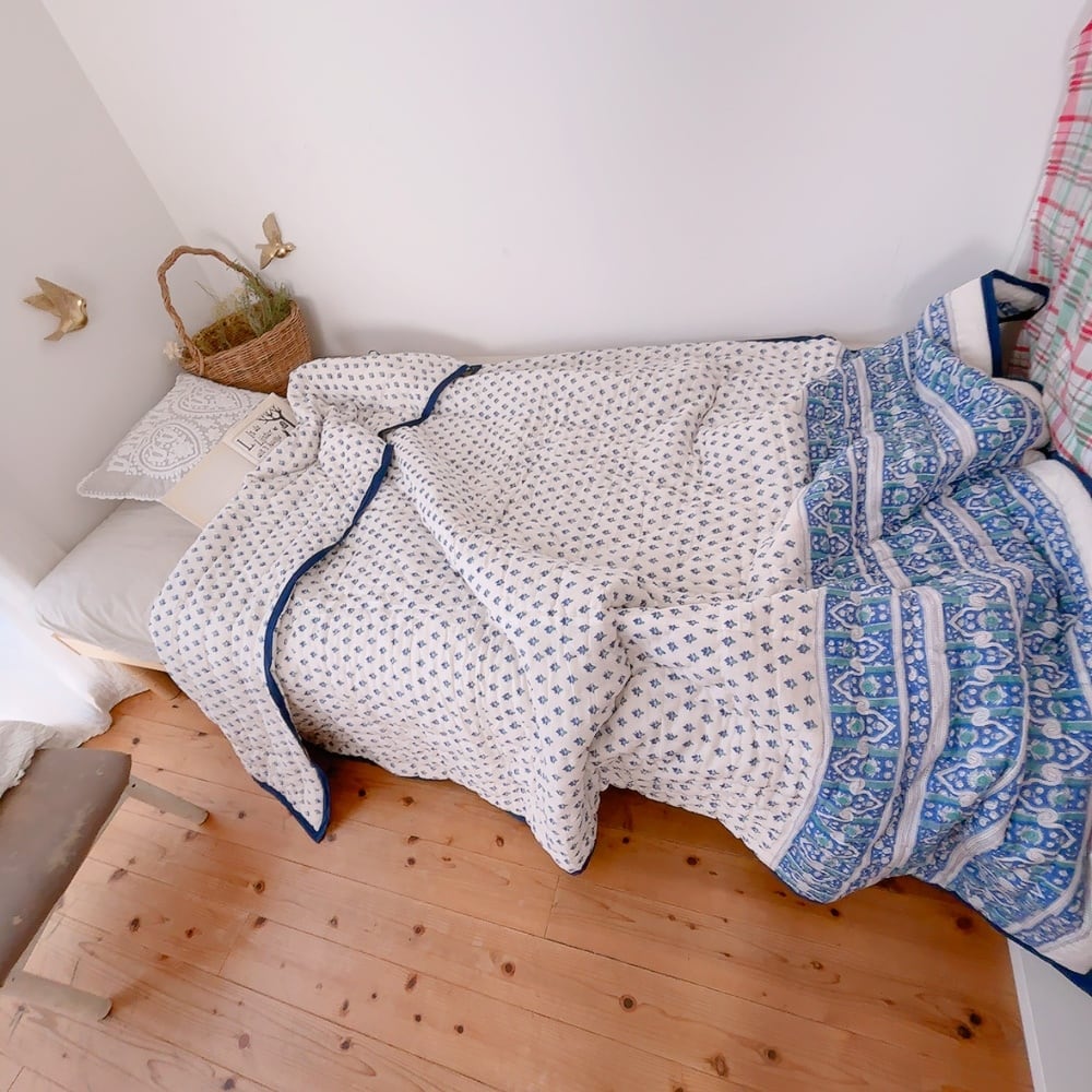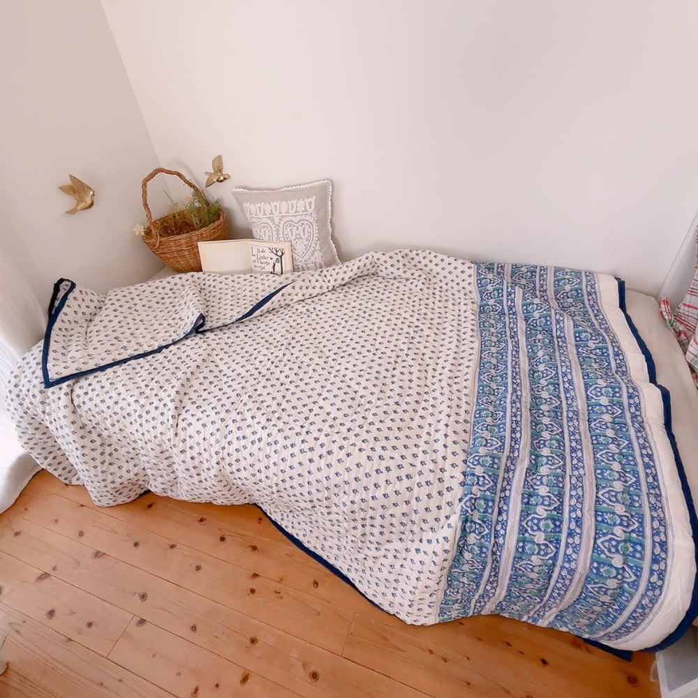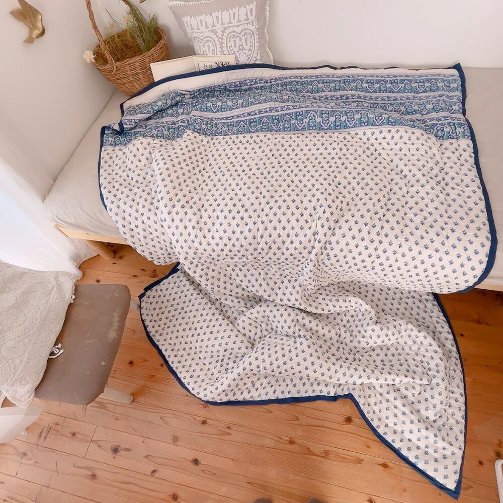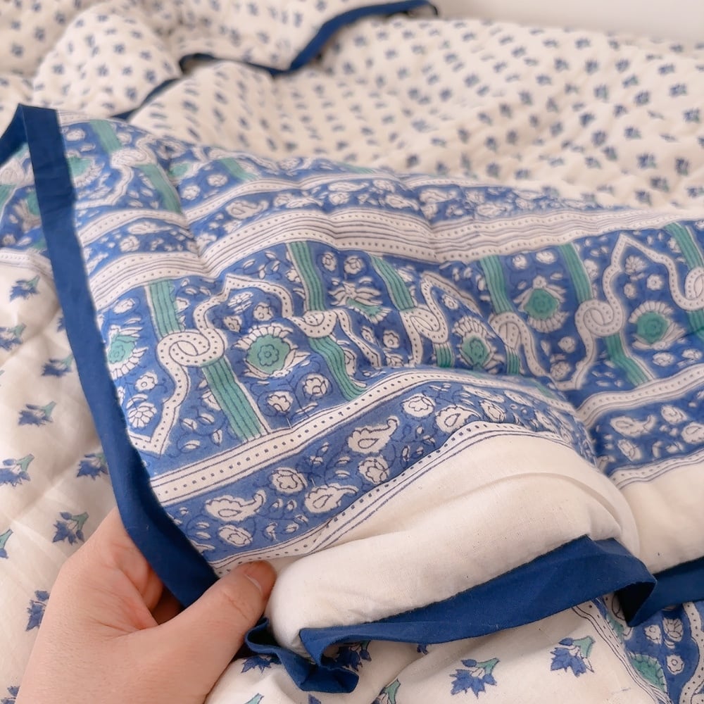 とても可愛らしいお花柄のブロックプリントの綿入りキルトです。