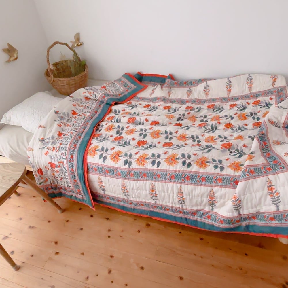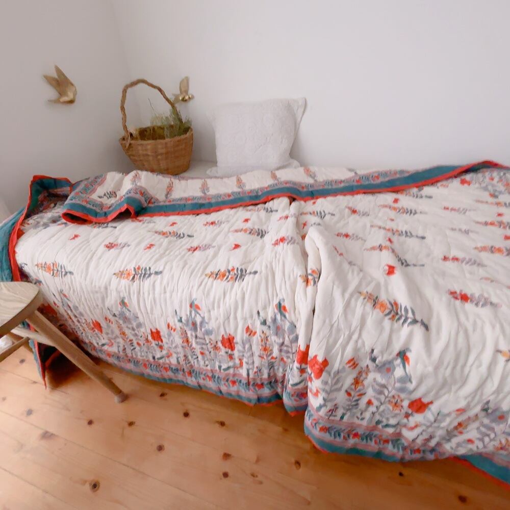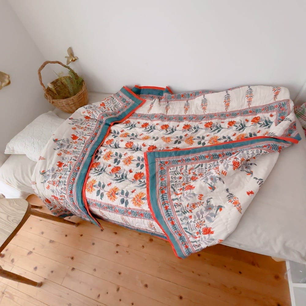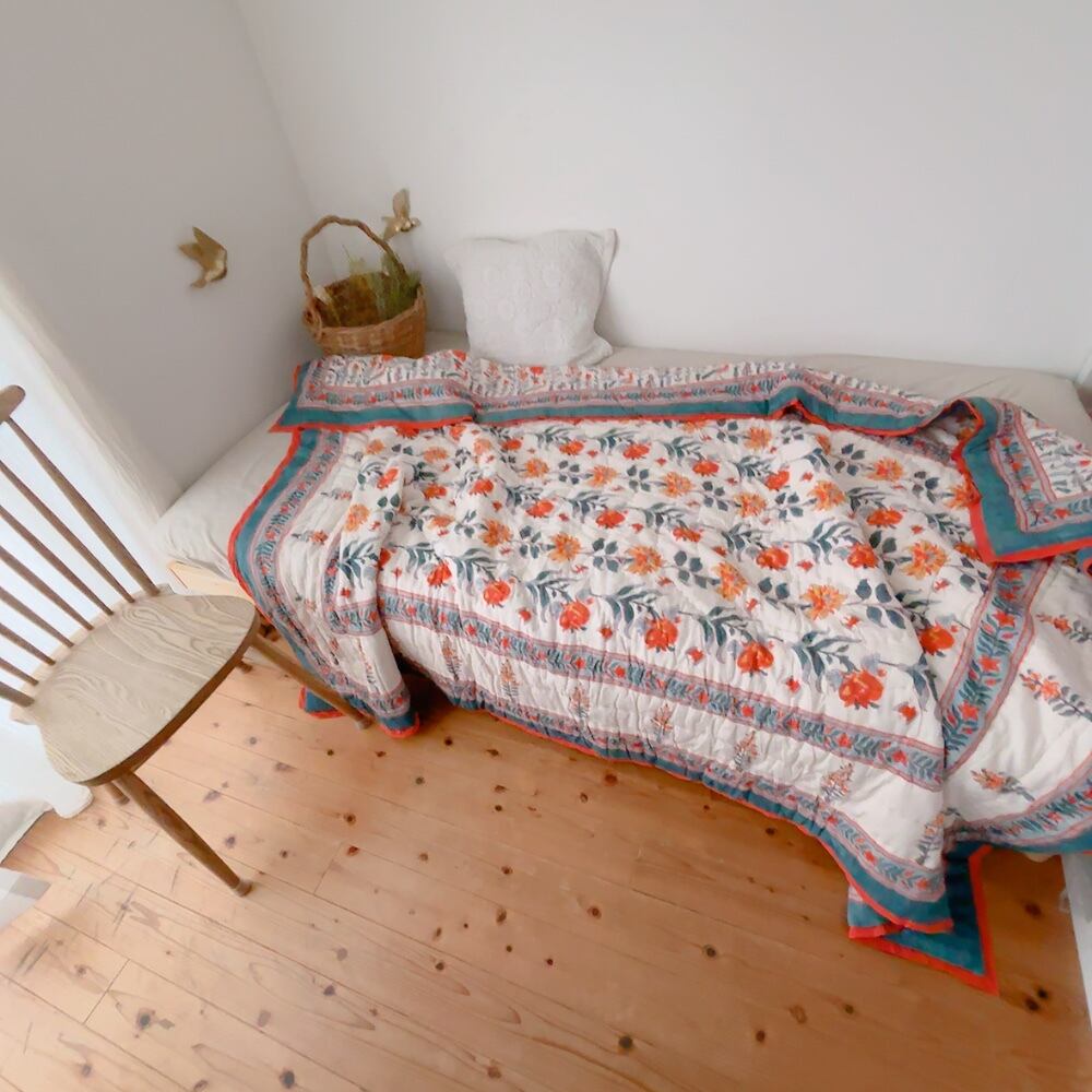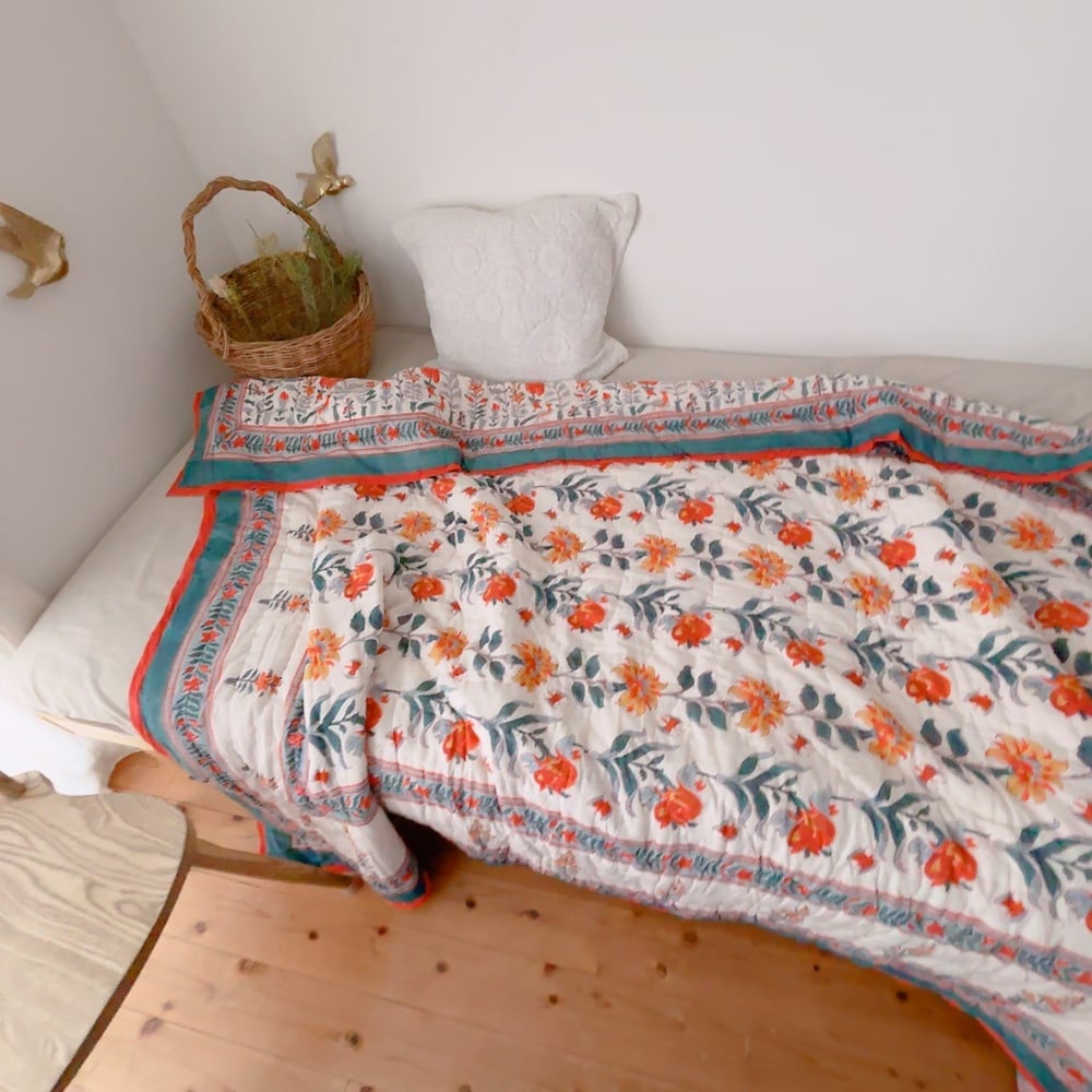 とても可愛らしいお花柄のブロックプリントの綿入りキルトです。