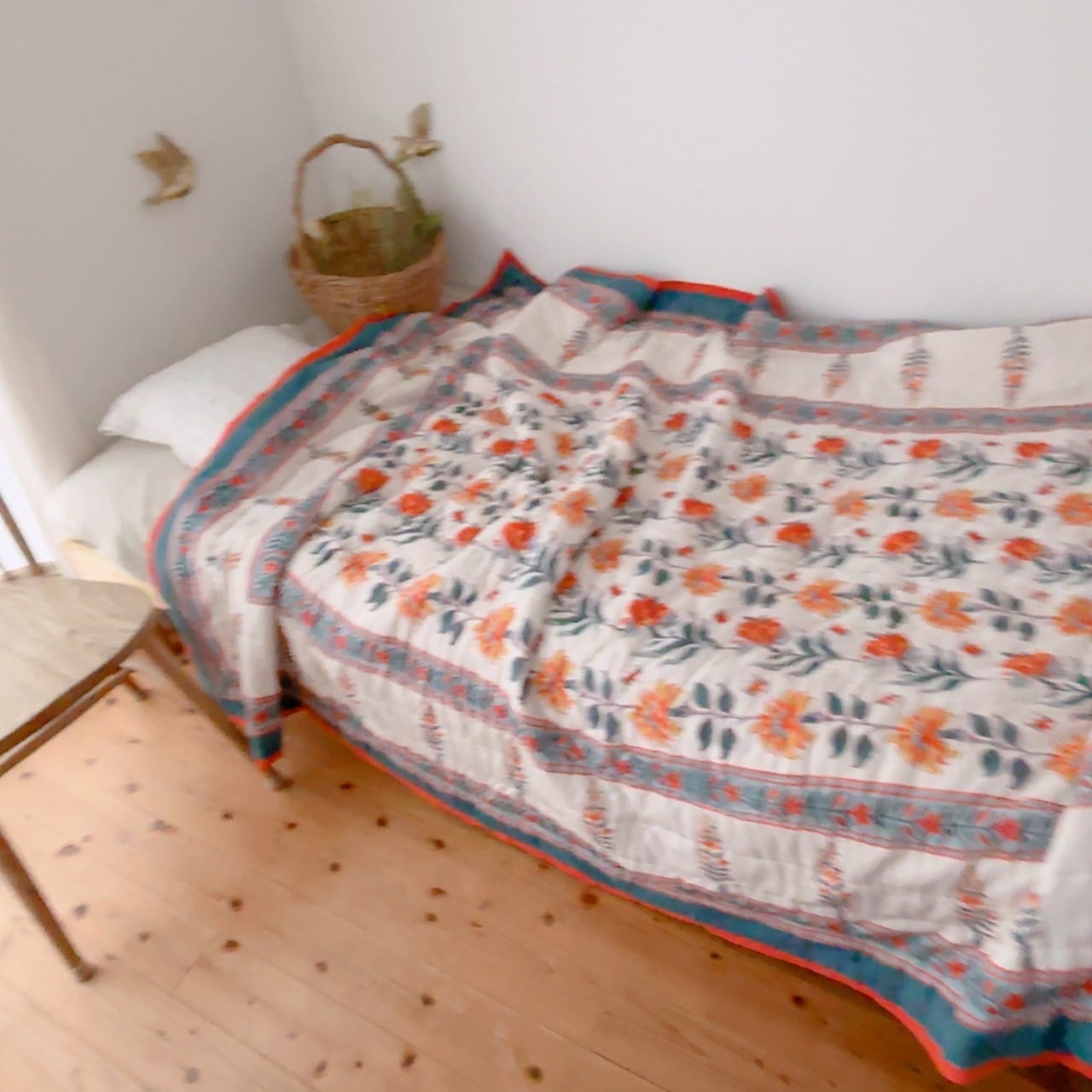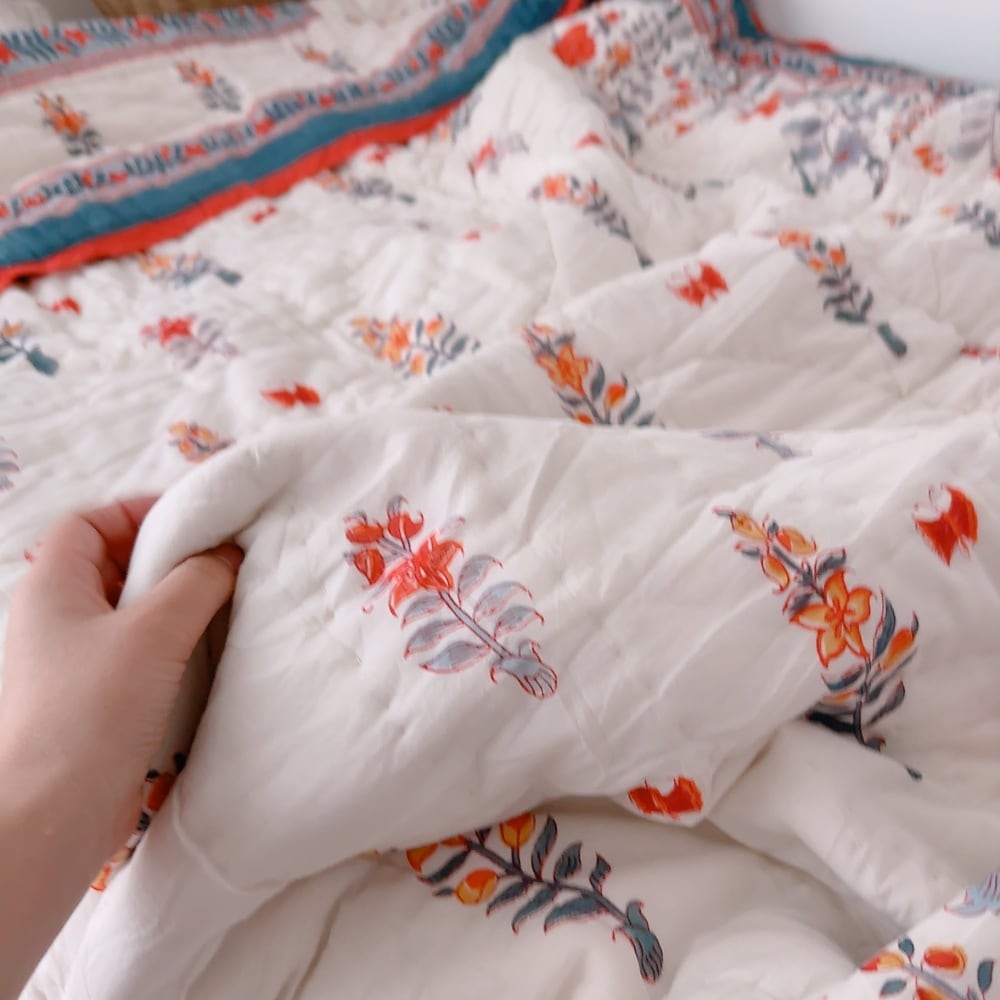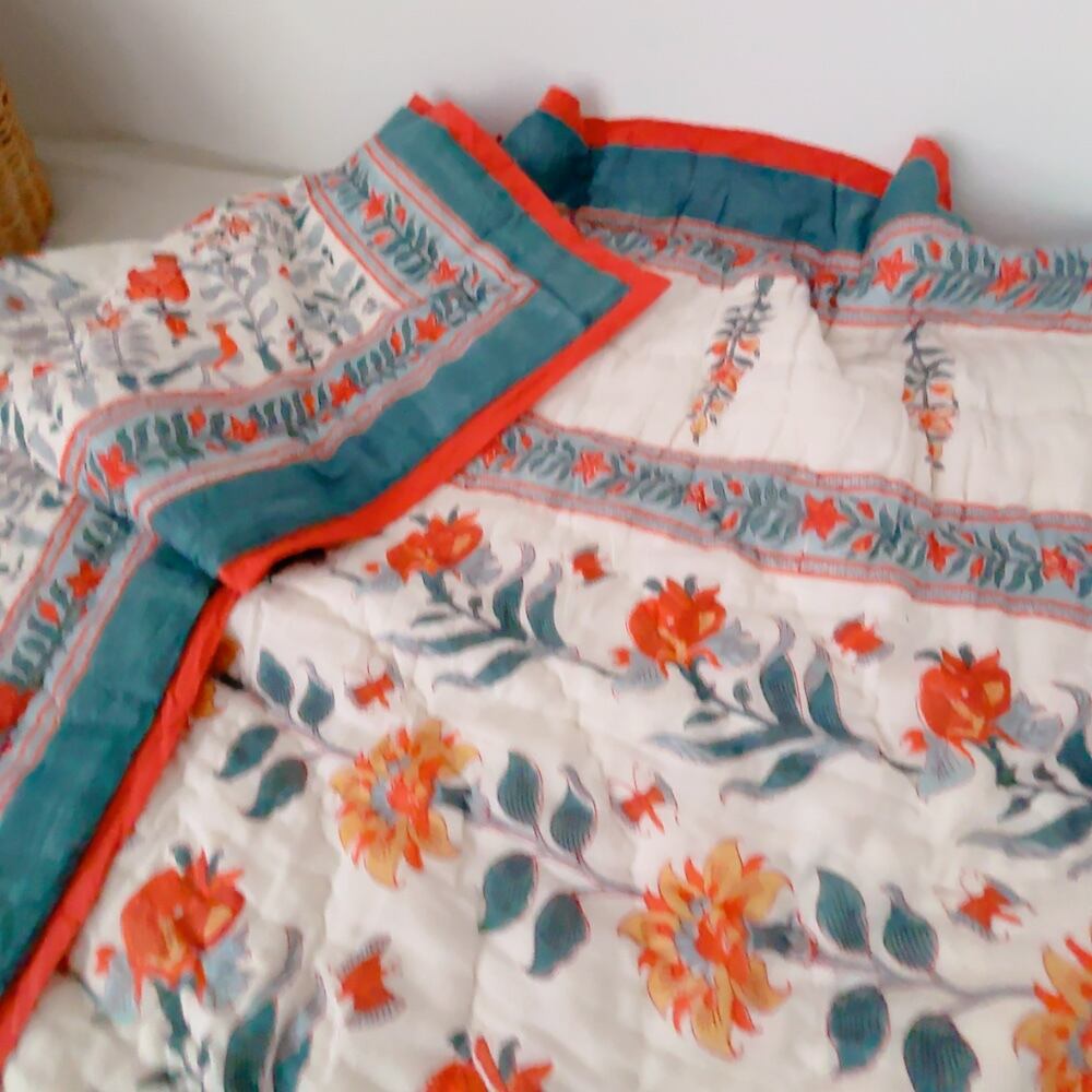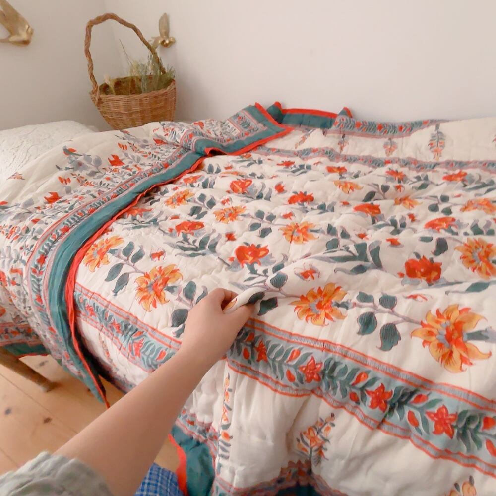 とても可愛らしいお花柄のブロックプリントの綿入りキルトです。