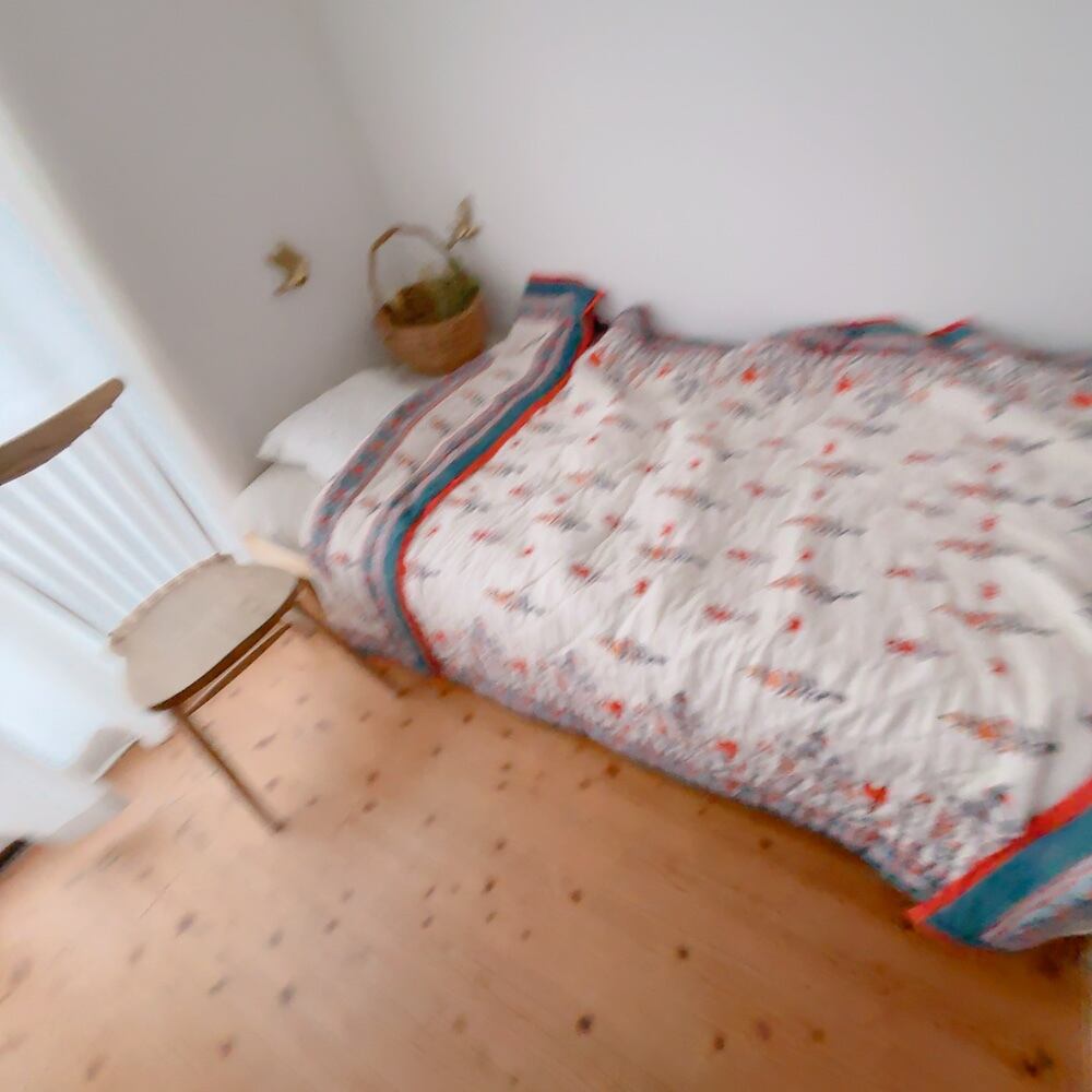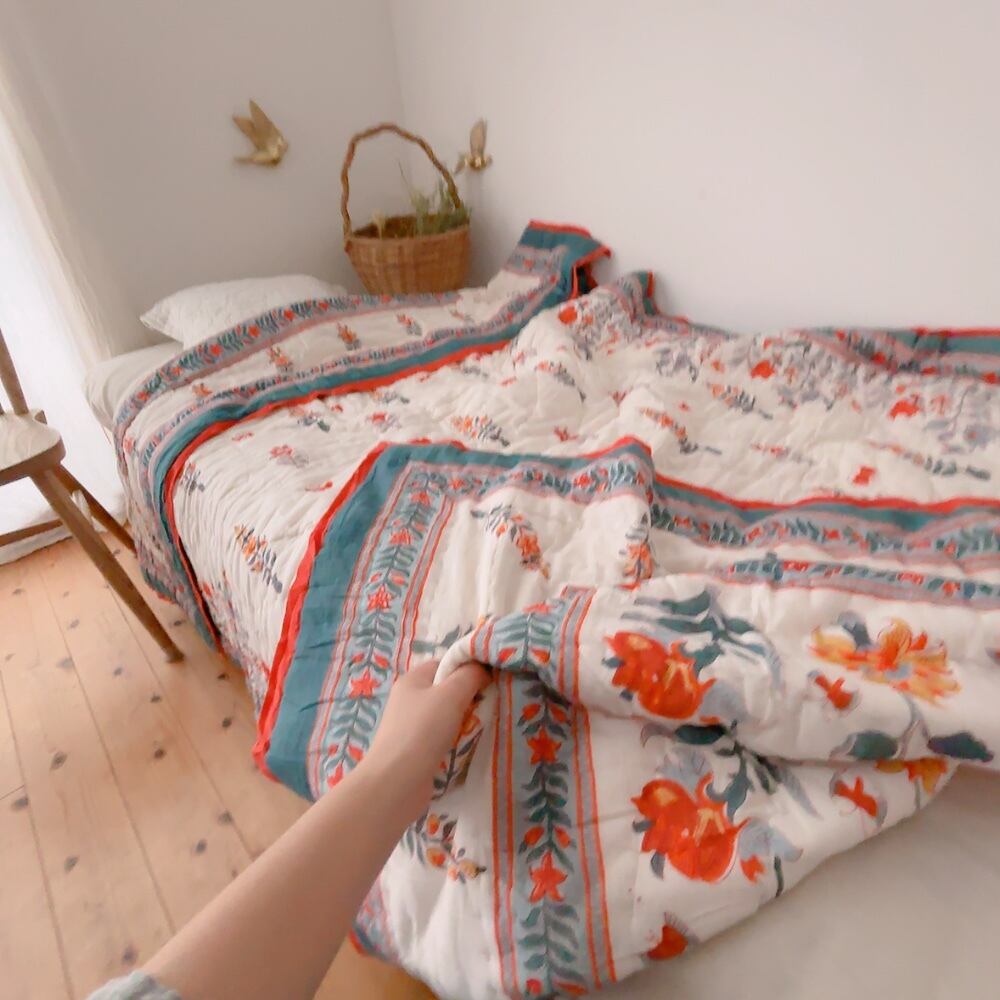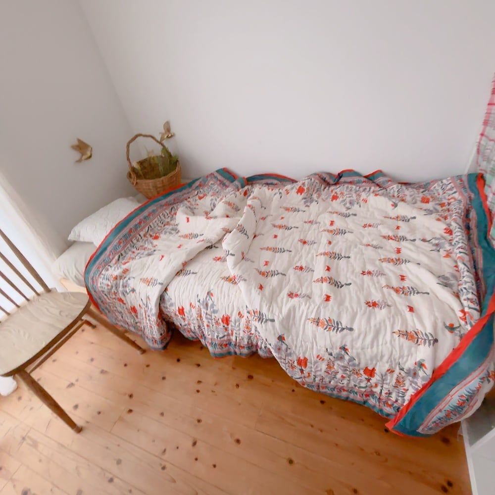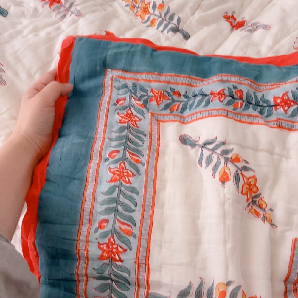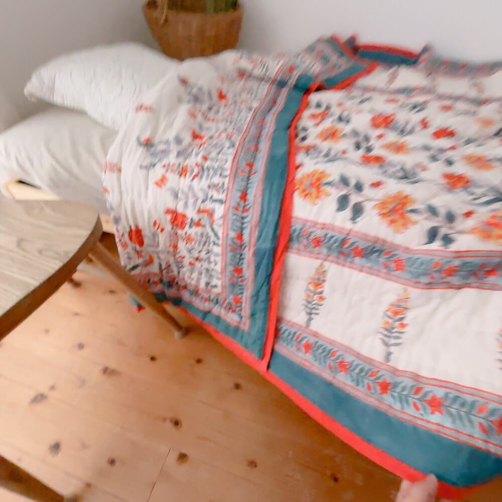 とても可愛らしいお花柄のブロックプリントの綿入りキルトです。