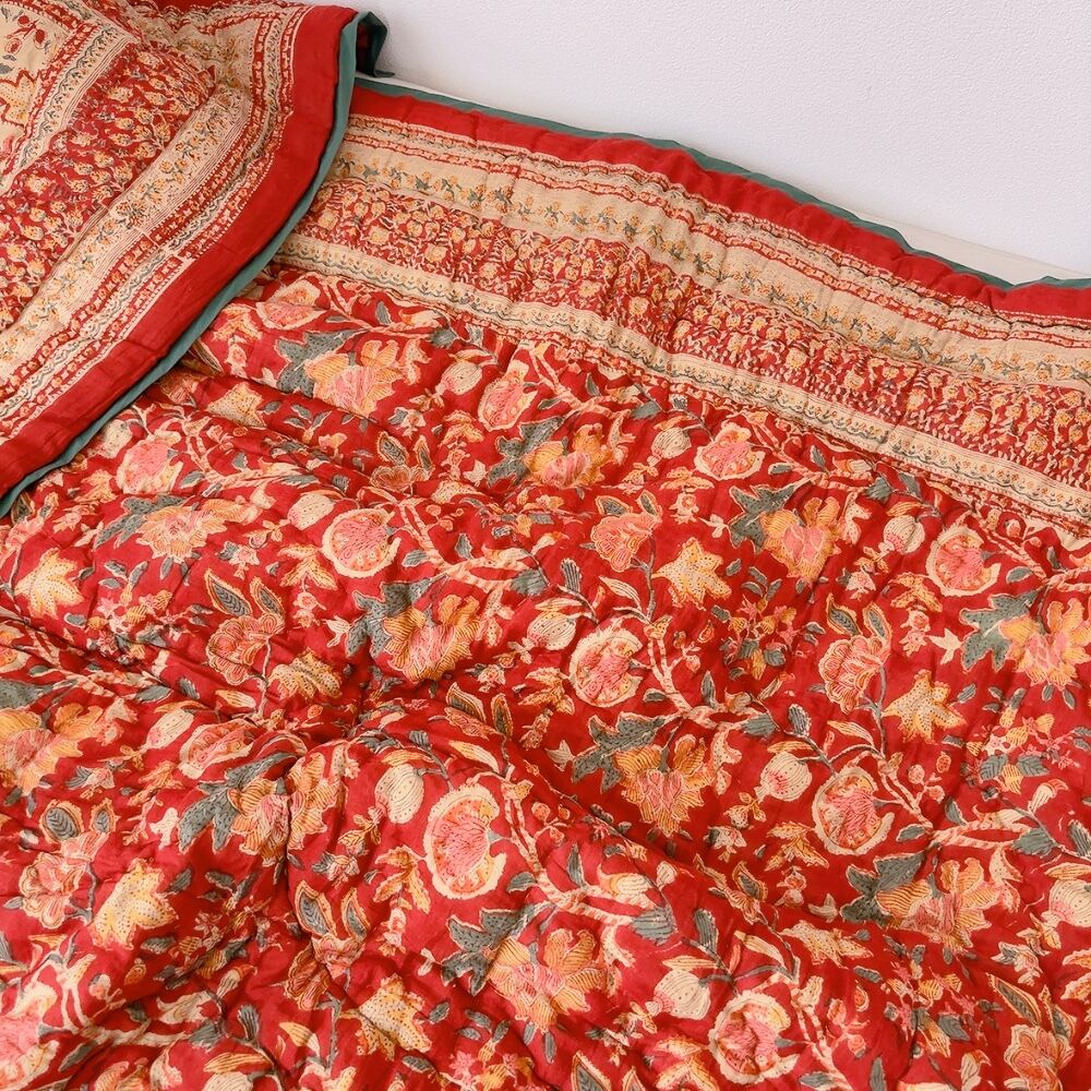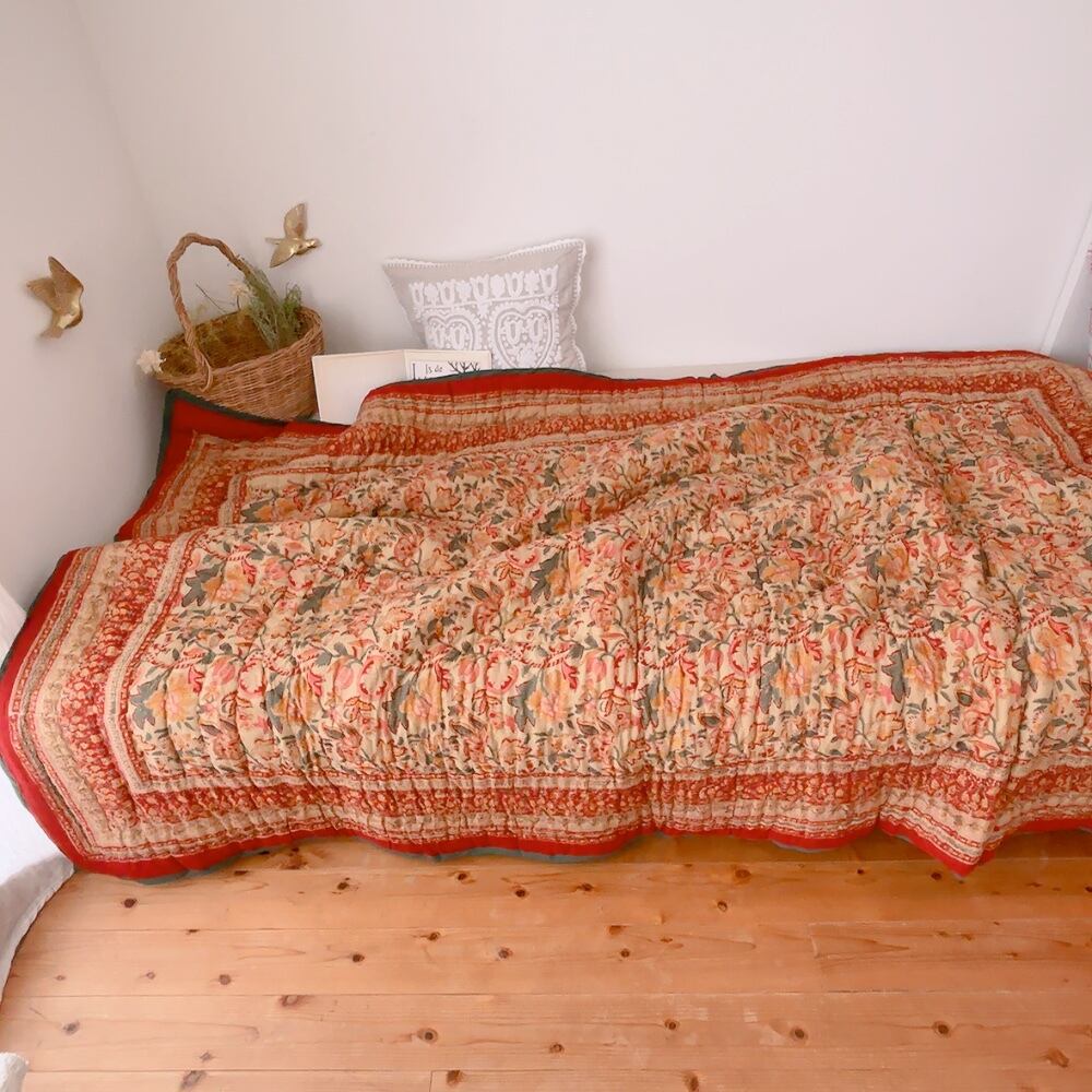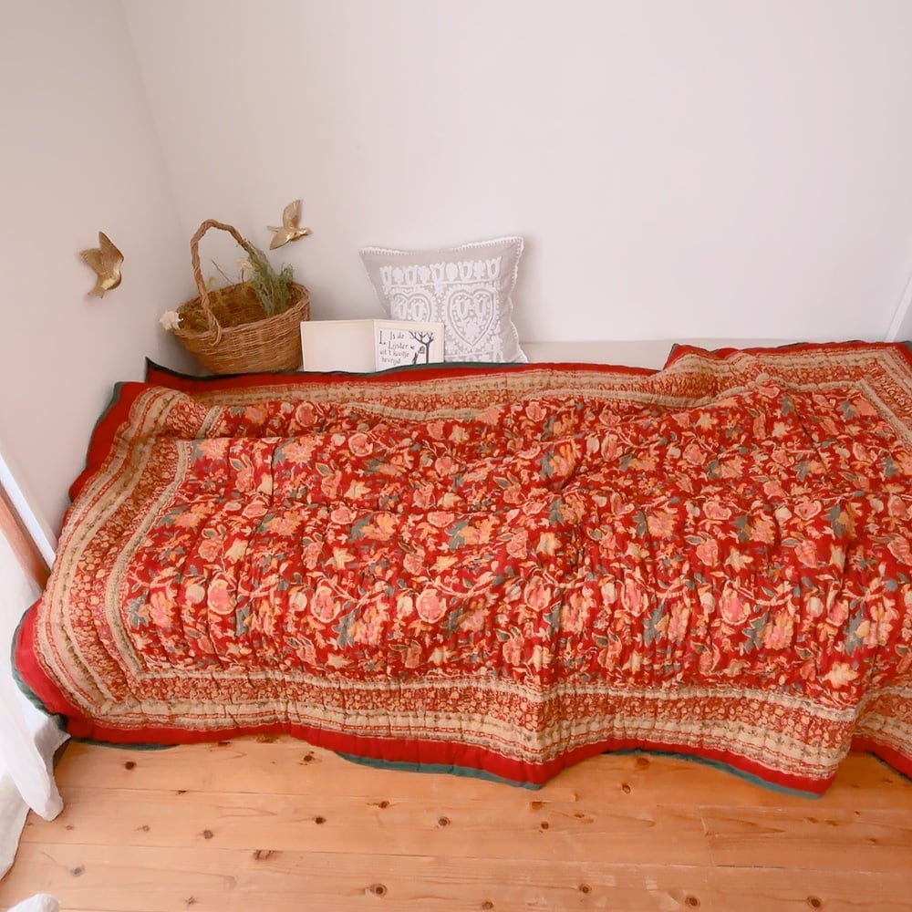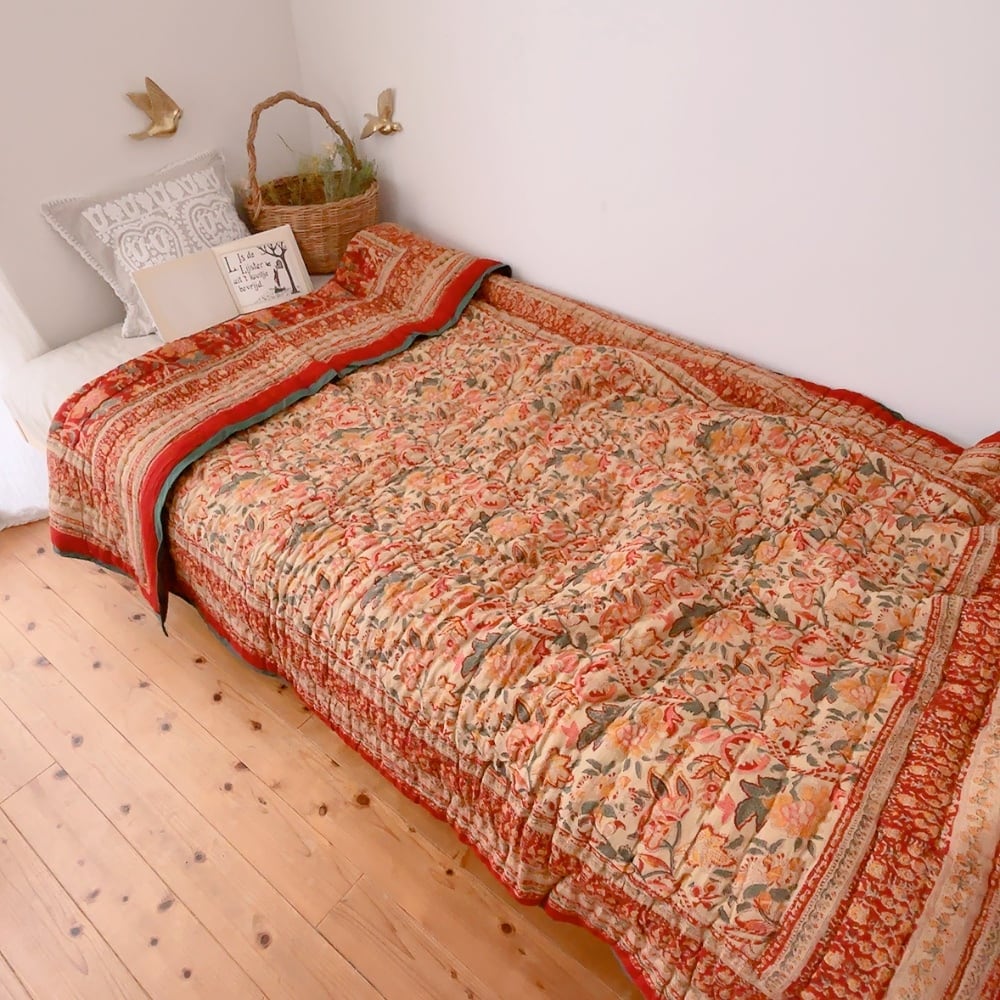 綿入り【M】レッドフラワー ブロックプリントキルト