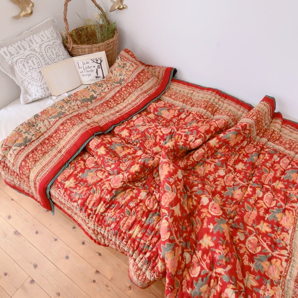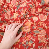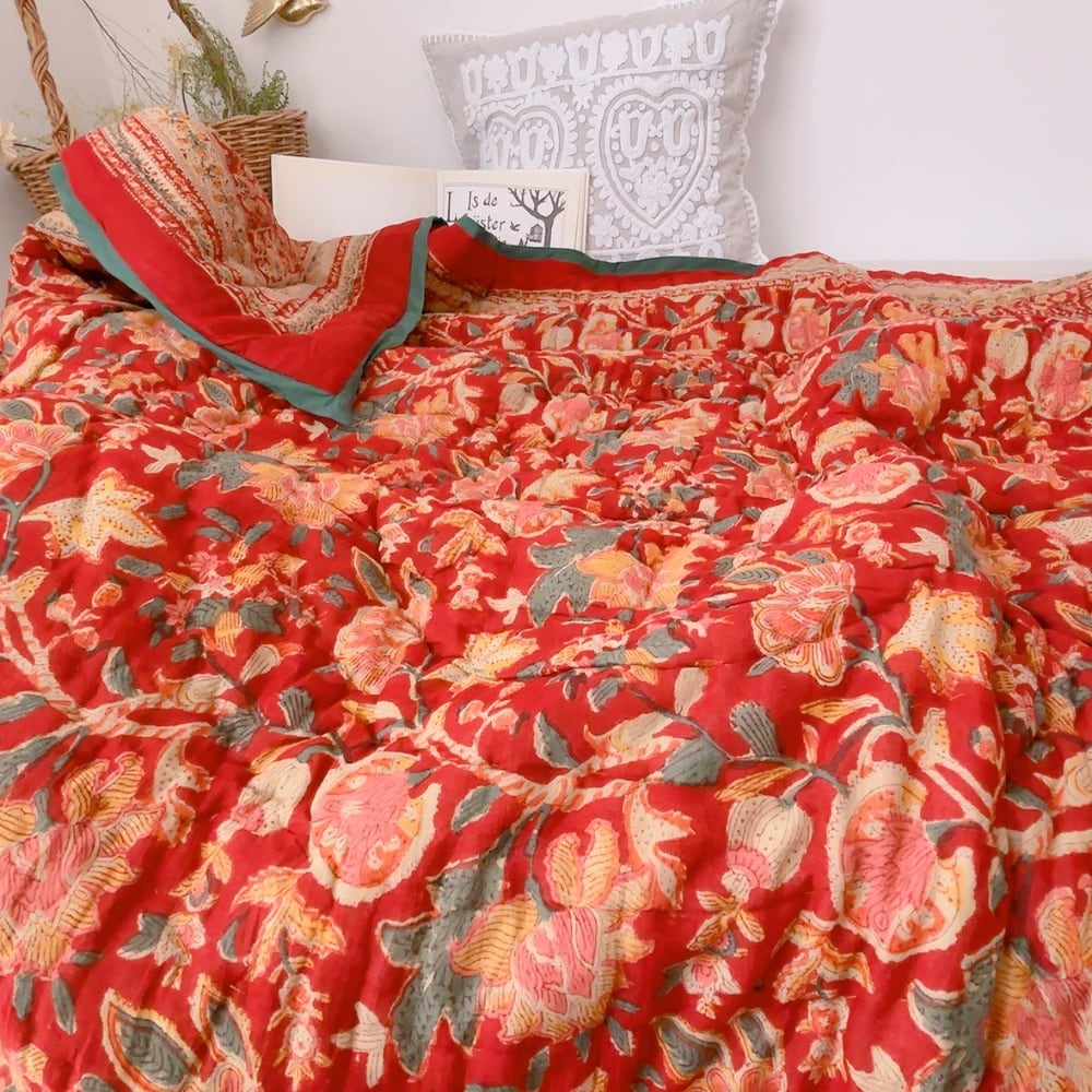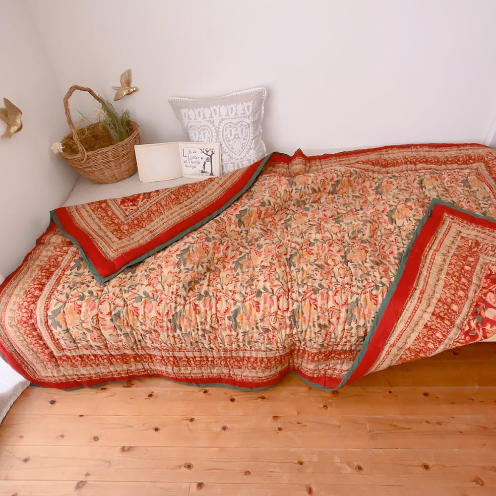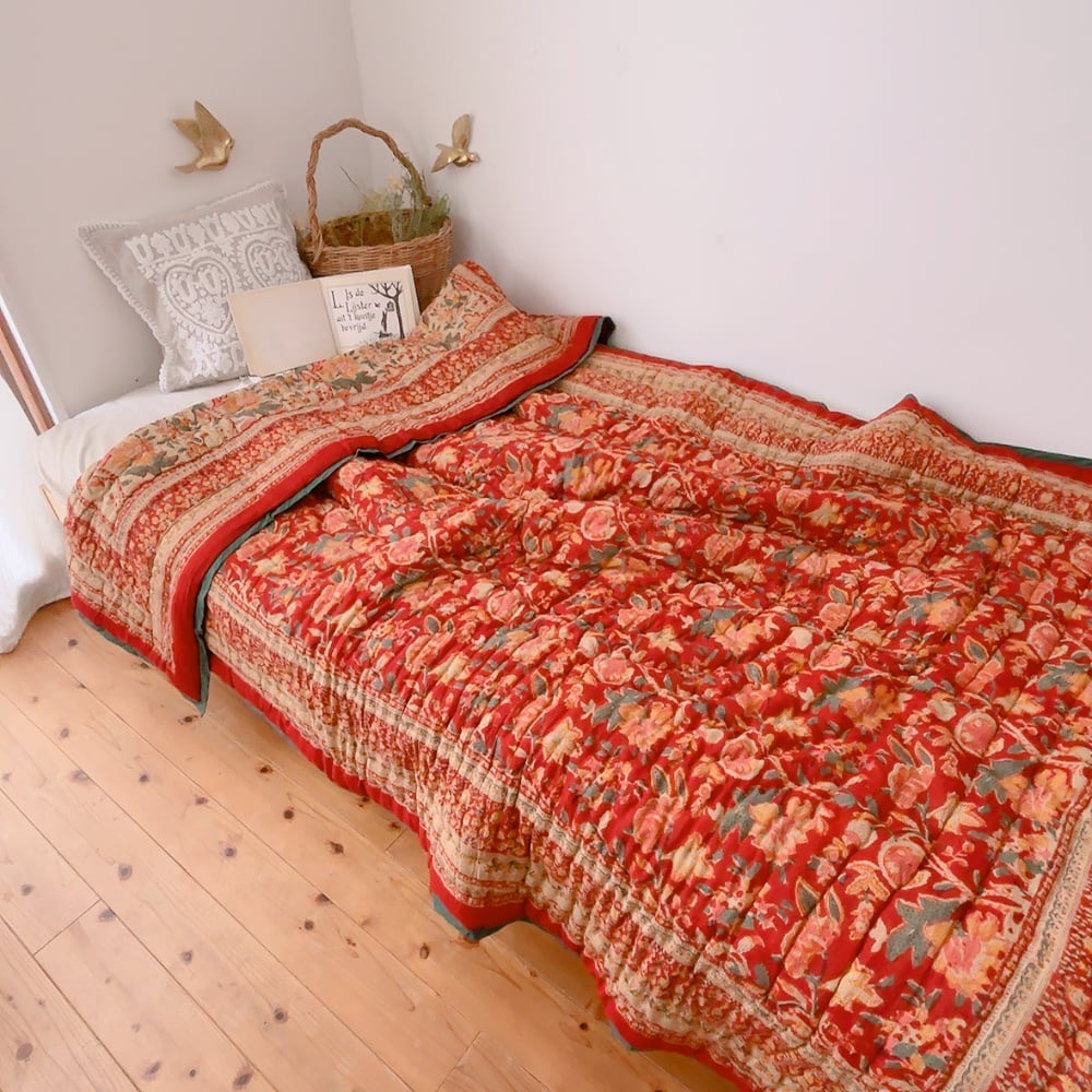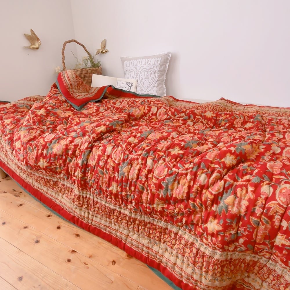 綿入り【M】レッドフラワー ブロックプリントキルト