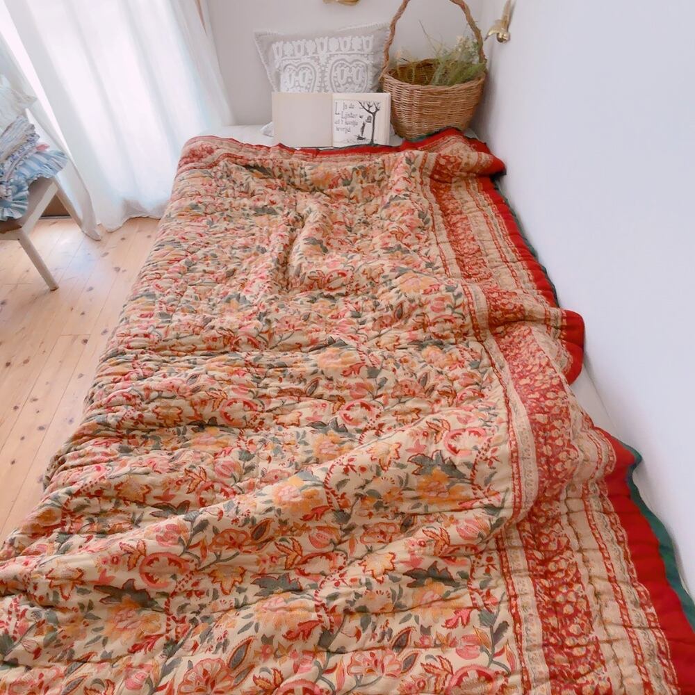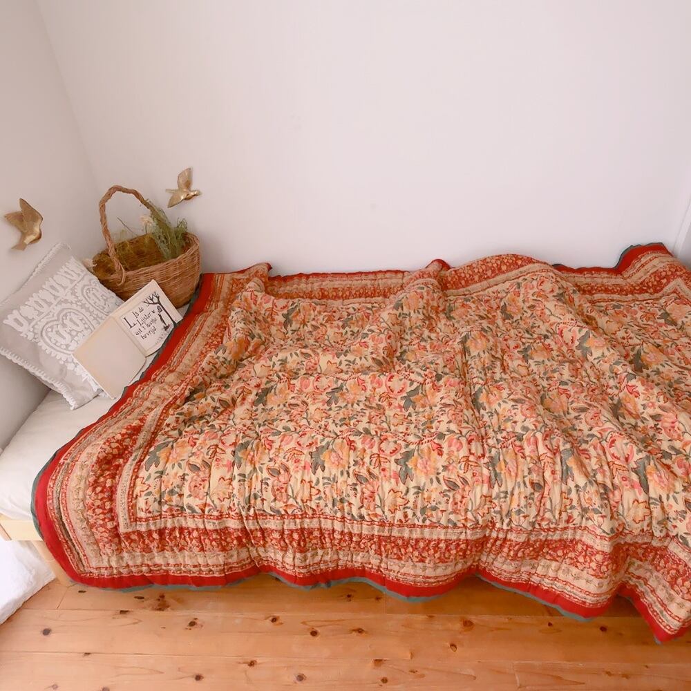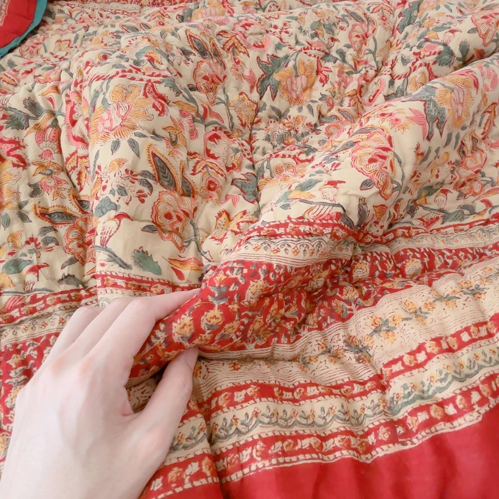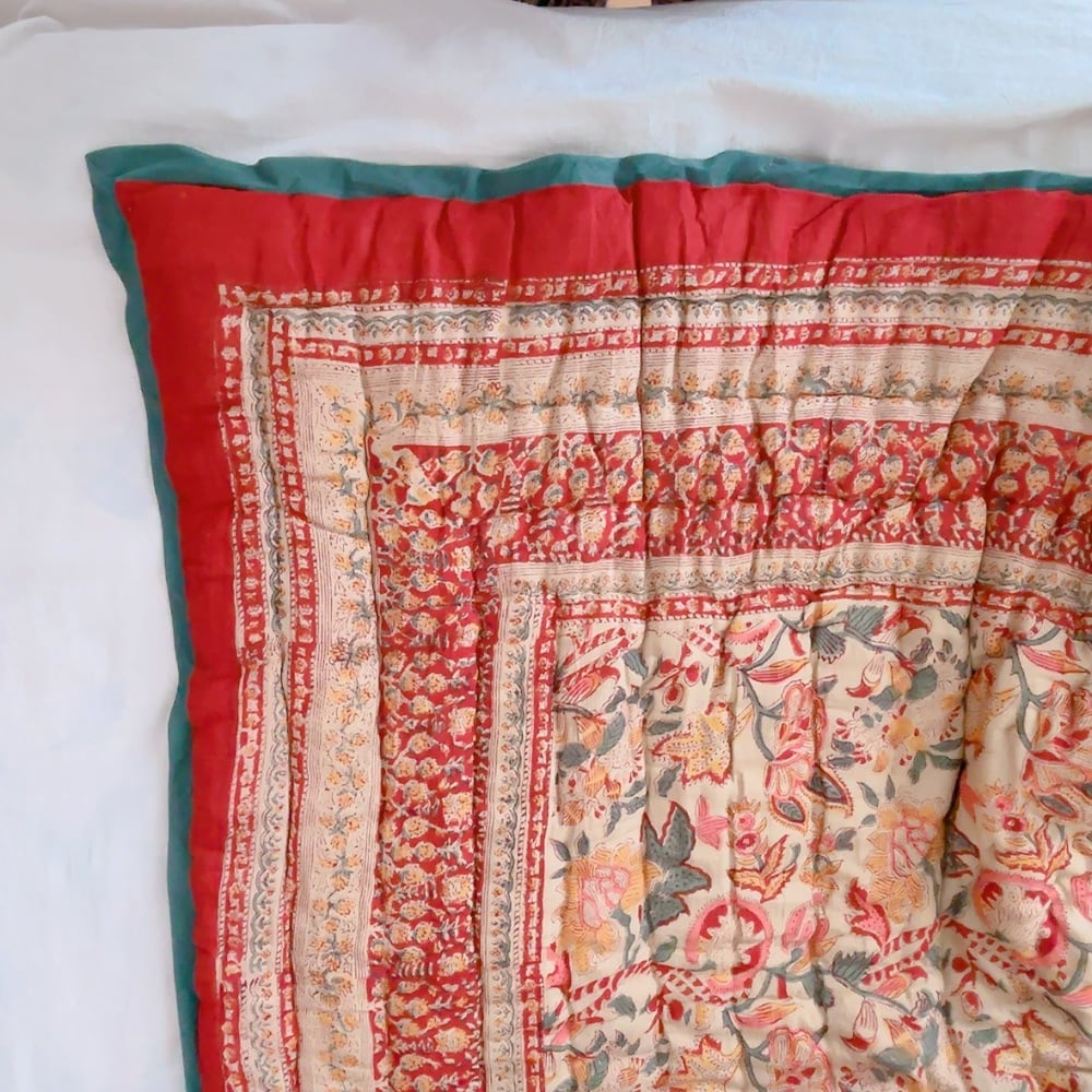 綿入り【M】レッドフラワー ブロックプリントキルト