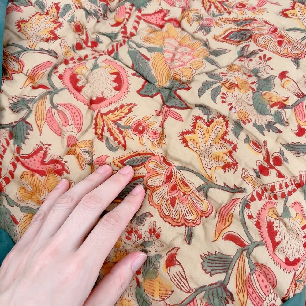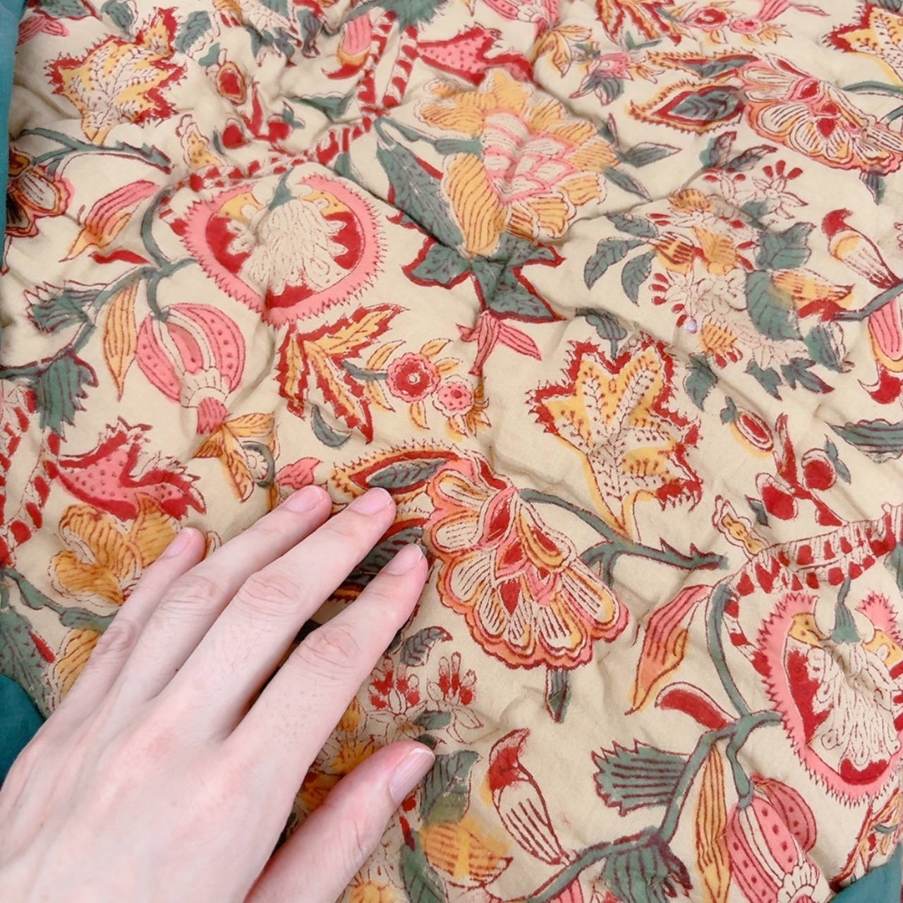 とても可愛らしいお花柄のブロックプリントの綿入りキルトです。