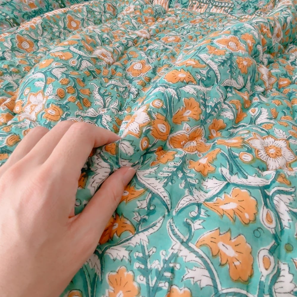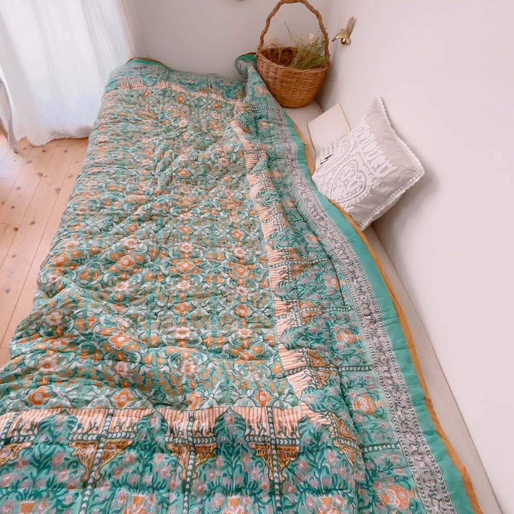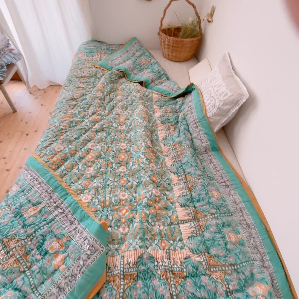 【予約販売】綿入り【M】グリーンオレンジ小花 ブロックプリントキルト