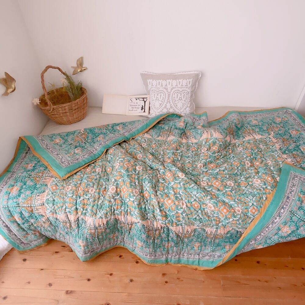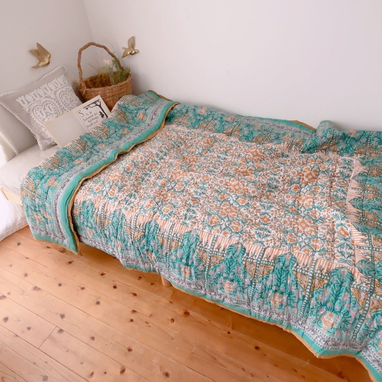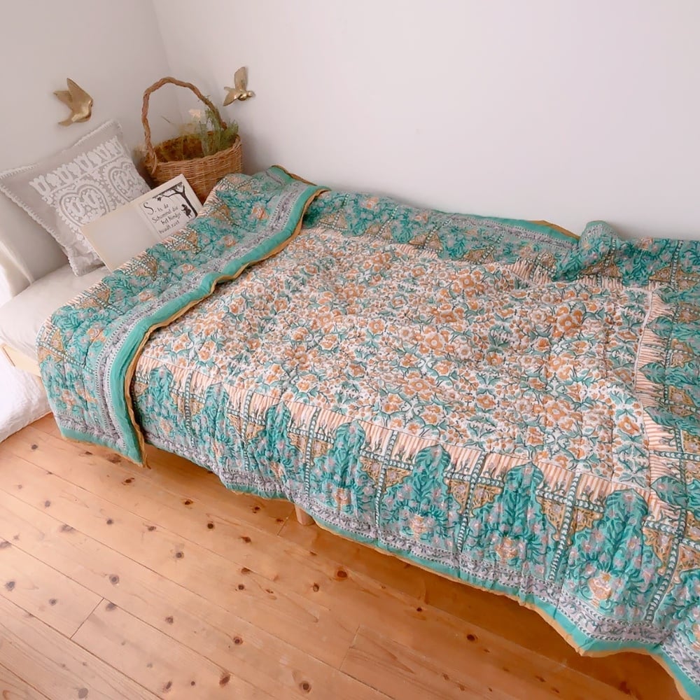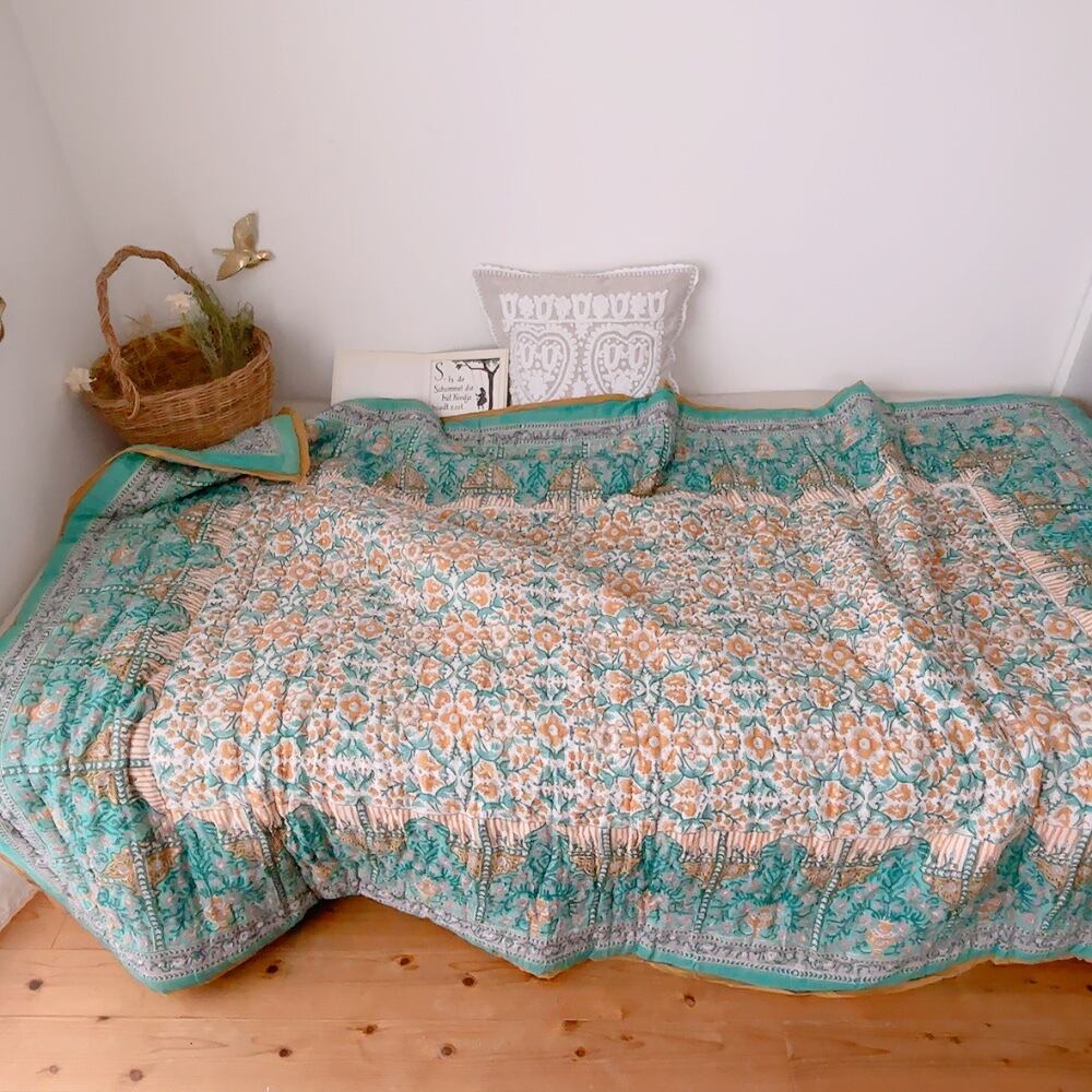 とても可愛らしいお花柄のブロックプリントの綿入りキルトです。