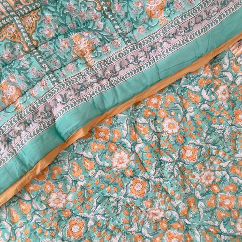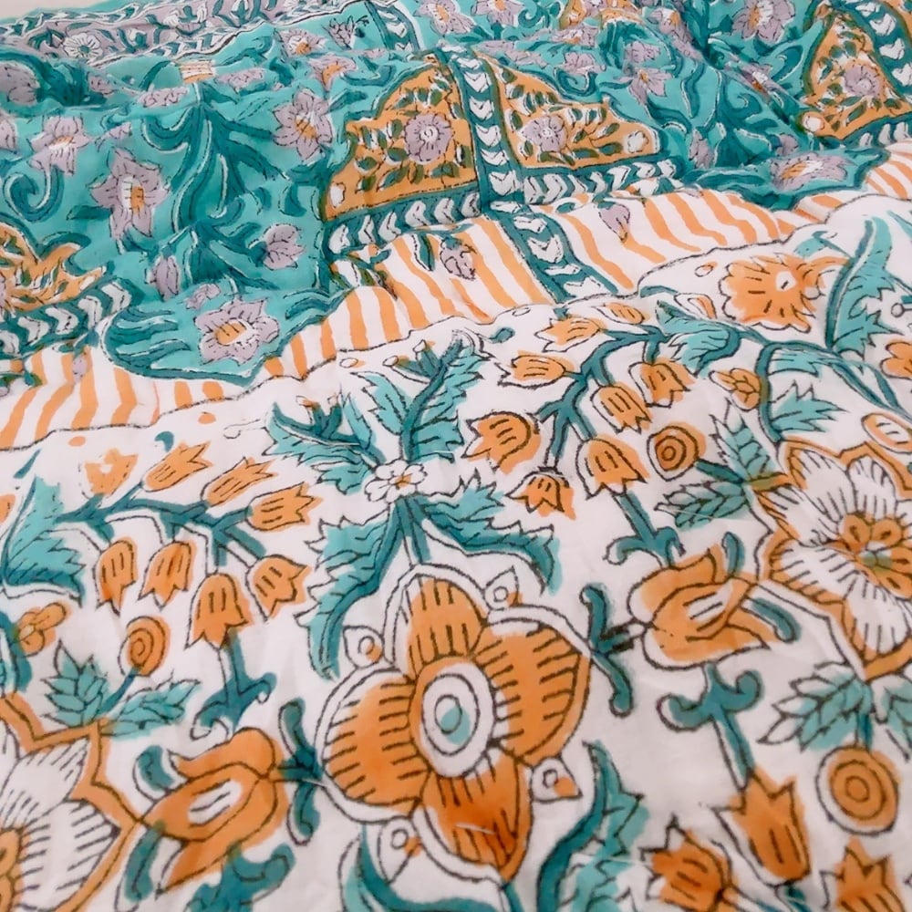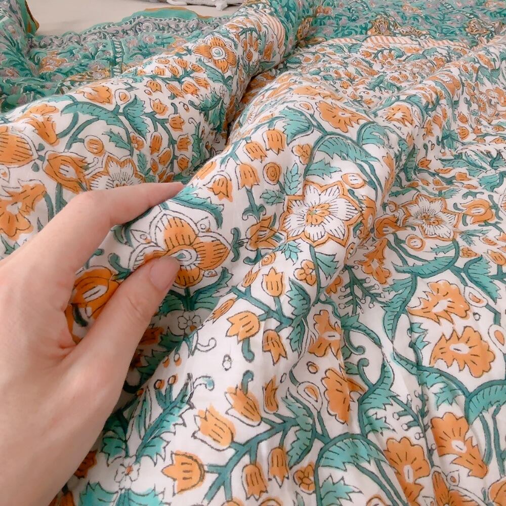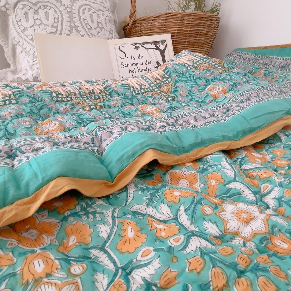 とても可愛らしいお花柄のブロックプリントの綿入りキルトです。