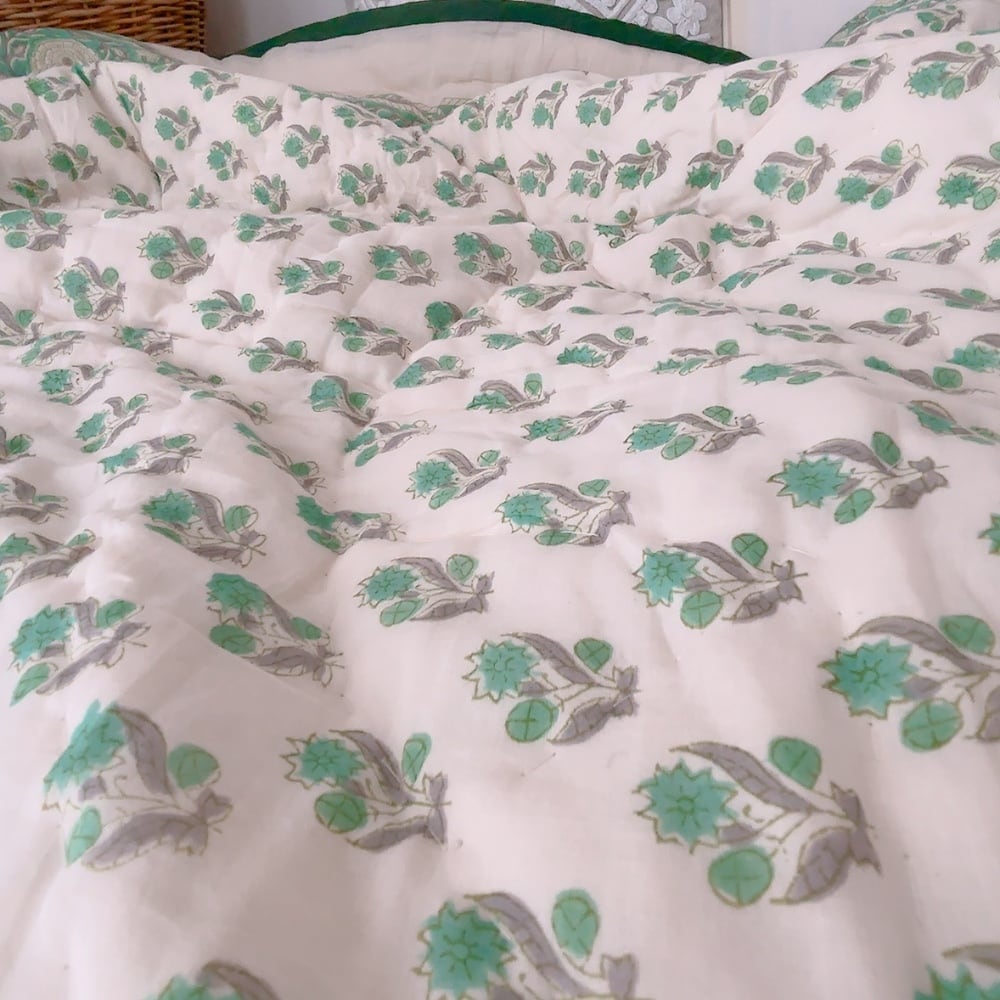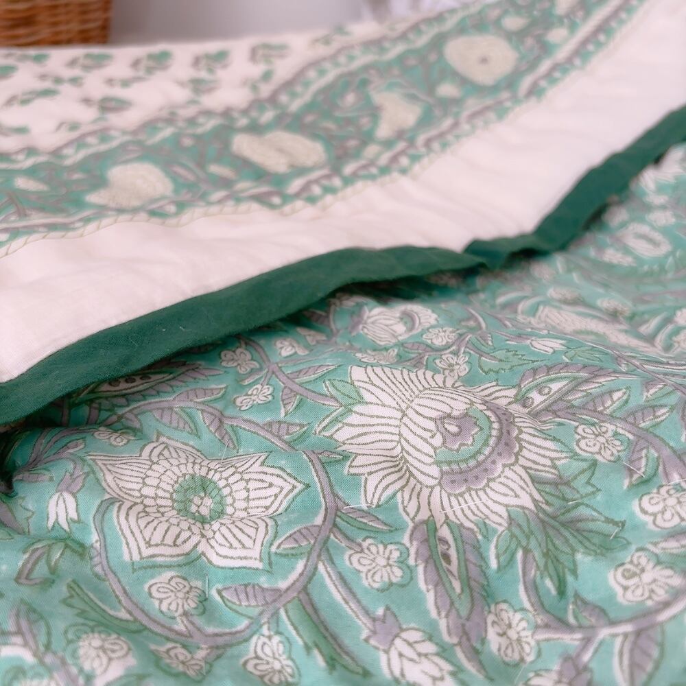 とてもエレガントなお花柄のブロックプリントの綿入りキルトです。