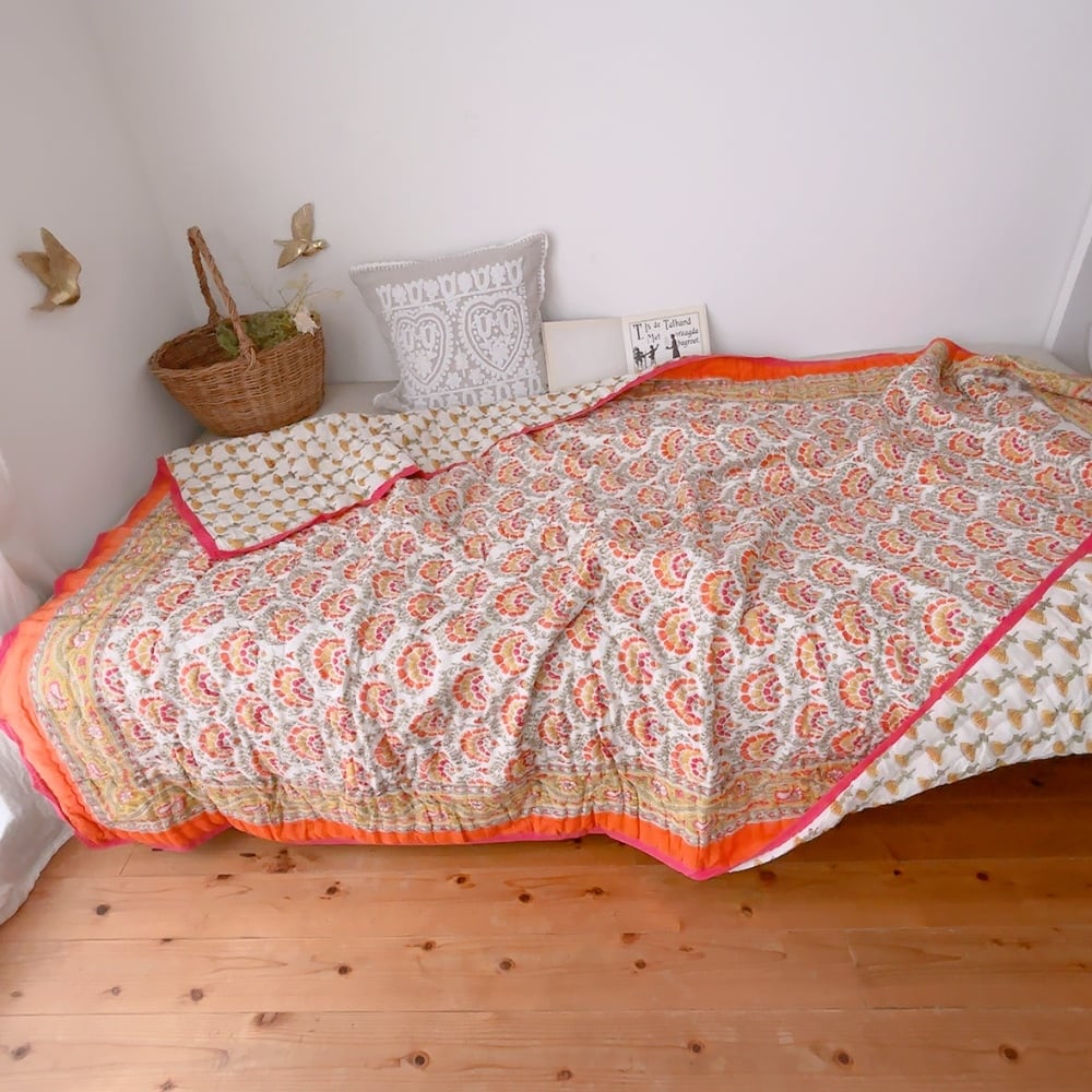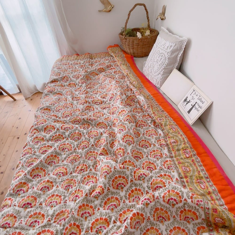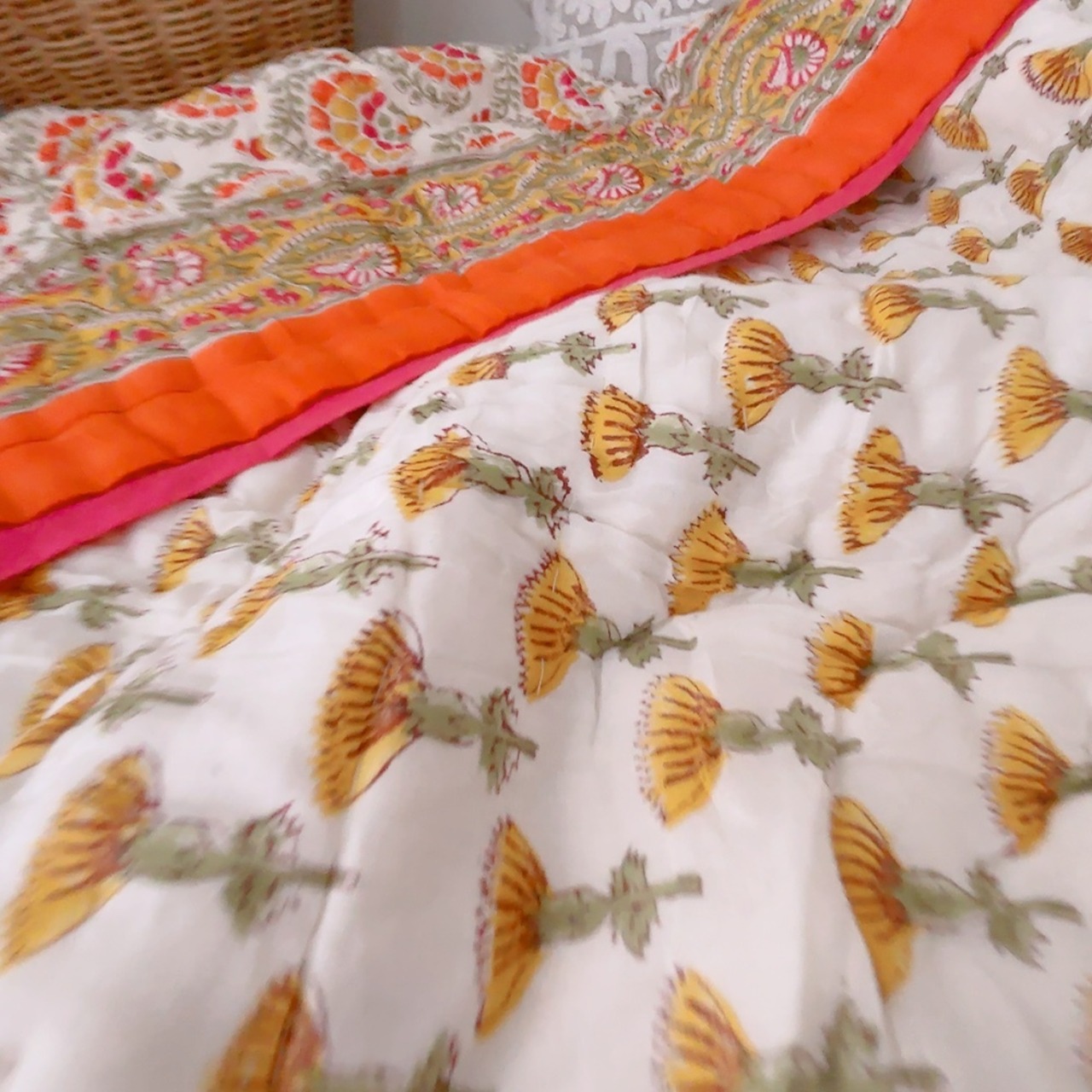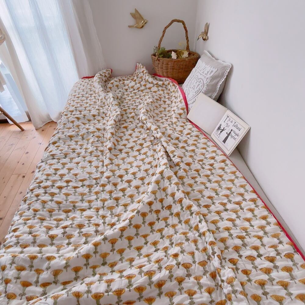 とても可愛らしいお花柄のブロックプリントの綿入りキルトです。