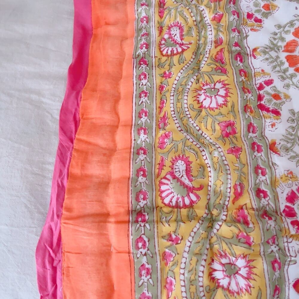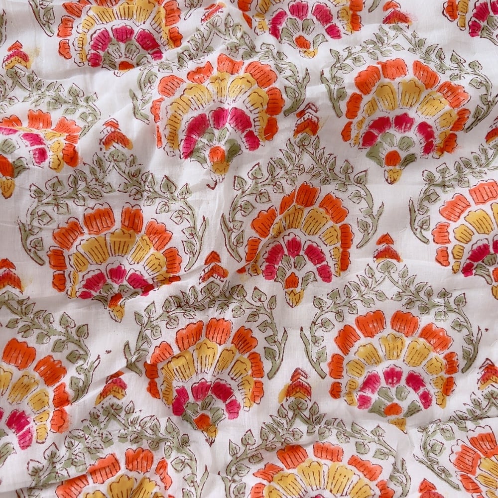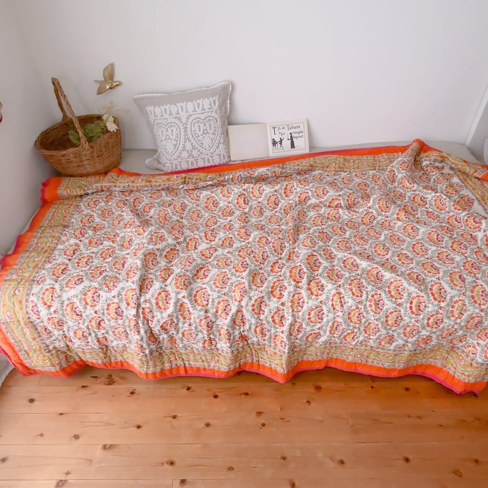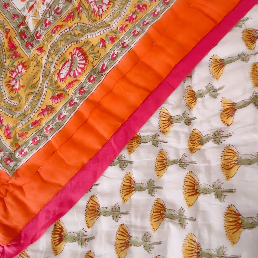とても可愛らしいお花柄のブロックプリントの綿入りキルトです。