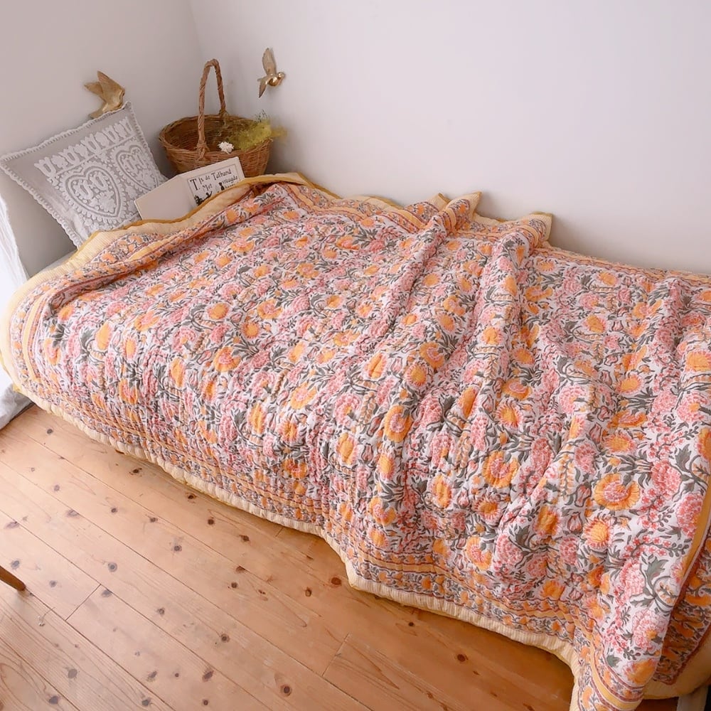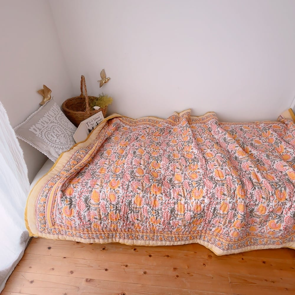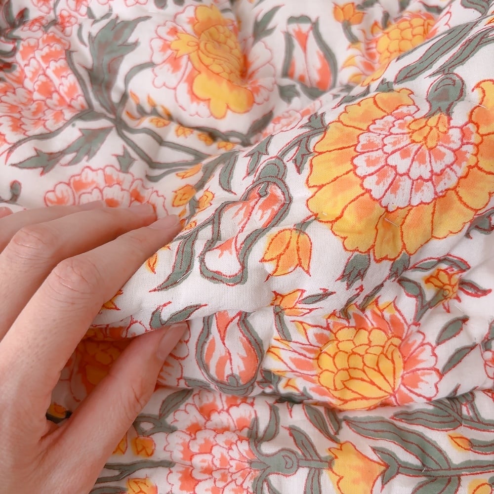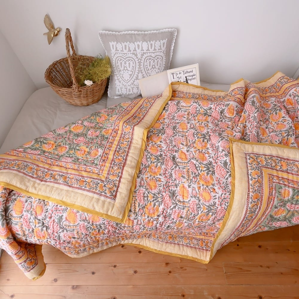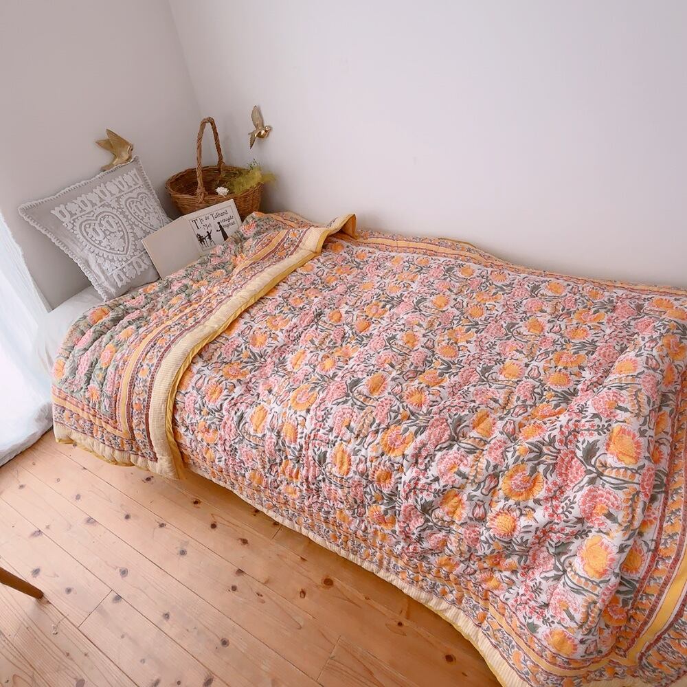 【予約販売】綿入り【M】イエローフラワー ブロックプリントキルト