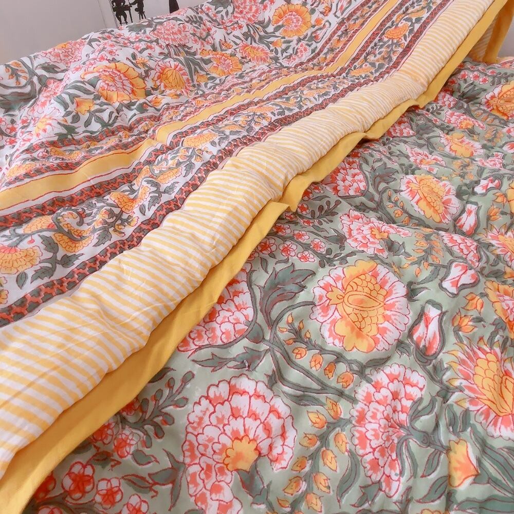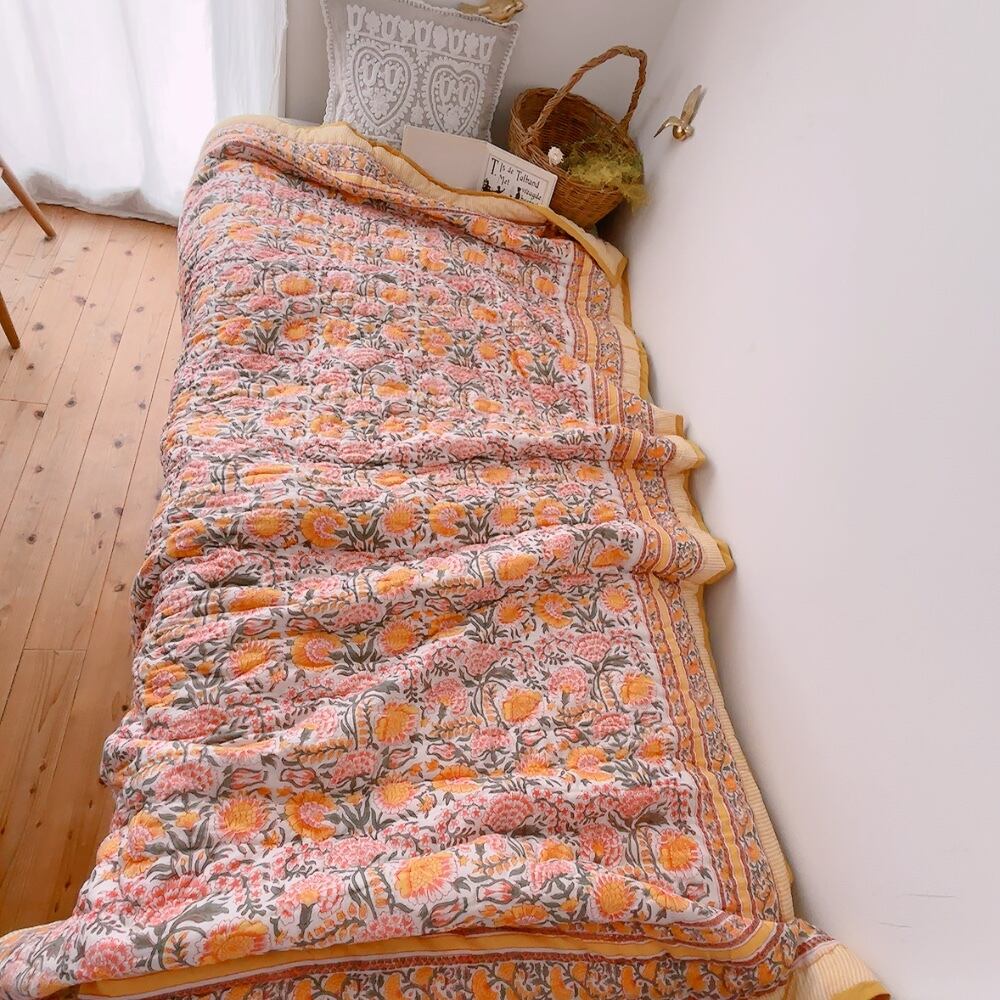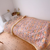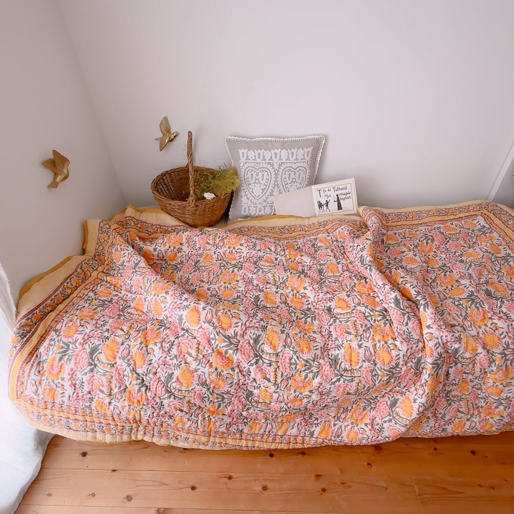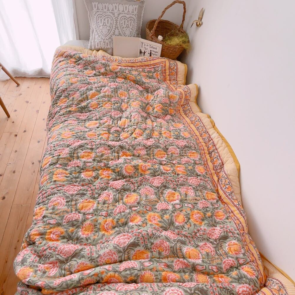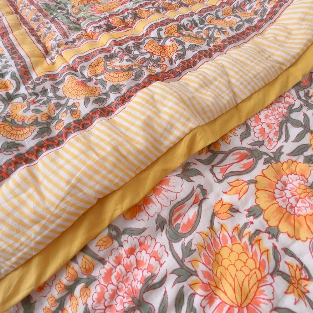 【予約販売】綿入り【M】イエローフラワー ブロックプリントキルト