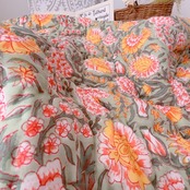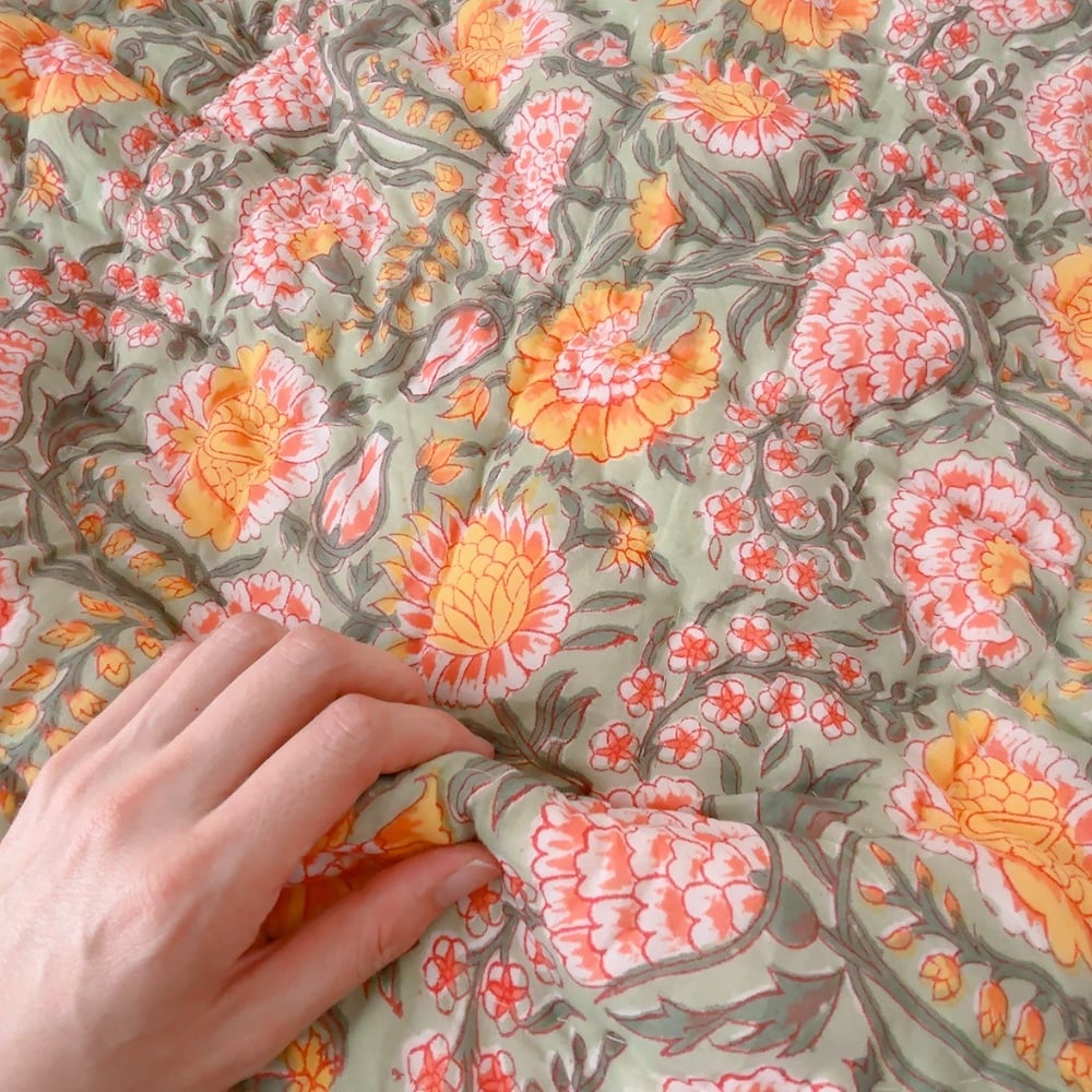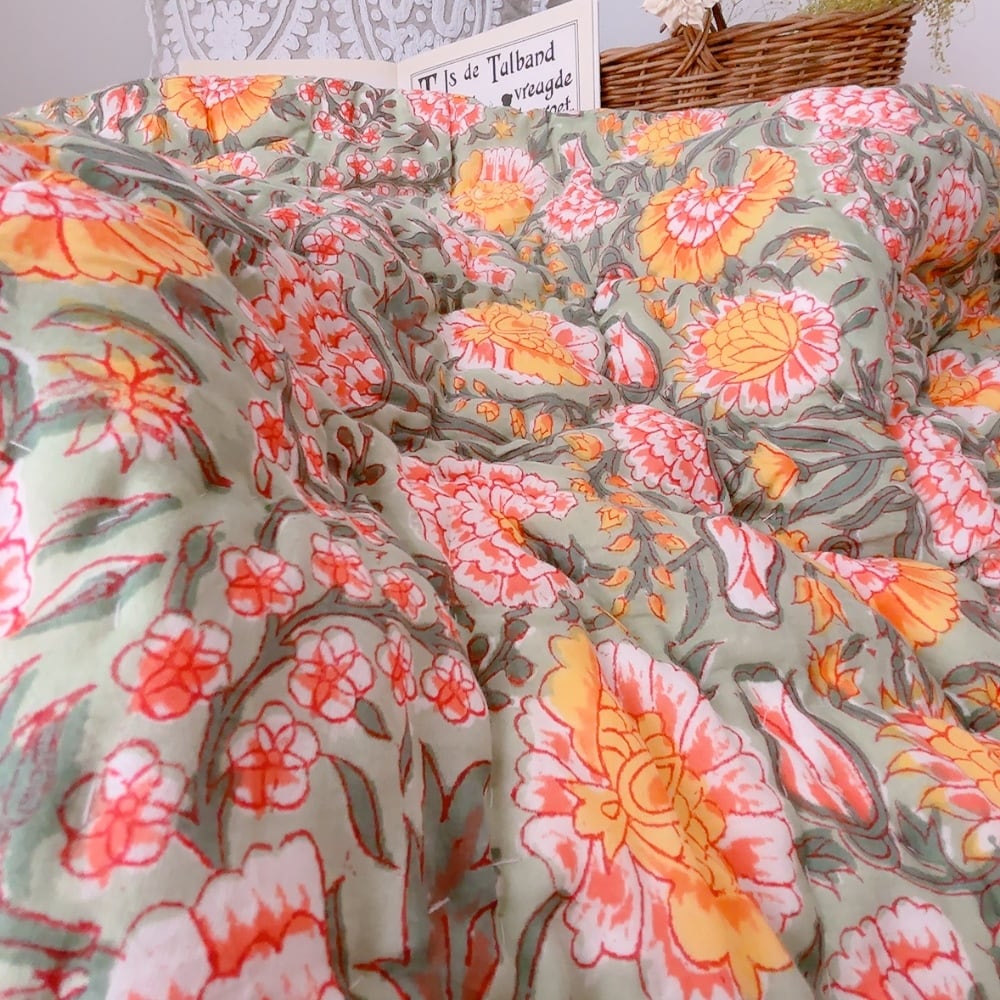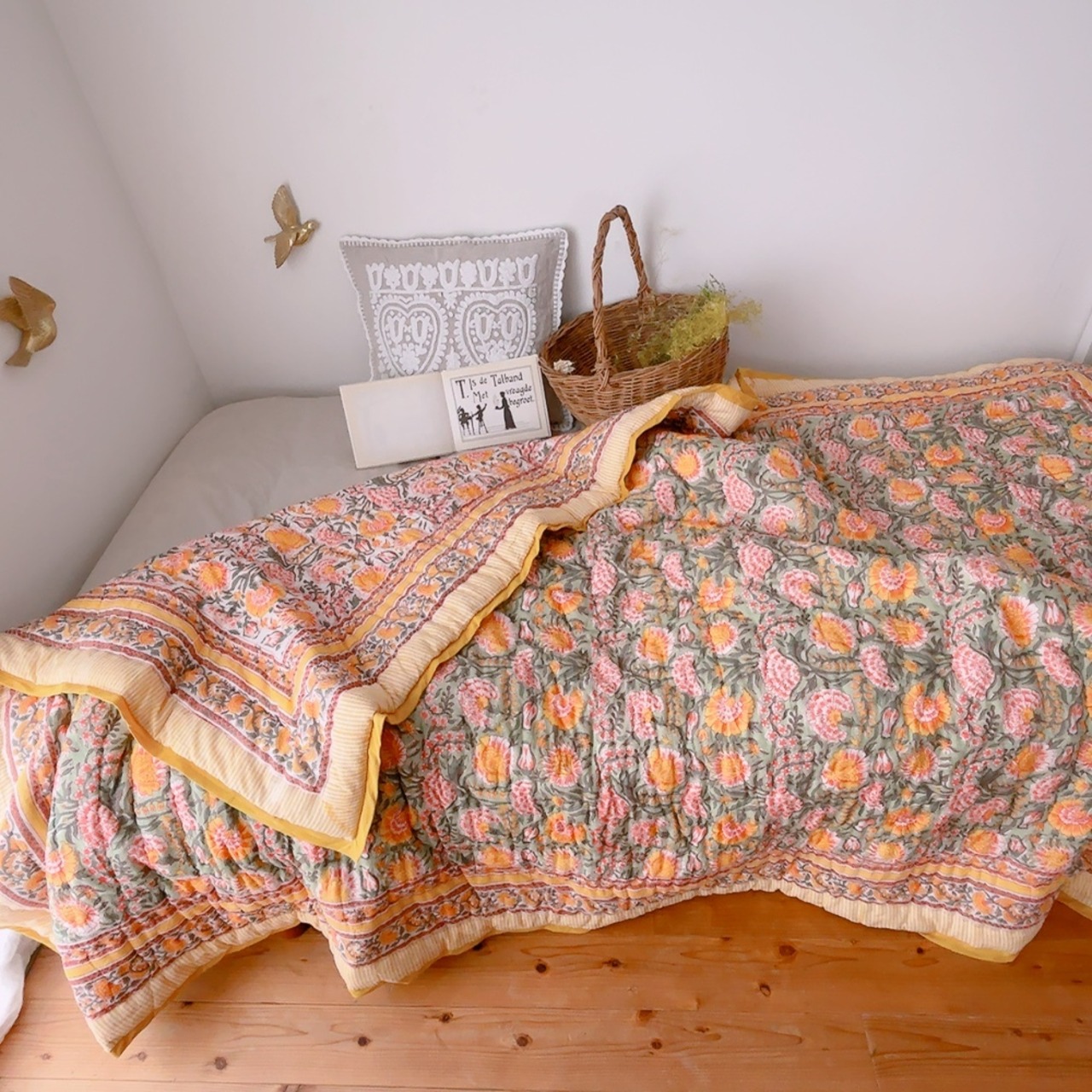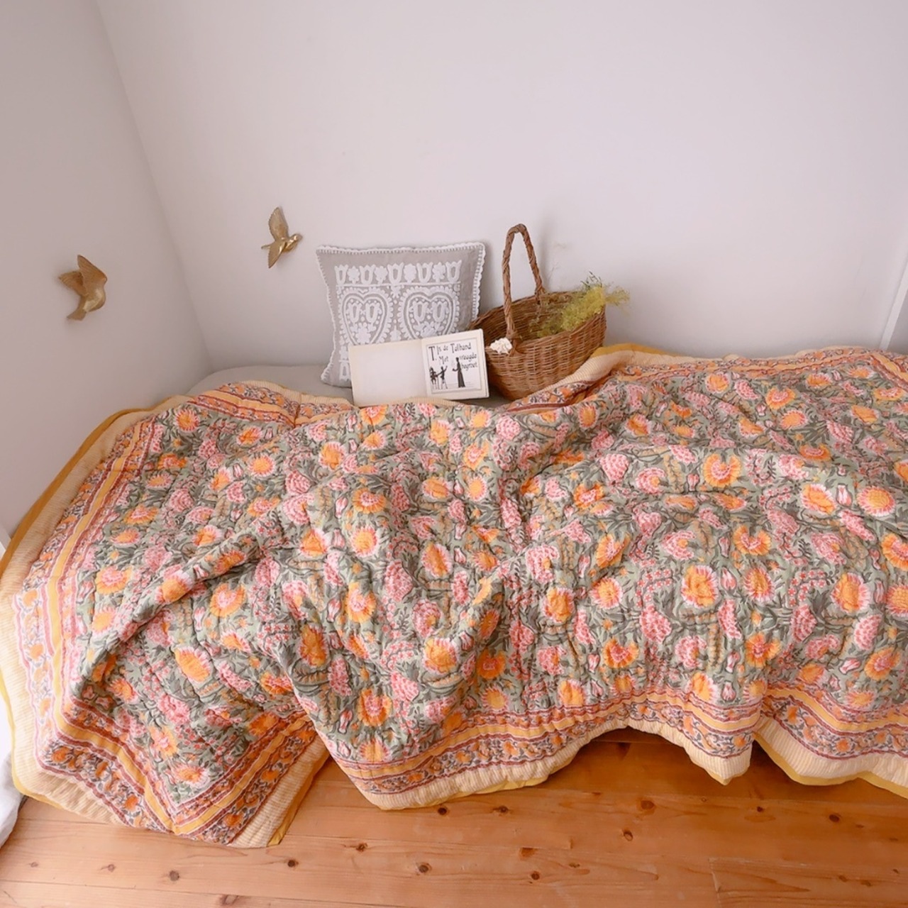 【予約販売】綿入り【M】イエローフラワー ブロックプリントキルト