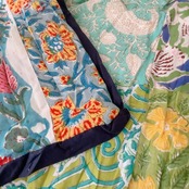 片面はブルーパープルなブロックプリントを集めたパッチワーク、もう片面はグリーン系のブロックプリント生地を集めたパッチワークの綿入りキルトです。