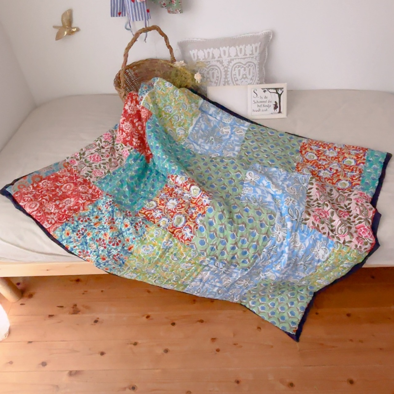 片面はカラフルなブロックプリントを集めたパッチワーク、もう片面はグリーン系のブロックプリント生地を集めたパッチワークの綿入りキルトです。