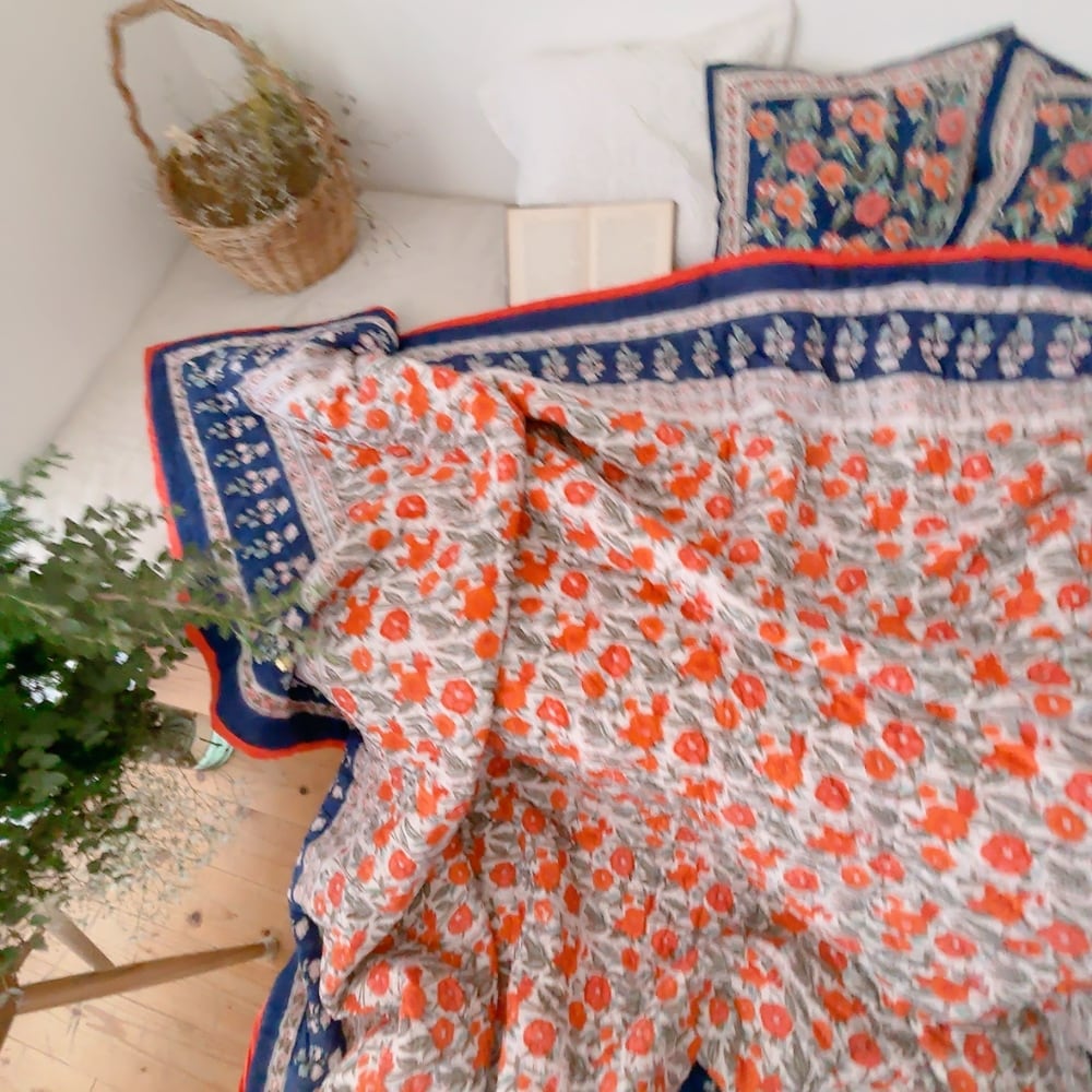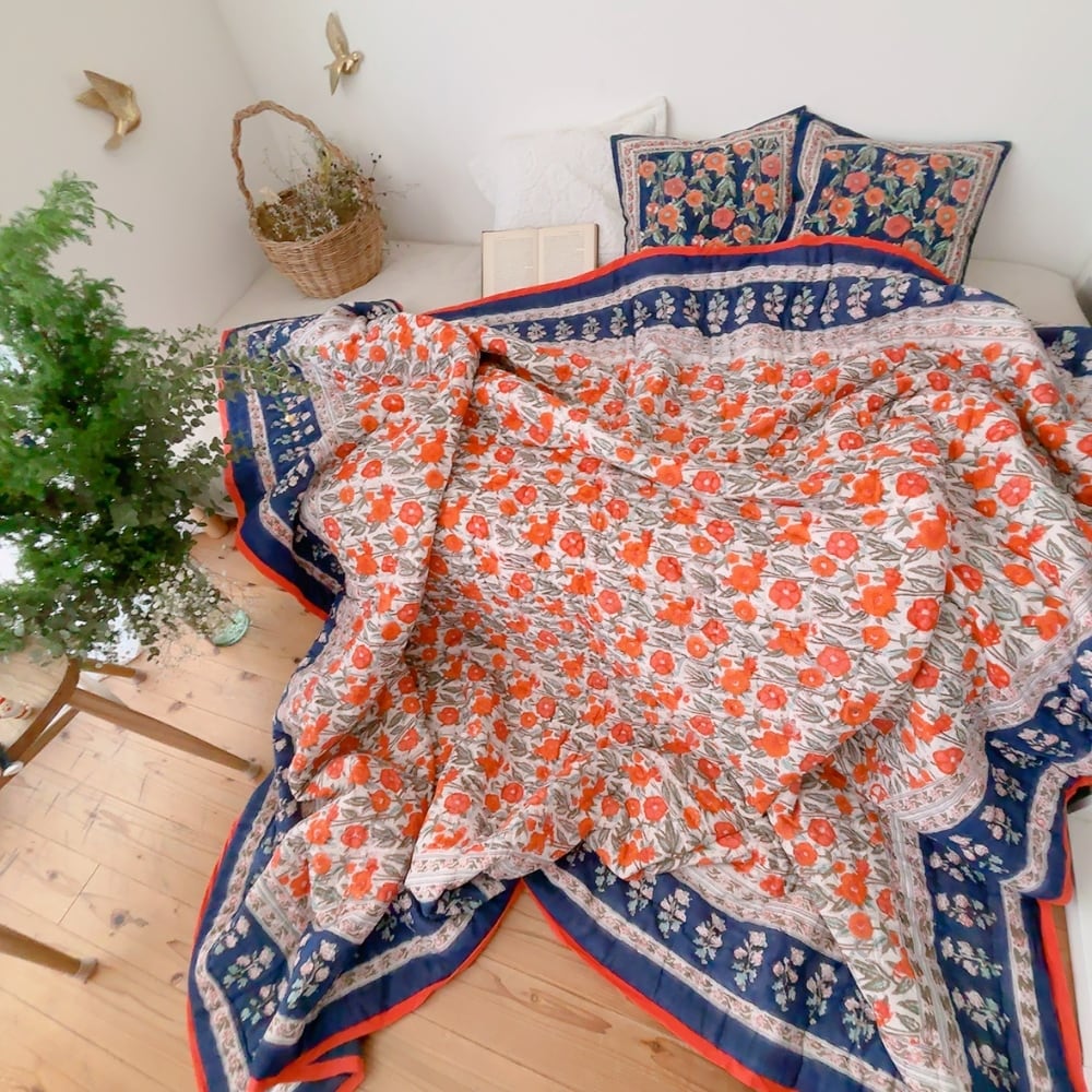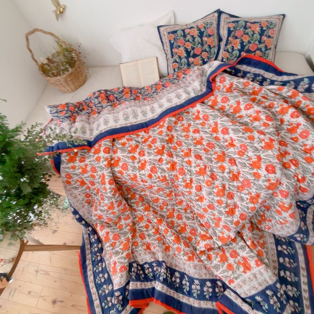 とても可愛らしいお花柄のブロックプリントの綿入りキルトです。