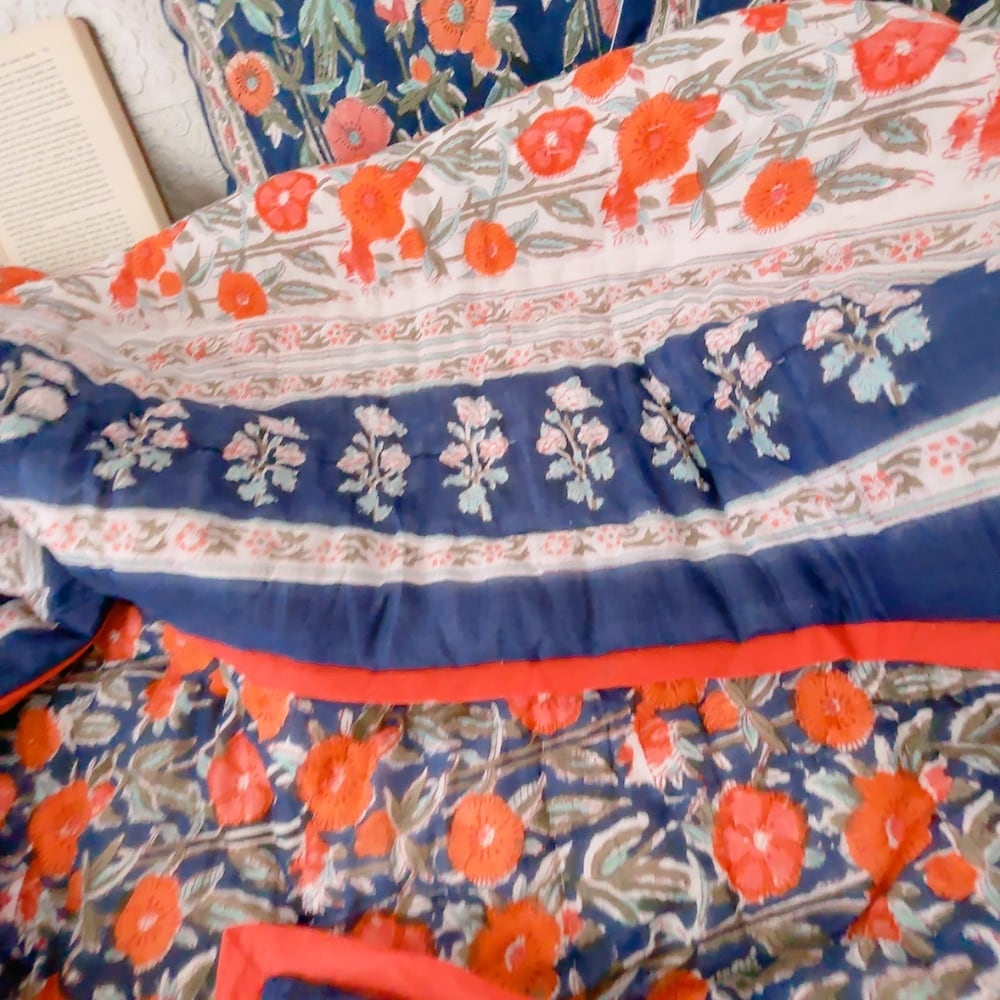 とても可愛らしいお花柄のブロックプリントの綿入りキルトです。