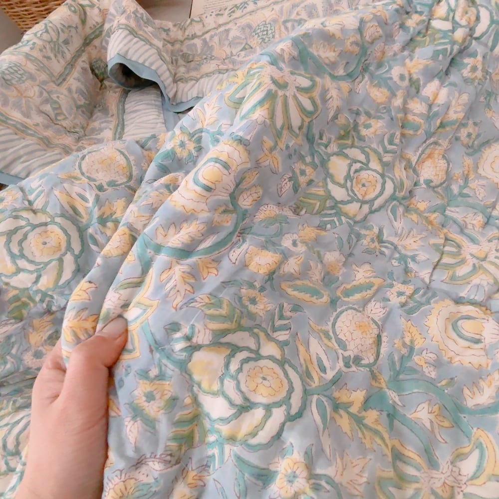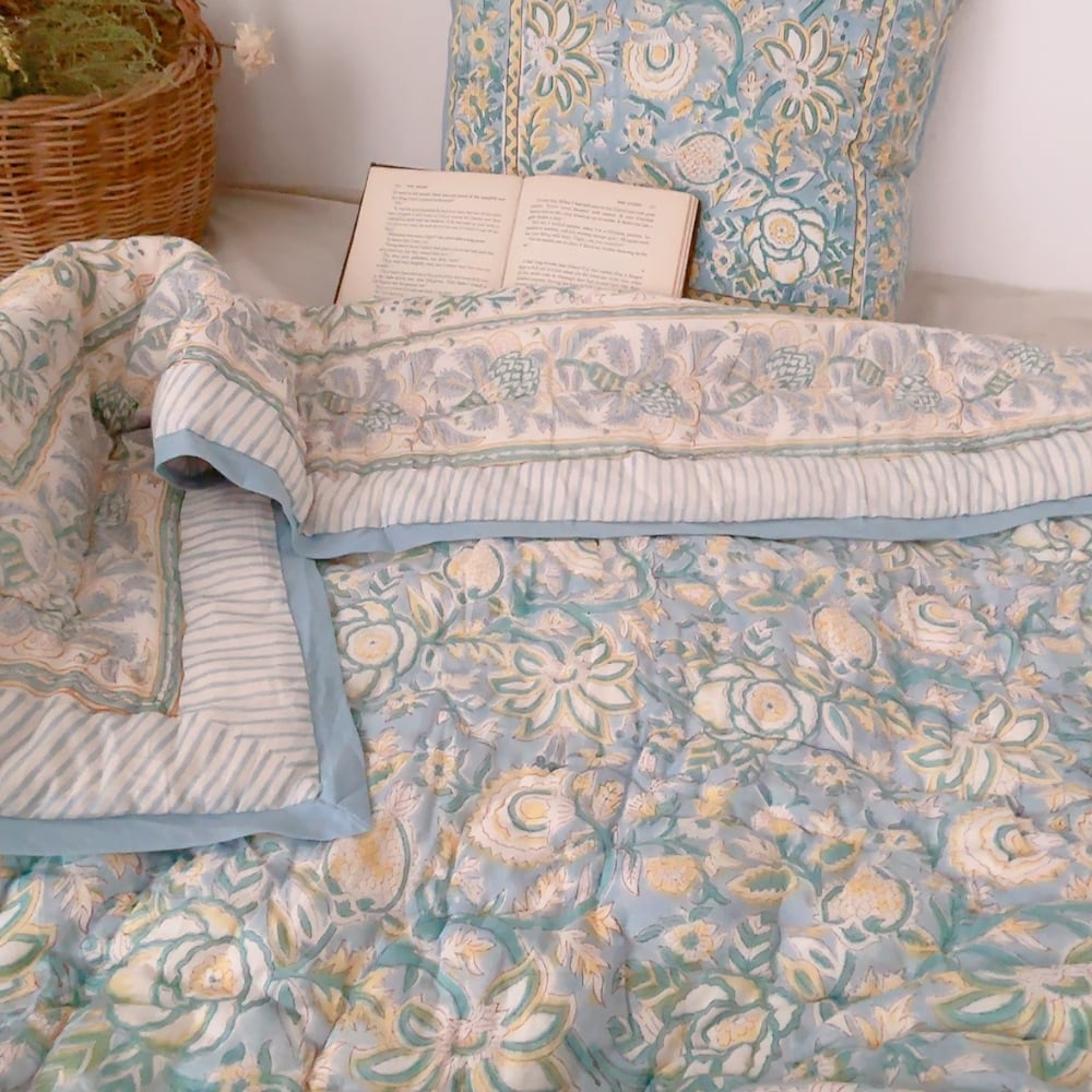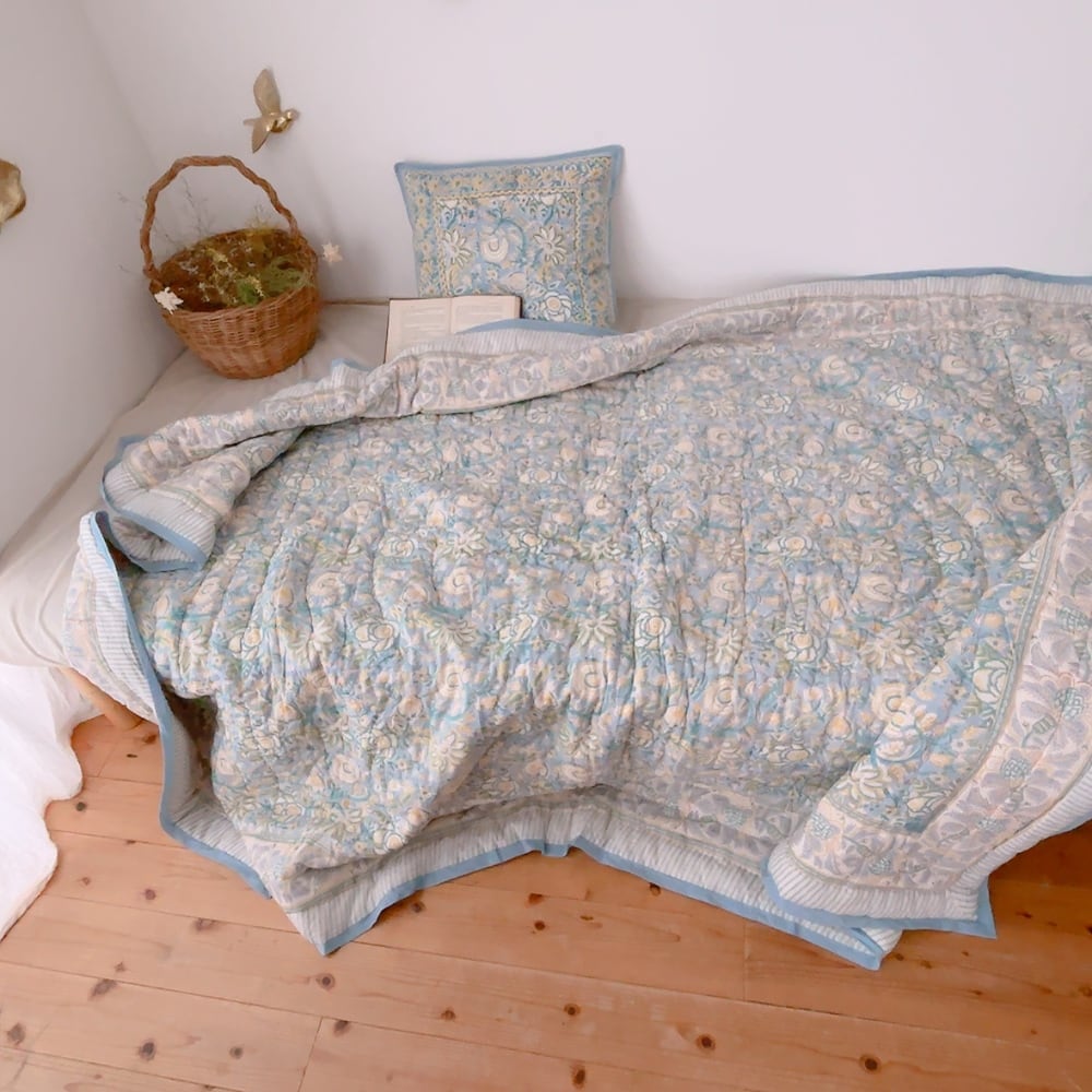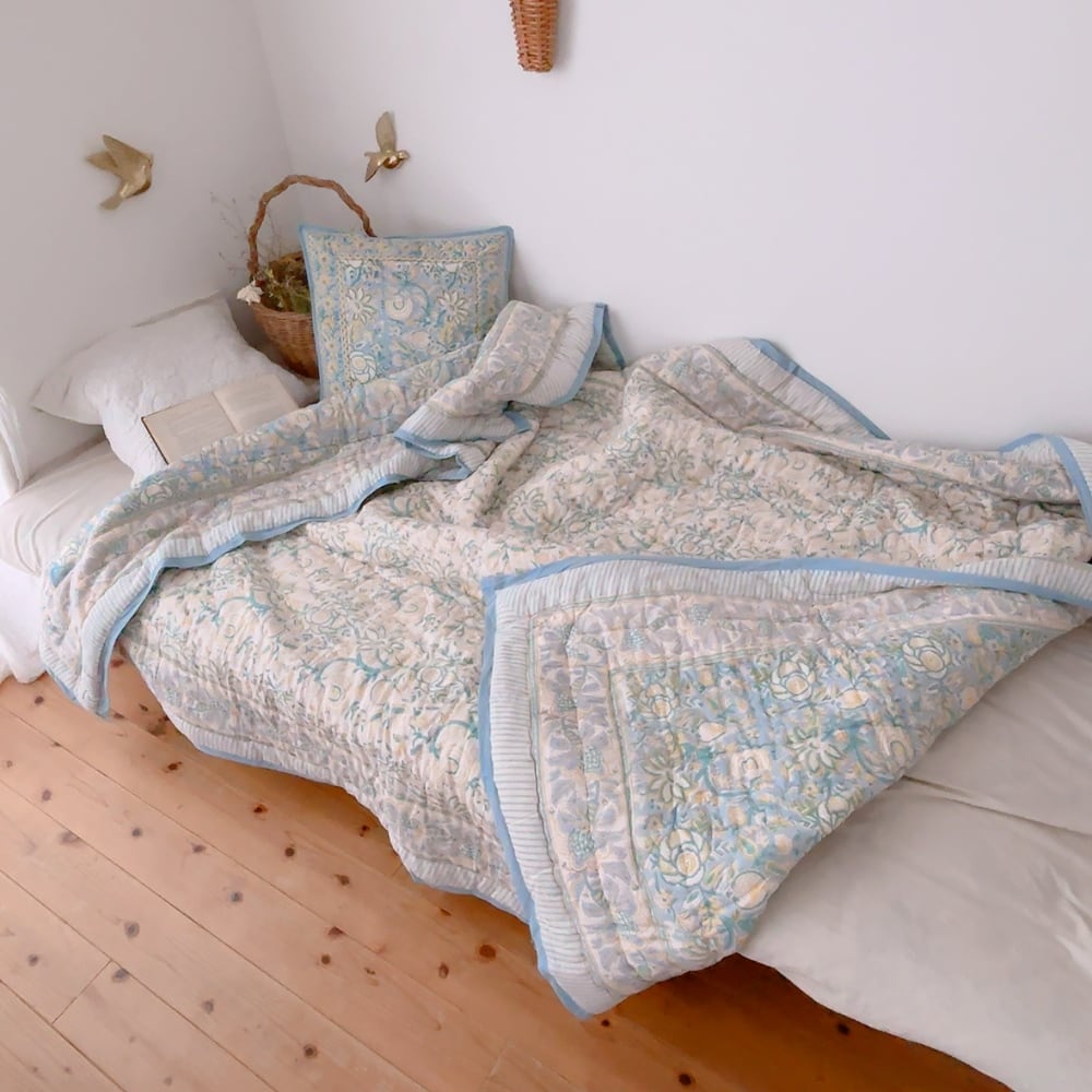 お花柄のブロックプリントの綿入りキルトです。