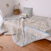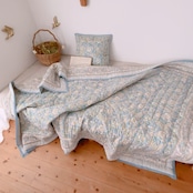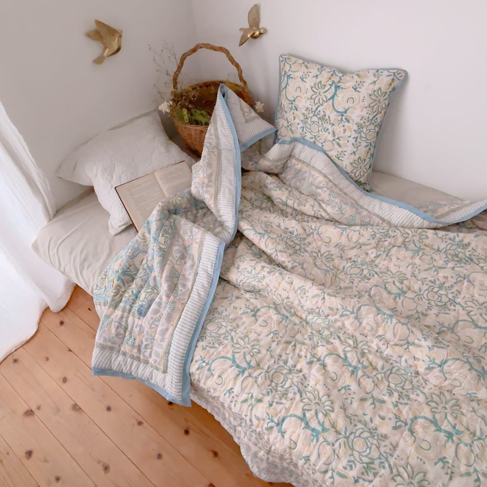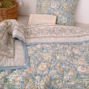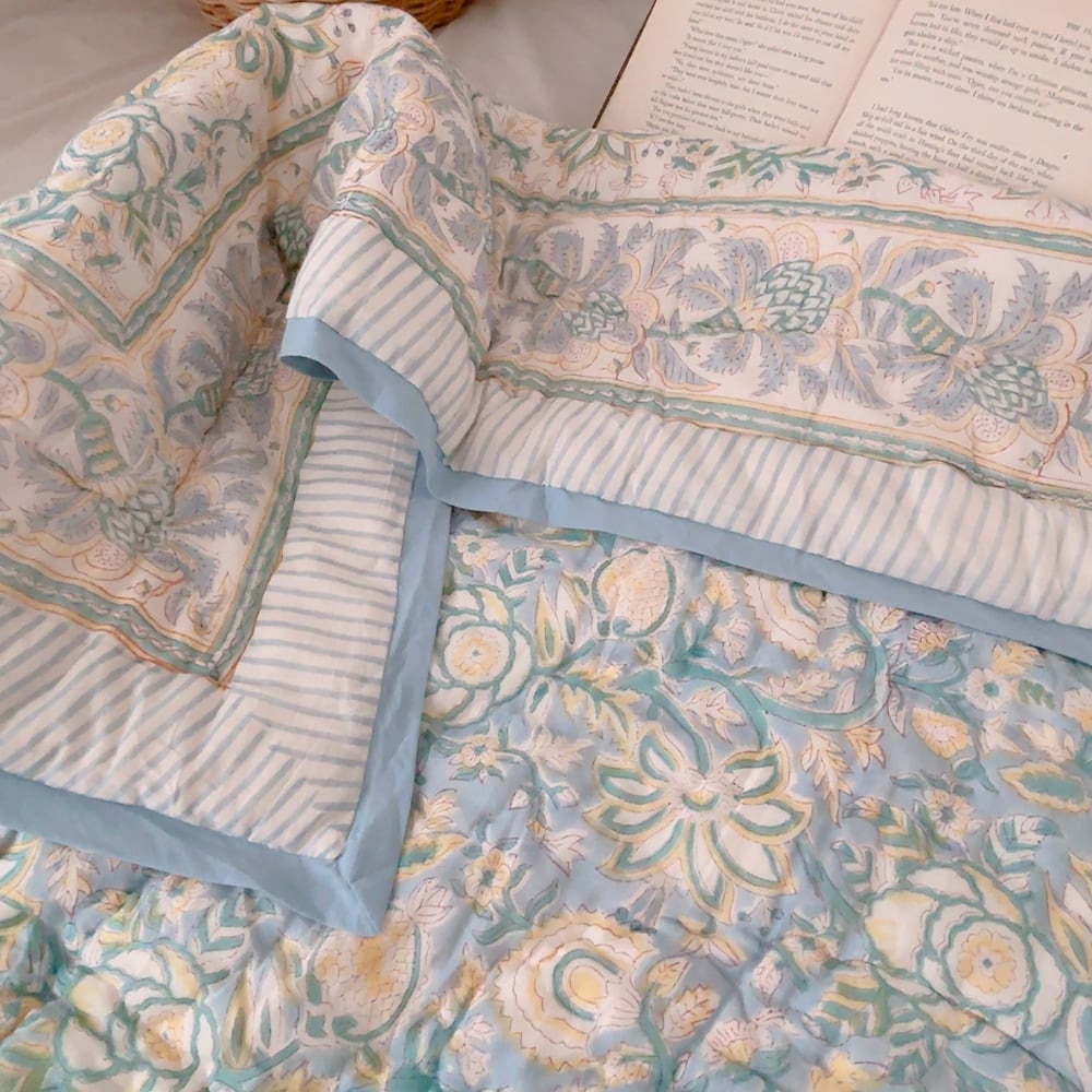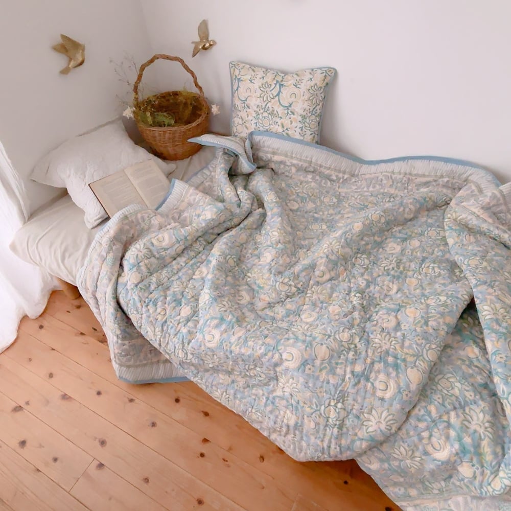 お花柄のブロックプリントの綿入りキルトです。