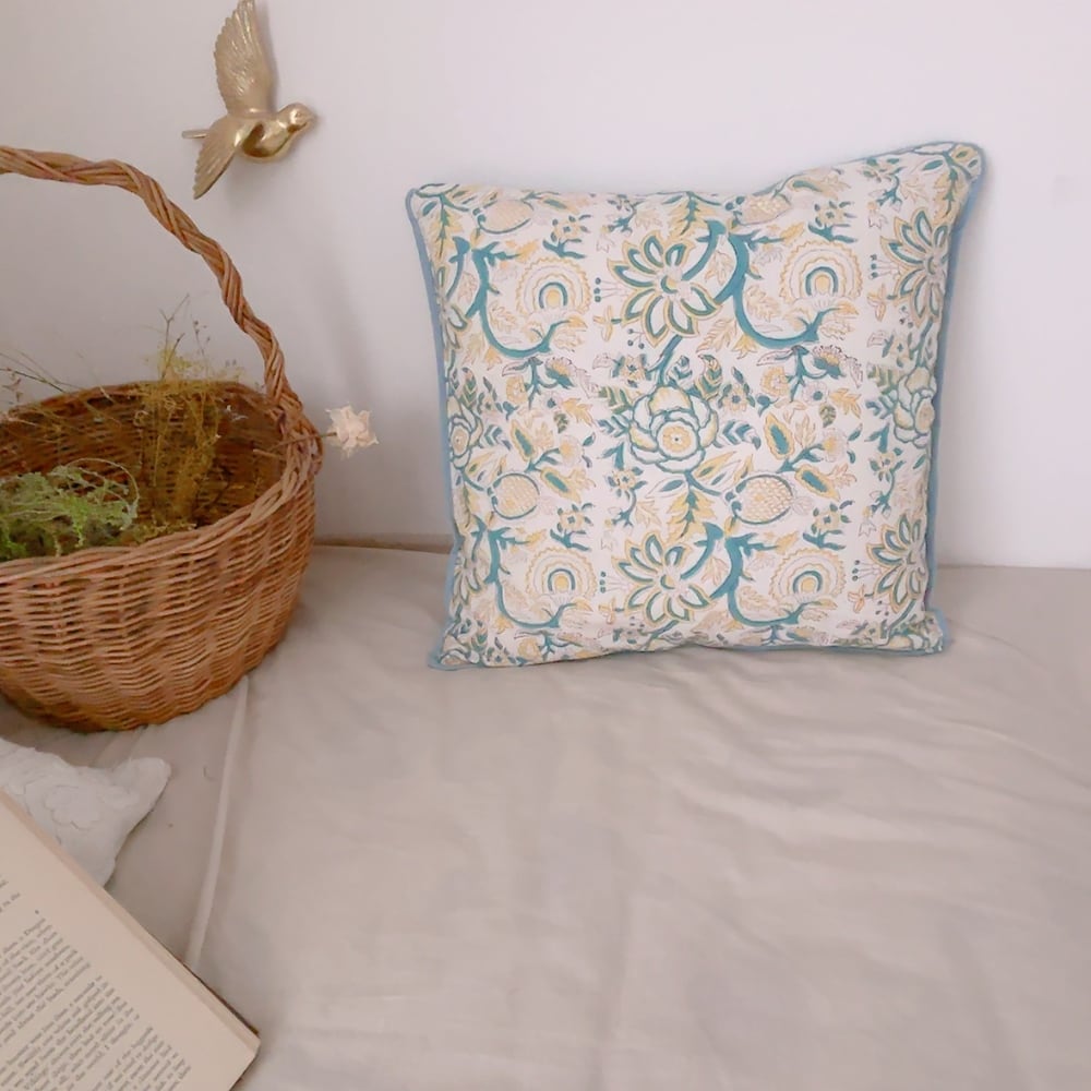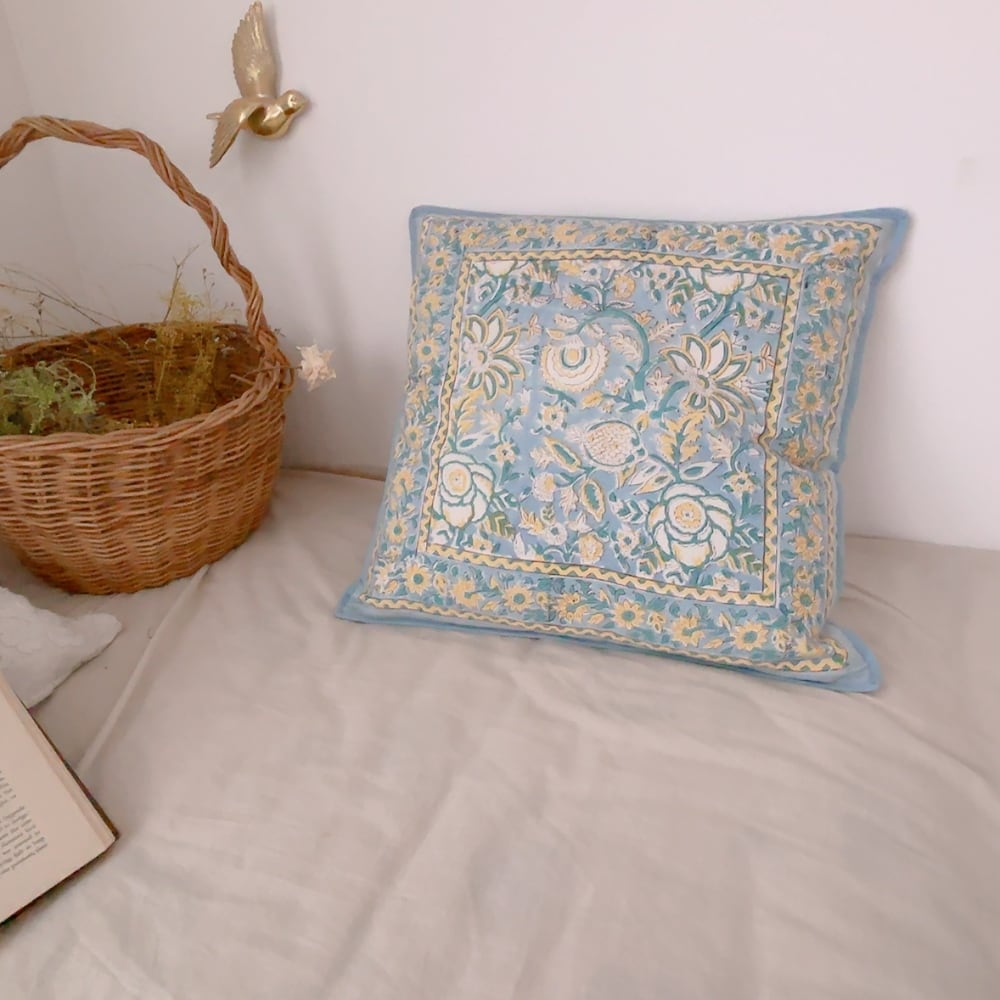 綿入り【M】クッションカバー付 ブルーフロレアル ブロックプリントキルト